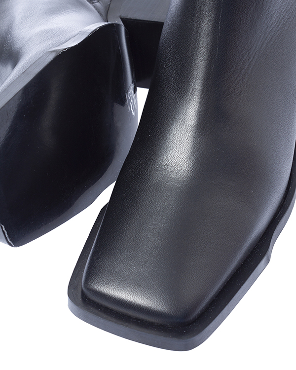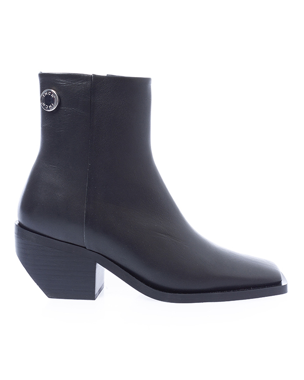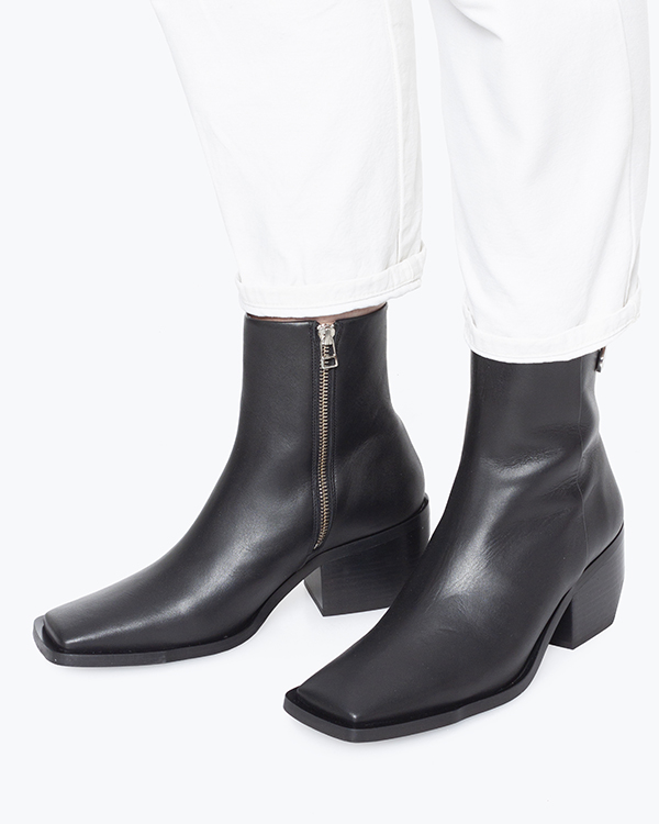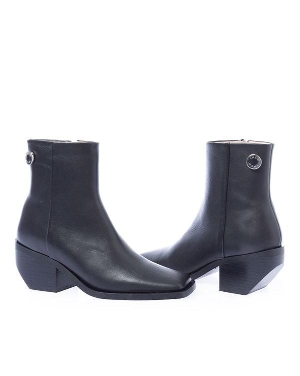 Ботильоны BOSTON из гладкой кожи черного цвета. Пара с застежкой на молнию с внутренней стороны. Обрубленный мыс, кубинский устойчивый наборный каблук.
