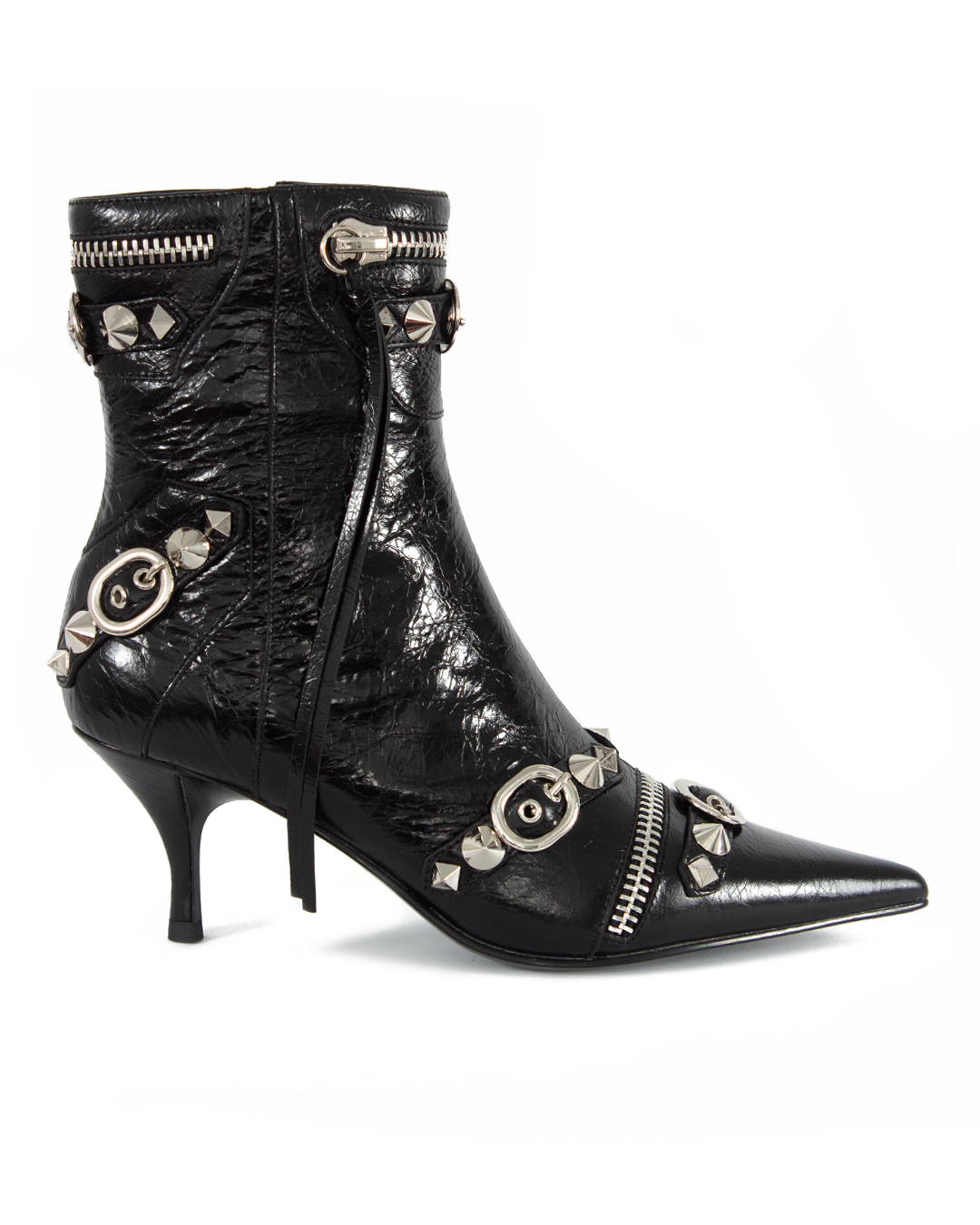 Ботильоны JEFFREY CAMPBELL из жатой кожи черного цвета с металлическими клепками. Пара с застежкой на молнию дополнена острым мысом и тонким невысоким каблуком.