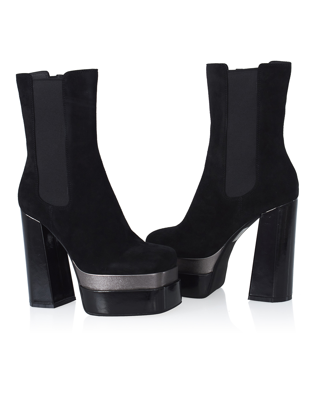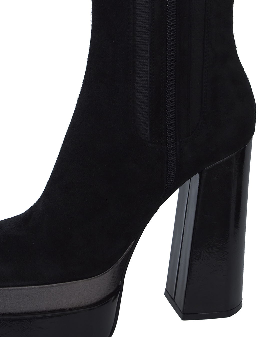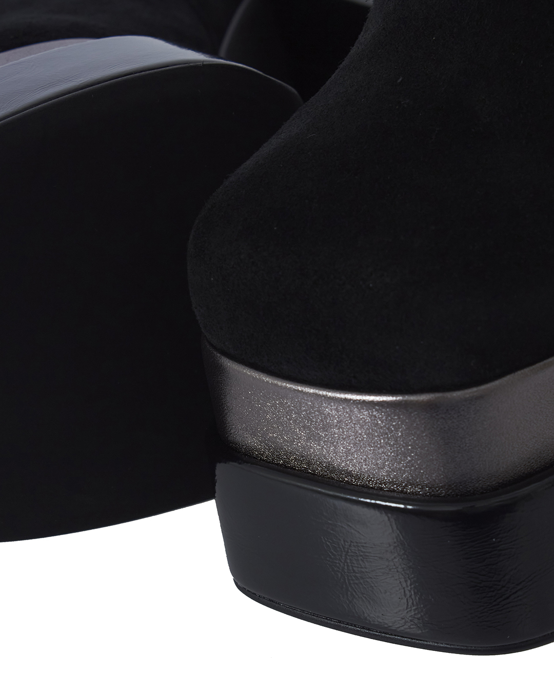 Замшевые ботильоны черного цвета с эластичными вставками по бокам. Пара на массивном граненом каблуке и компенсирующем его платформе.