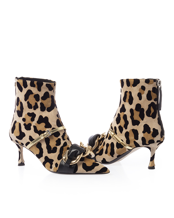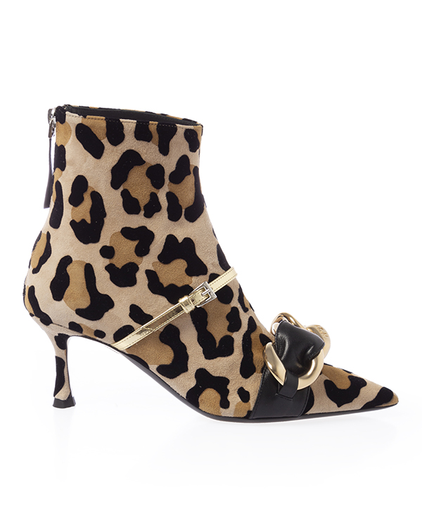 Ботильоны выполнены из замшевой кожи бежевого оттенка с леопардовым принтом. Утонченная пара с острым мысом, декорированным тонким кожаным ремешком и крупной цепью с гравировкой бренда. Обувь дополнена застежкой на молнию на пятке и невысоким каблуком-рюмочкой.
