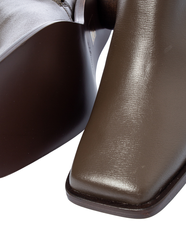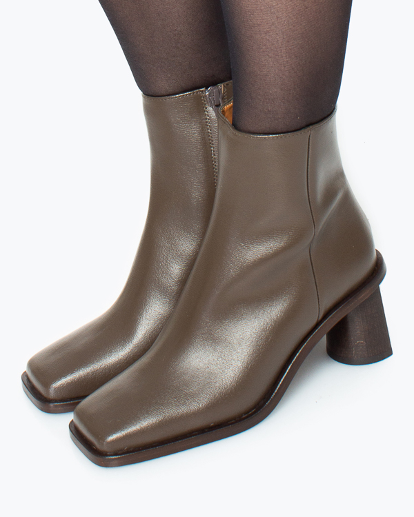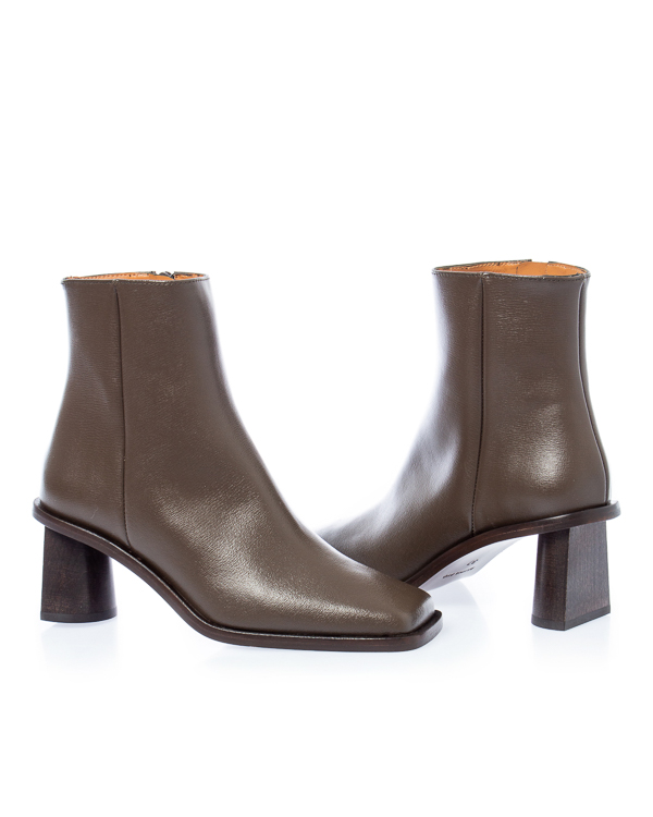 Ботильоны из мягкой натуральной кожи серо-коричневого оттенка. Пара в архитектурном стиле с графичным деревянным каблуком. Ботильоны с застежкой на молнию с внутренней стороны.