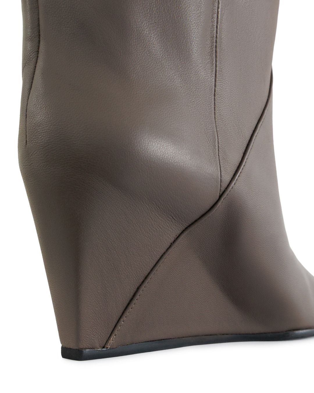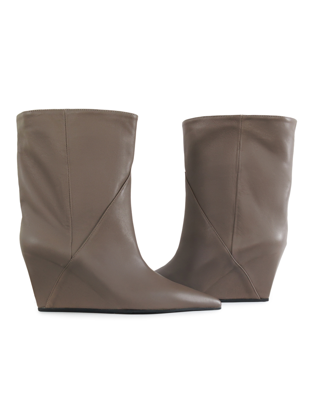 Эти ботильоны воплощают в себе смелое сочетание современного минимализма и элегантной геометрии. Выполненные из гладкой натуральной кожи, они имеют насыщенный кофейный оттенок, который добавляет эксклюзивности и подчеркивает изысканность дизайна. Основной акцент сделан на изящную форму танкетки, что придаёт обуви оригинальность и обеспечивает комфорт на протяжении всего дня. Форма мыска удлиненная и острая, добавляющая динамику и изысканность силуэту. Особое внимание привлекает декоративный шов, подчеркивающий архитектурные линии и добавляющий обуви изюминку. Это решение создаёт визуальный эффект многослойности и придаёт модели дополнительный шарм. Ботильоны идеально дополнят как повседневные, так и вечерние наряды, становясь ярким элементом любого образа. Они легко комбинируются с узкими брюками, юбками и платьями, добавляя образу нотку современности и изящества. Эта пара станет центральной частью вашего гардероба, привнося в него актуальные модные акценты.