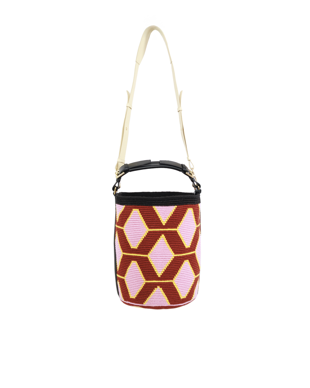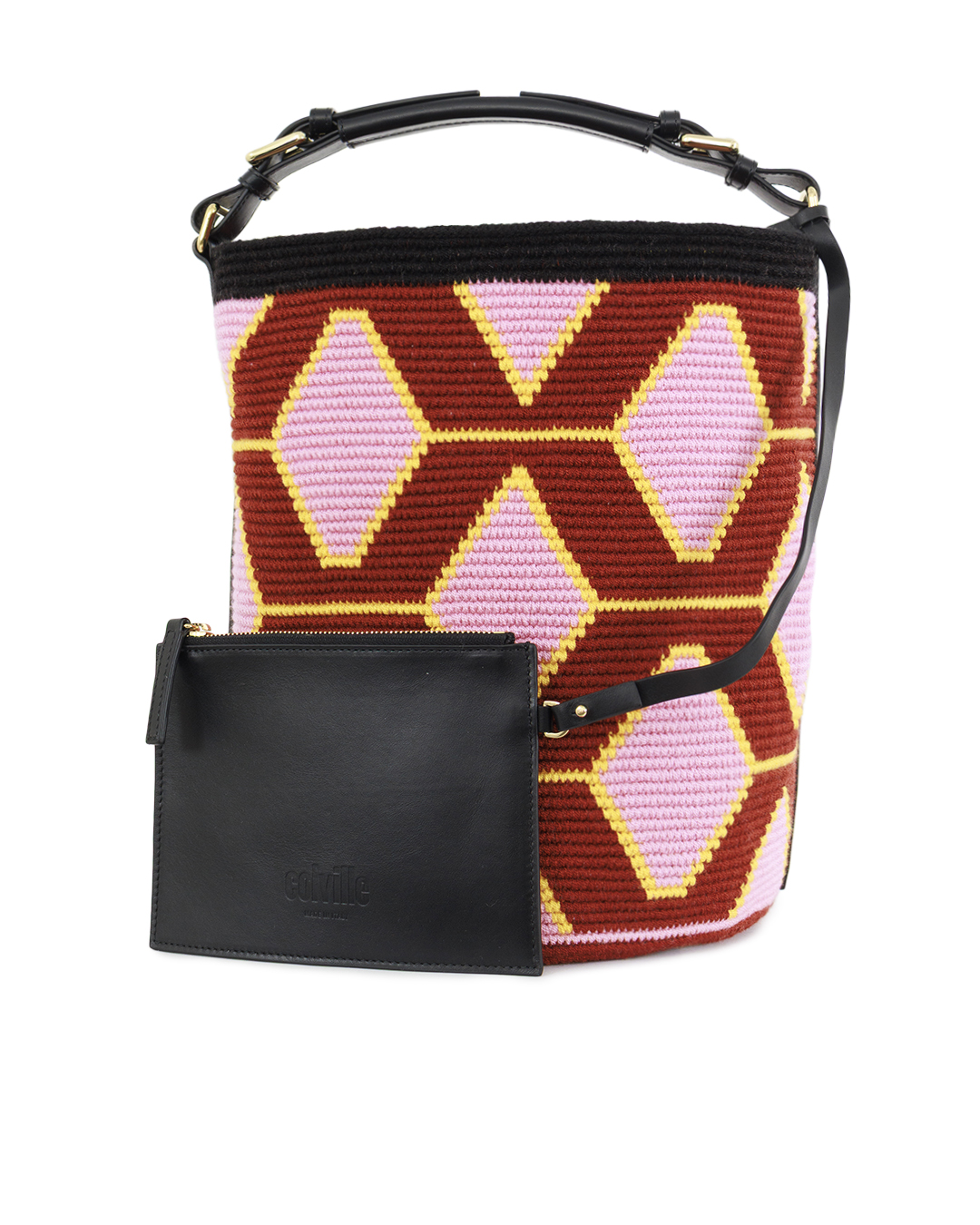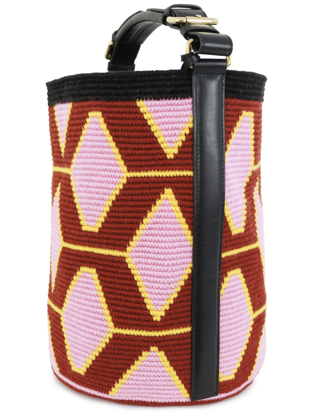 Коричневая плетеная сумка с контрастным принтом выполнена из хлопка с отделкой из натуральной кожи. Съёмная верхняя ручка и регулируемый ремень на плечо. Съёмный карман-мешочек. В комплект входит мешок-пыльник для хранения.