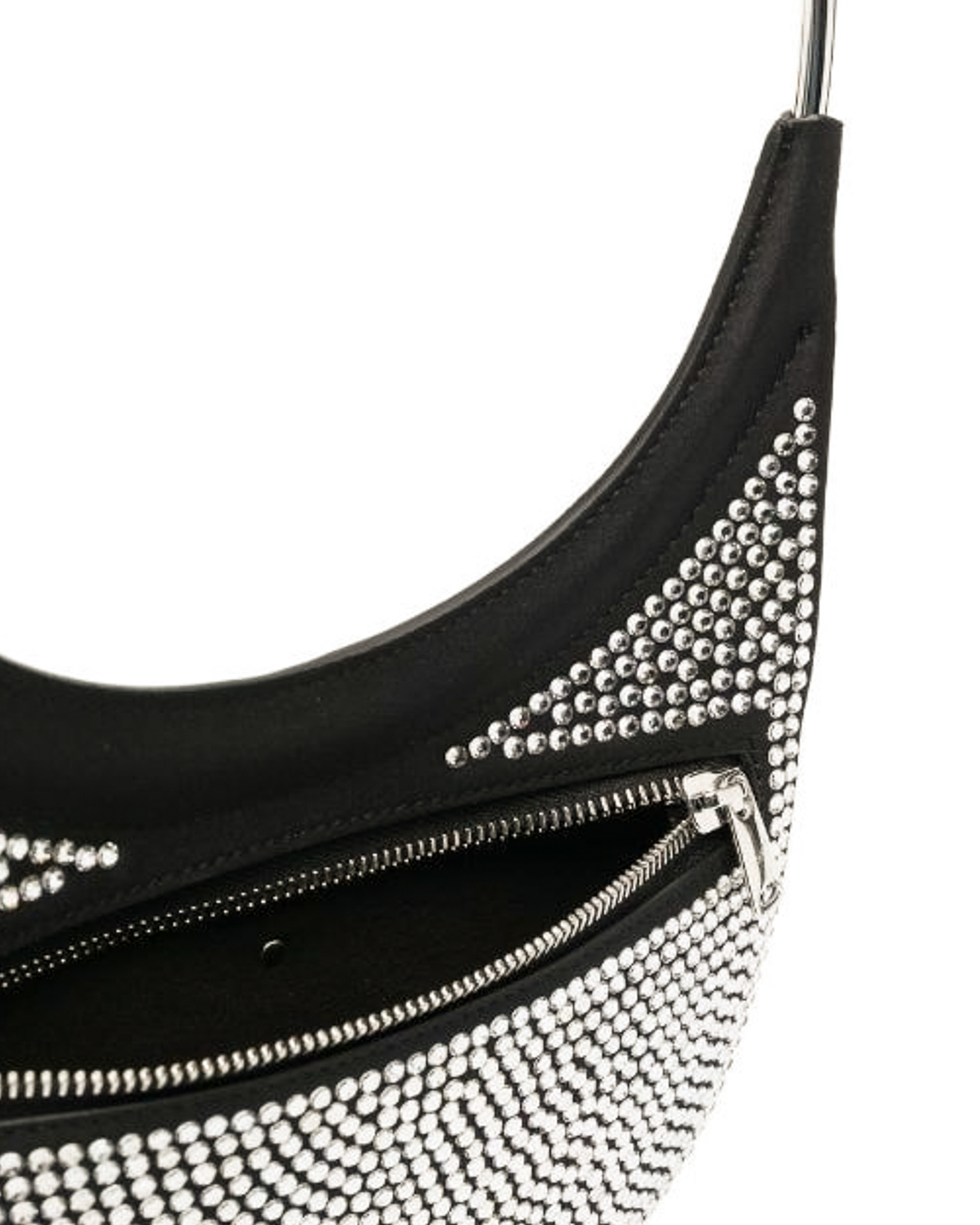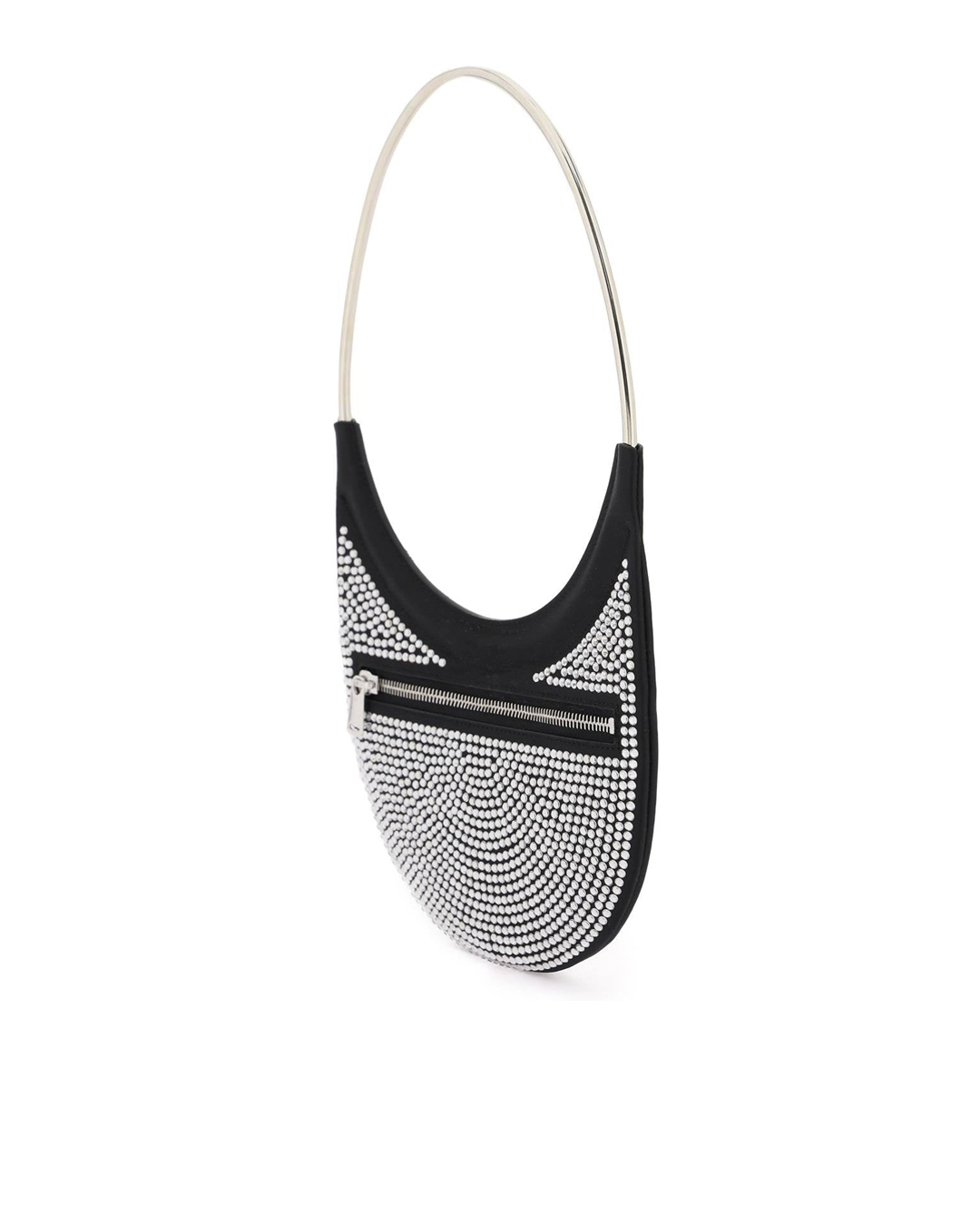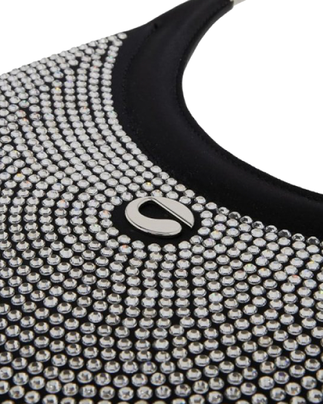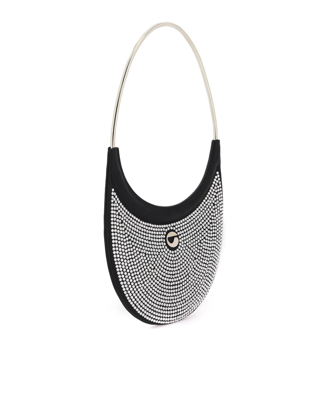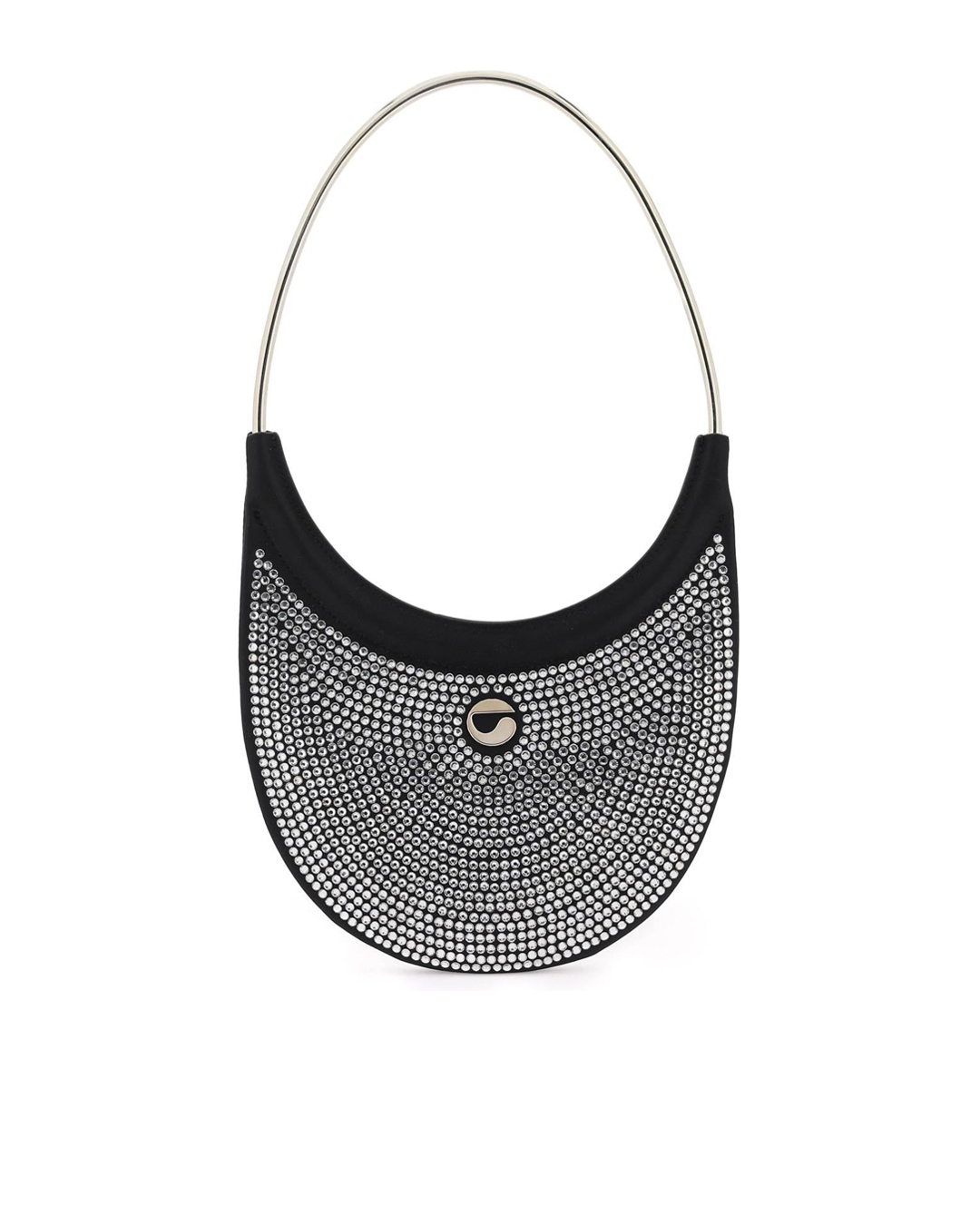 Сумка COPERNI из текстиля с логотипом бренда и отделкой блестящими кристаллами. Модель плоской формы с основным отделом и круглой металлической ручкой.