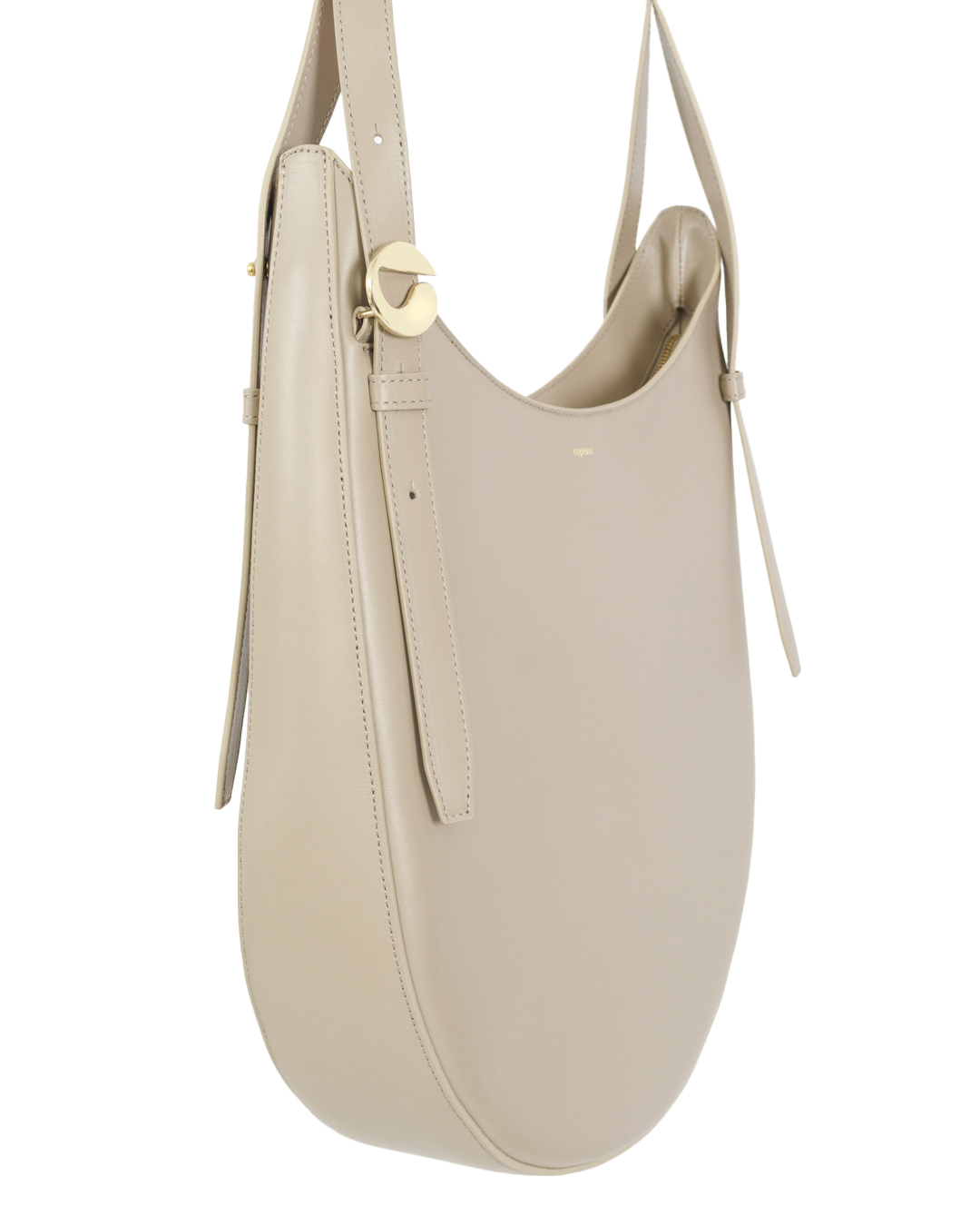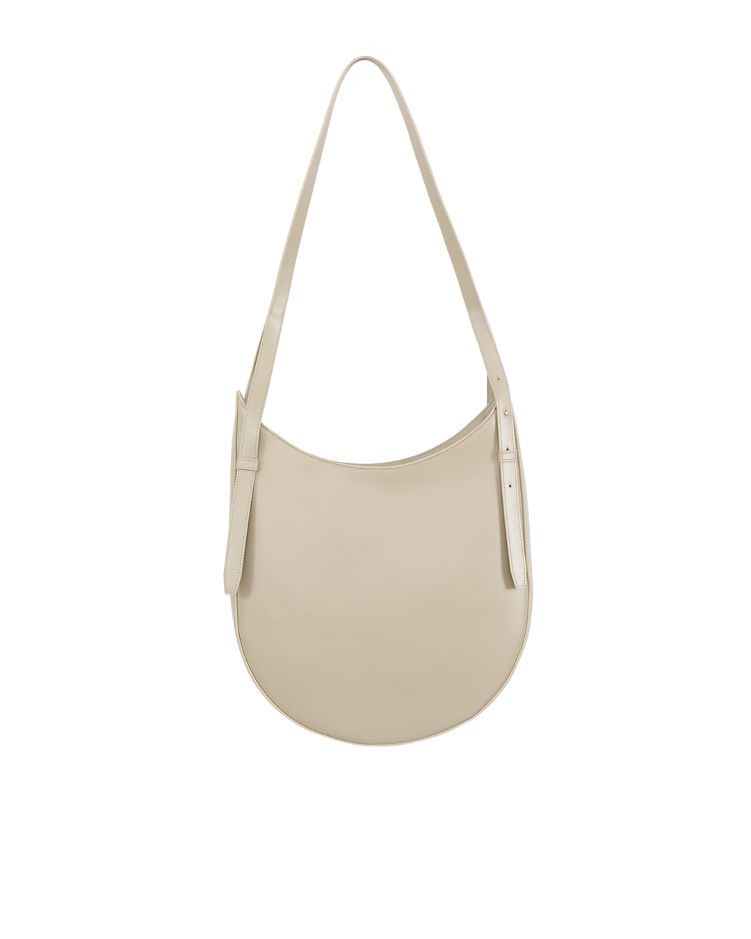 Изготовленная из кожи бежевого кремового оттенка, сумка Hobo имеет глубокую округлую форму, похожую на удлиненный полумесяц, что делает ее идеальным повседневным аксессуаром. Сумка имеет тонкие ремни, которые перетекают в силуэт с обеих сторон, спереди и сзади, добавляя динамичный штрих этому в остальном минималистичному дизайну.