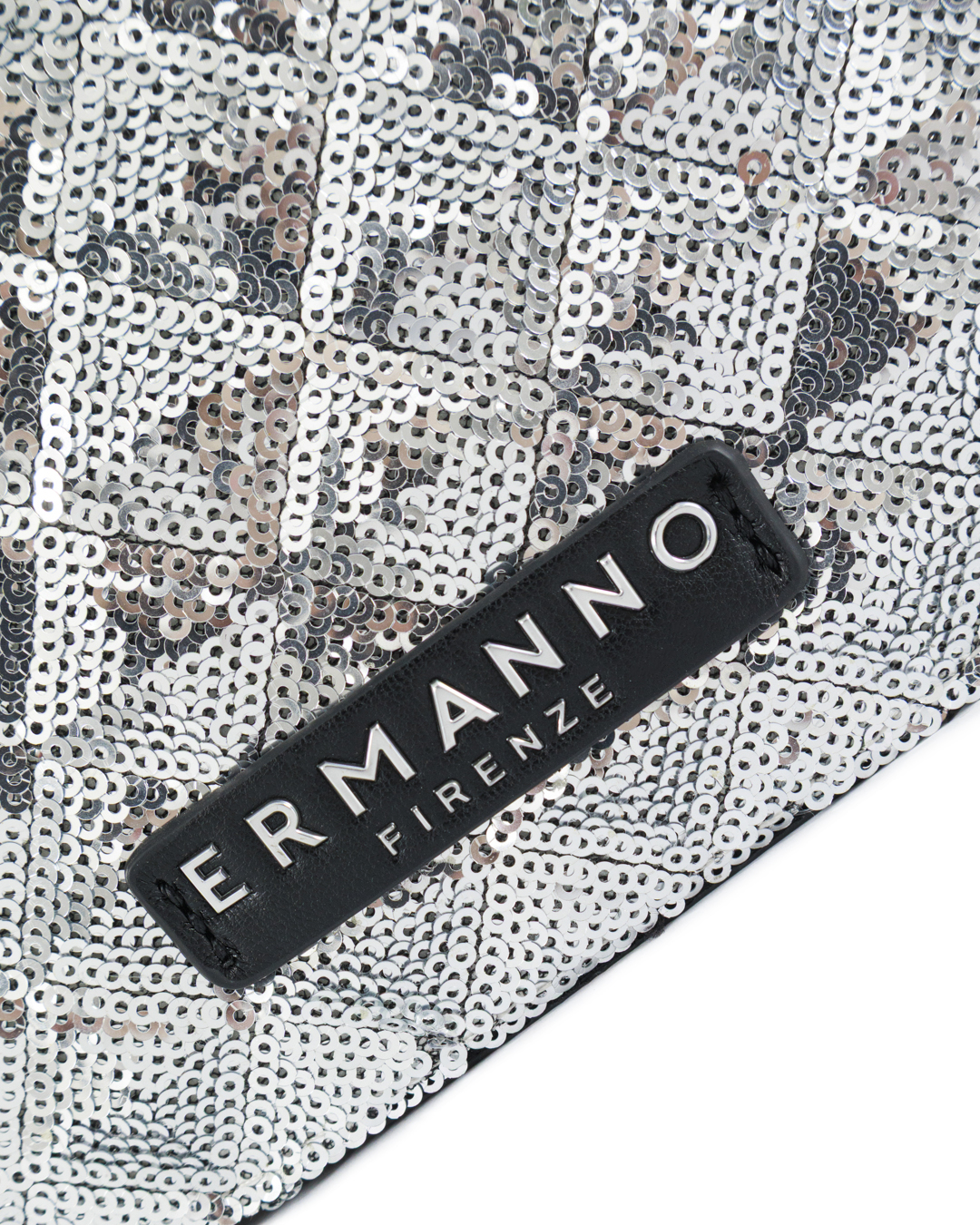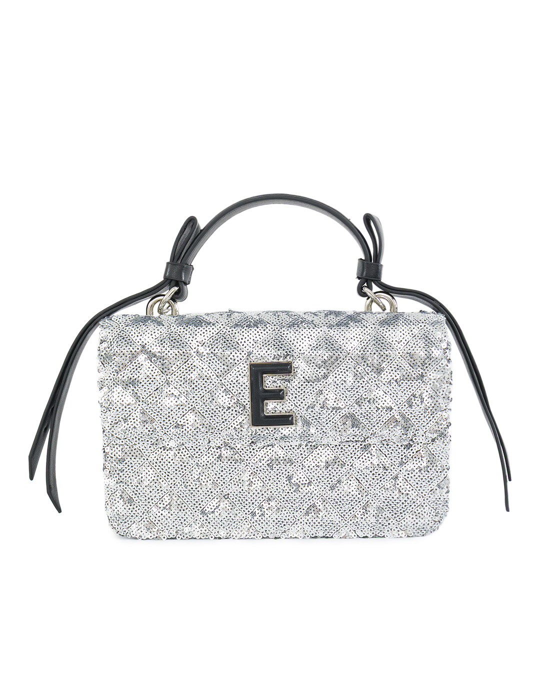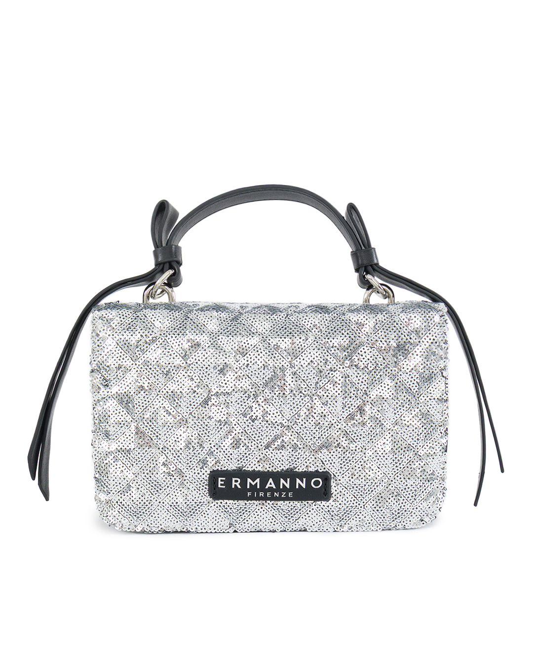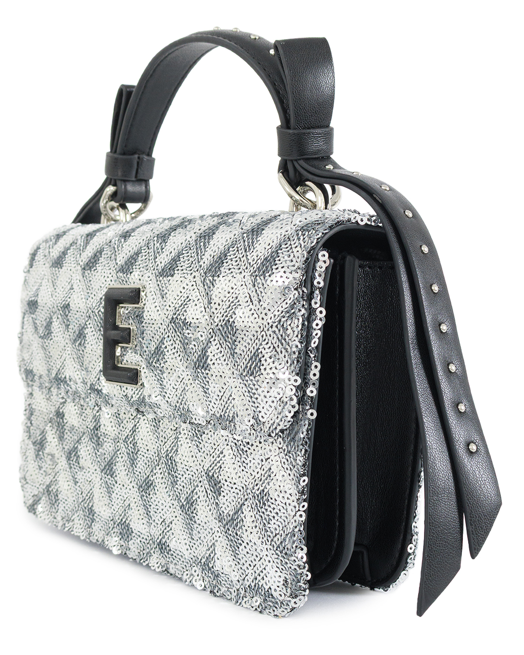 Мини-сумка с геометрической вышивкой пайетками. Откидной клапан, ручка из искусственной кожи с заклепками и длинные шнурки. Логотип обтянут эко-кожей, имеется съемный плечевой ремень-цепочка. Размеры: 20,5х13х5 см.
