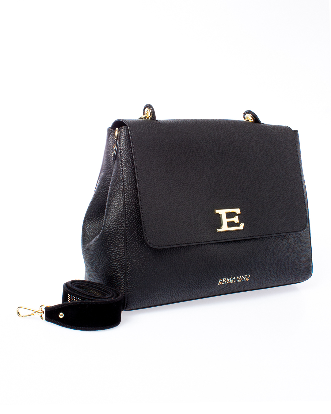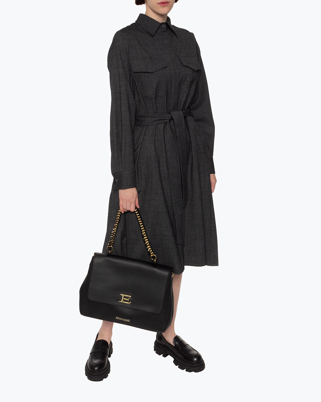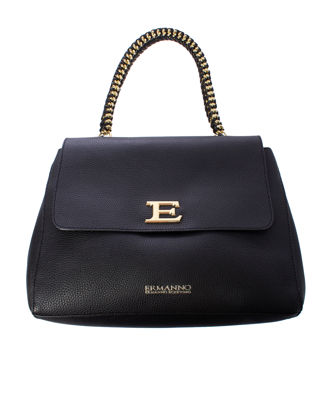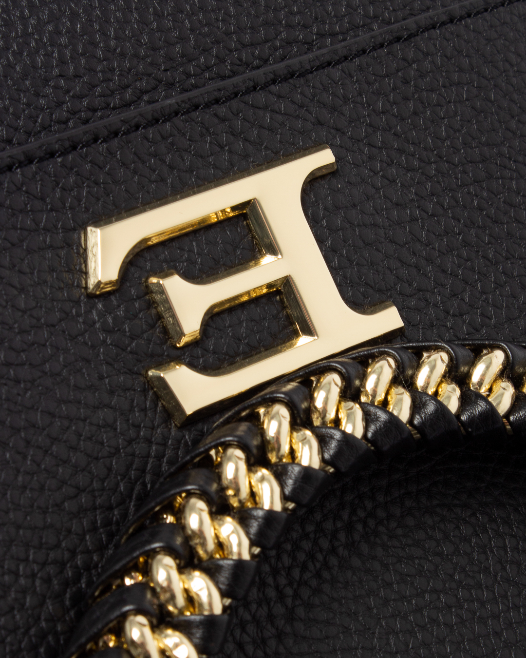 Сумка из шагреневой экокожи с логотипом бренда. Изделие с основным отделом с застежкой на клапан с металлической символикой марки. Сумка дополнена удобной ручкой в виде металлической цепочки с кожаным переплетением и съемным плечевым ремнем регулируемой длины на карабинах.