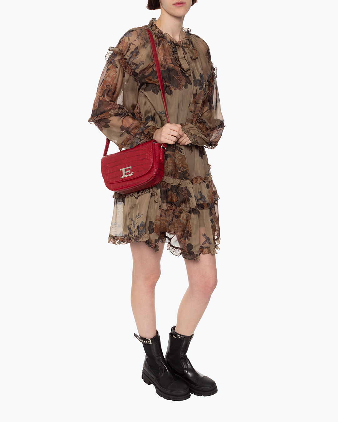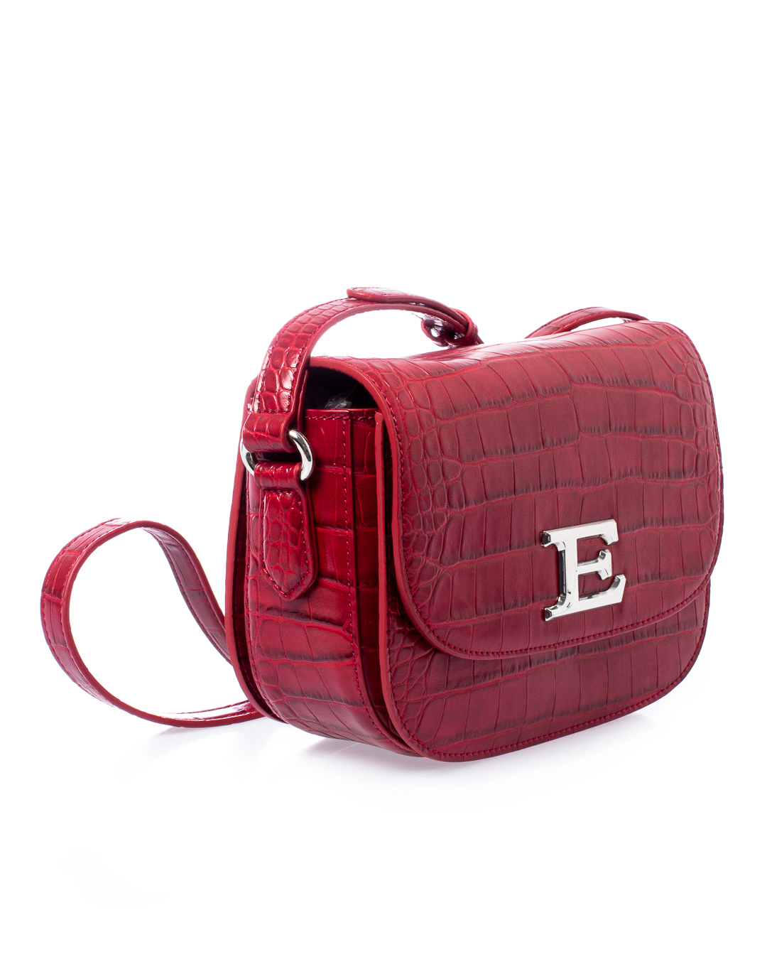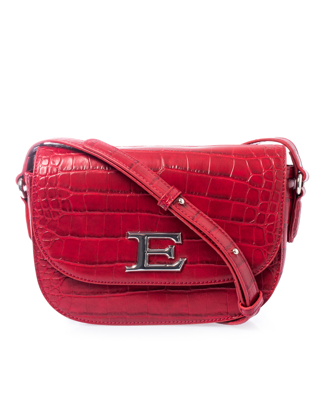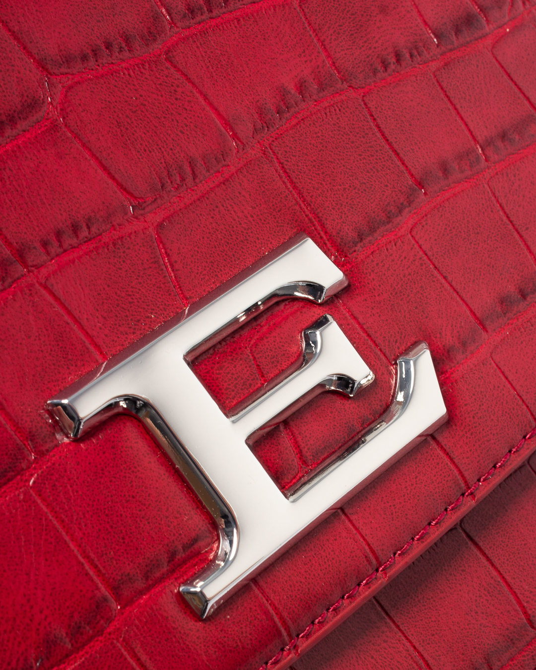 Сумка из плотной экокожи красного цвета с фактурой под рептилию. Изделие с вместительным основным отделом дополнено застежкой на клапан с металлическим логотипом бренда. Сумка с плечевым ремнем регулируемой длины.