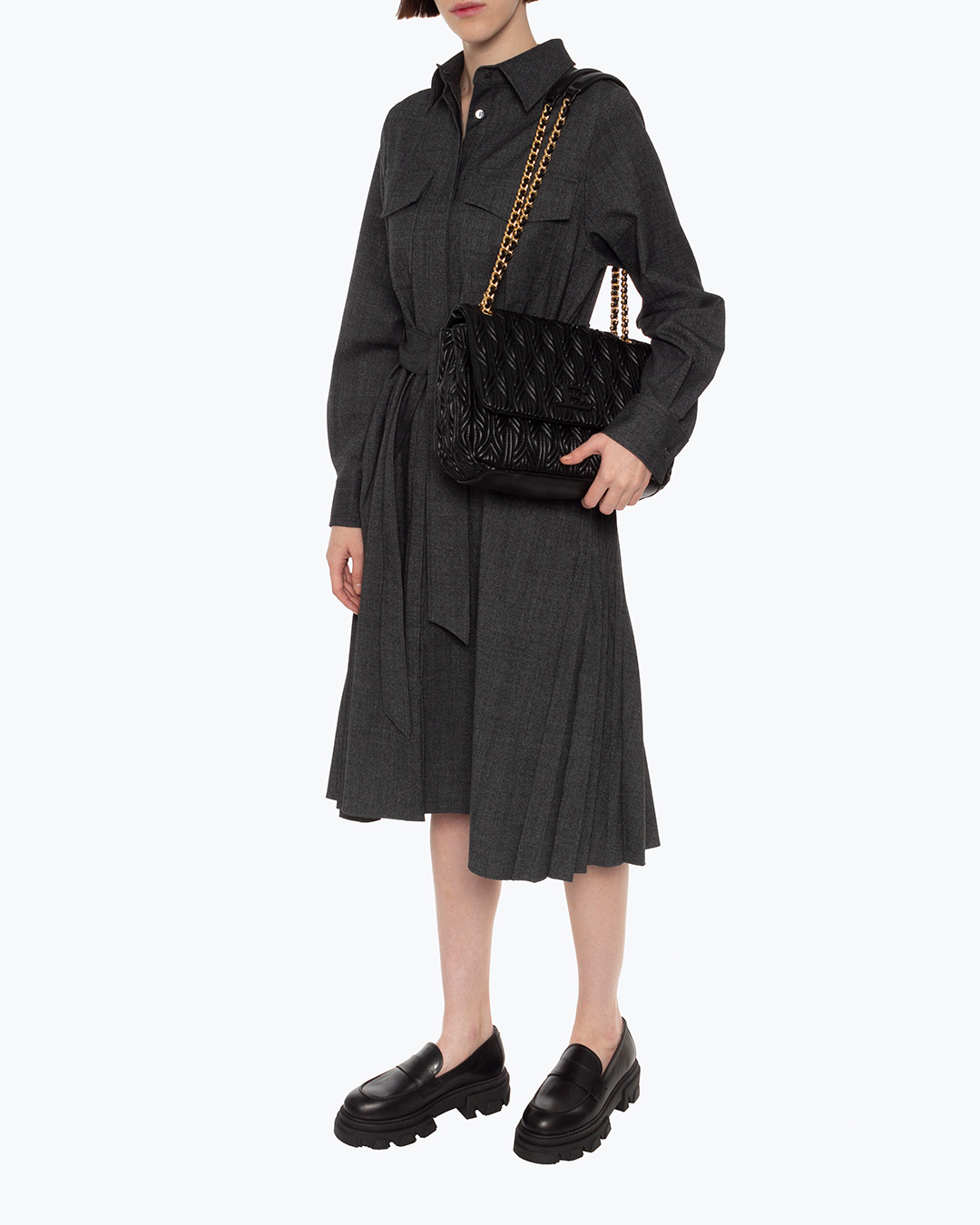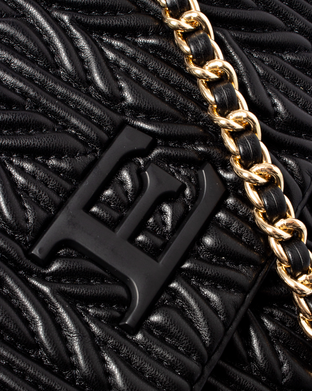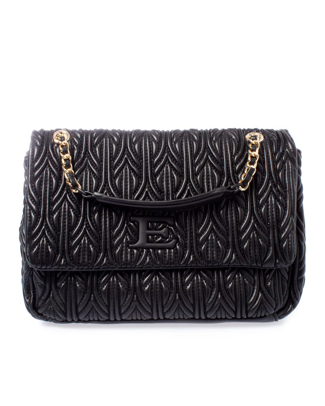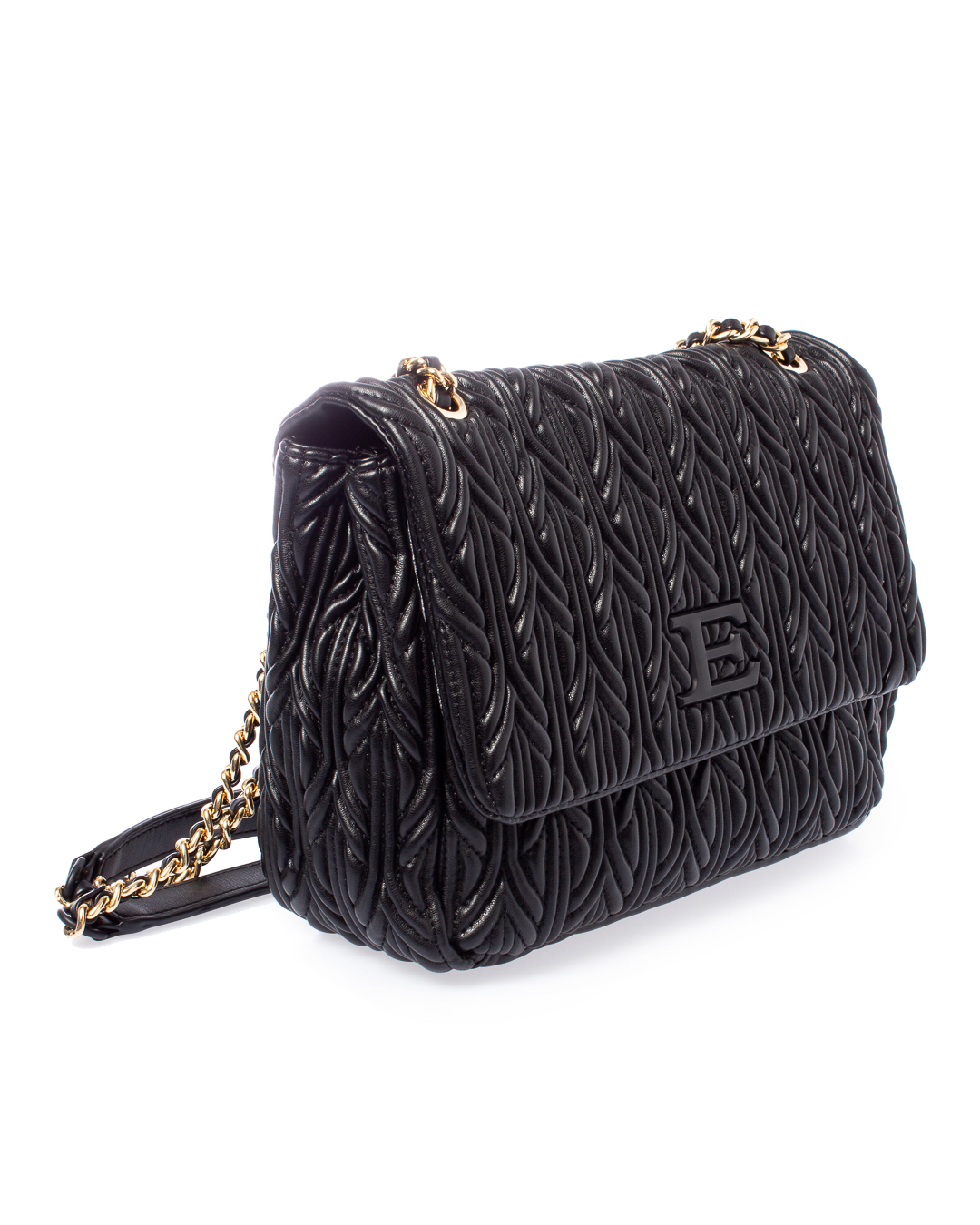 Сумка из фактурной мягкой экокожи черного цвета. Изделие с основным отделом с застежкой на клапан с логотипом бренда. Сумка дополнена подвижными ручками в виде металлической цепочки.