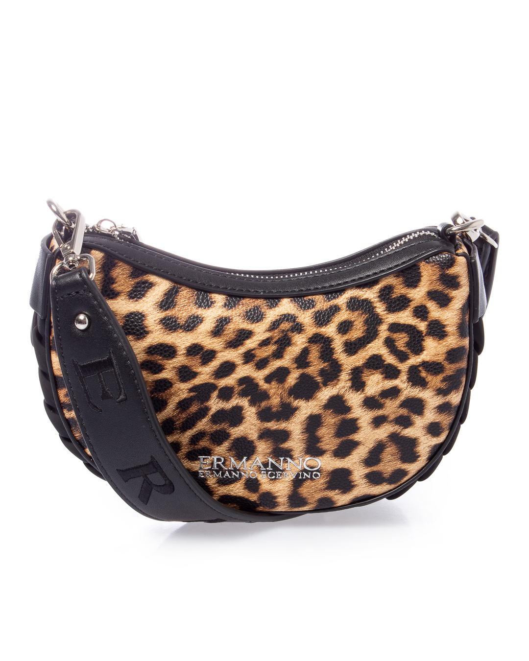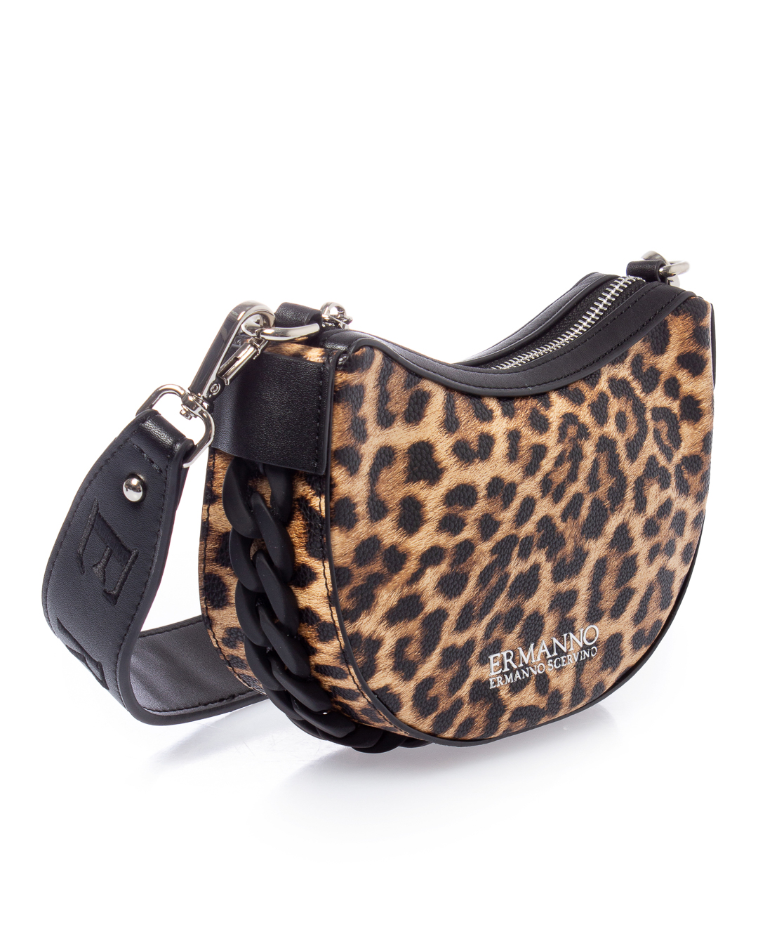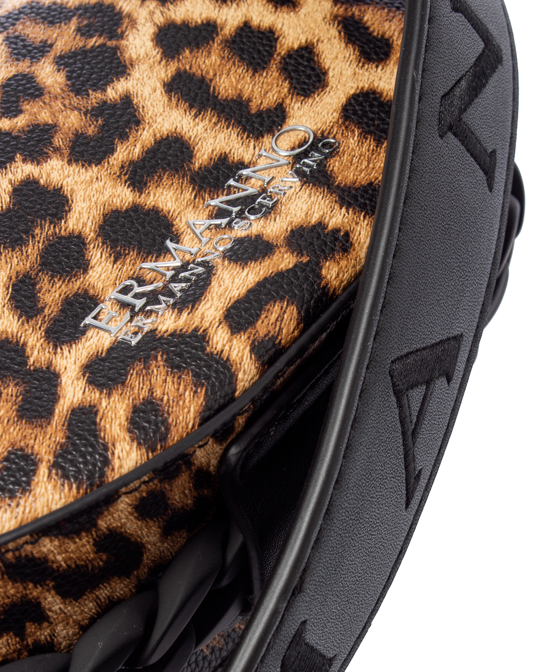 Сумка из экокожи с леопардовым принтом и логотипом бренда. Изделие с основным отделом на молнии дополнено широкой съемной ручкой.