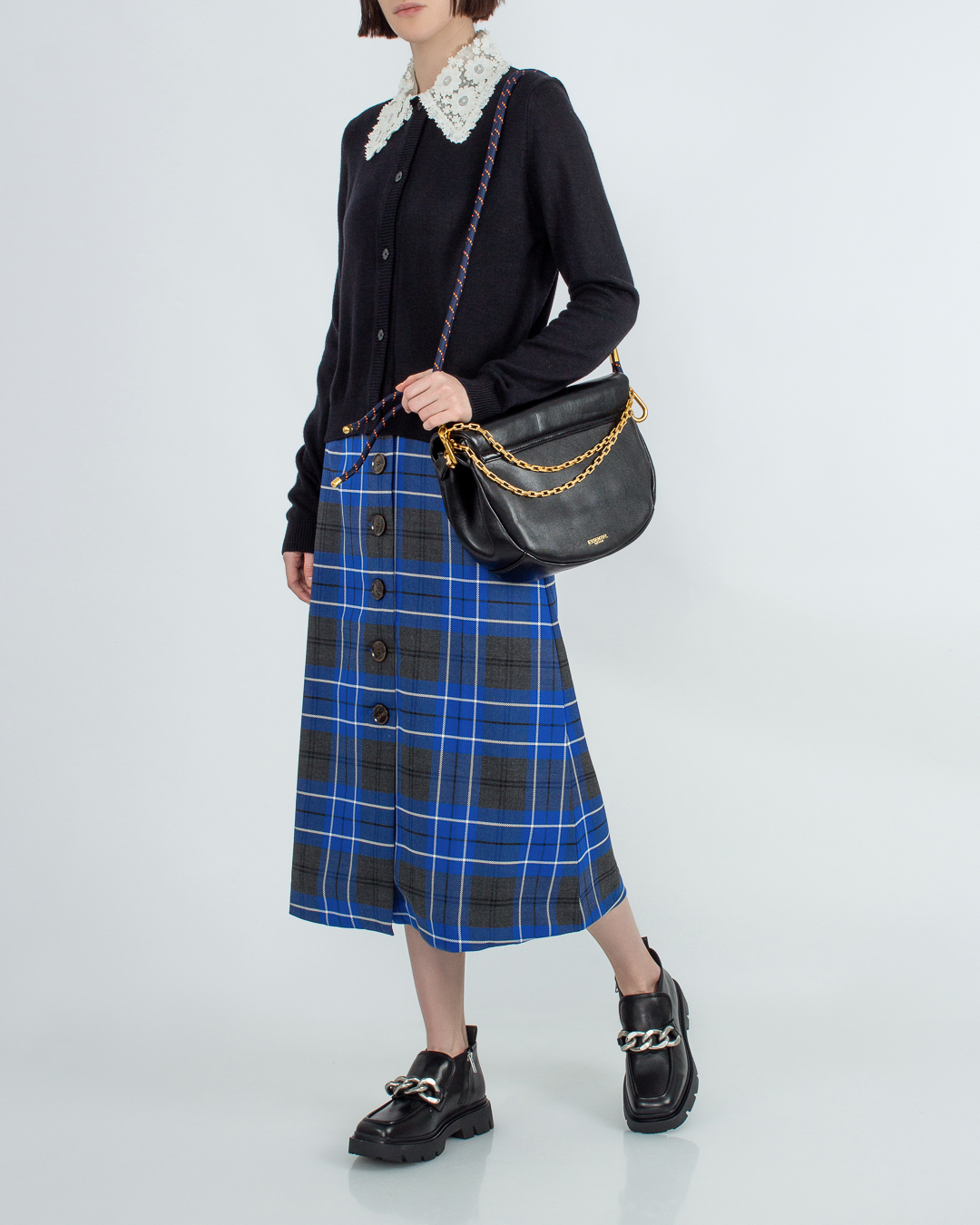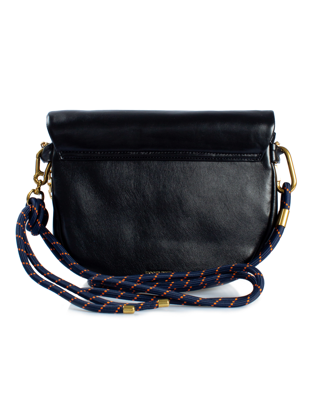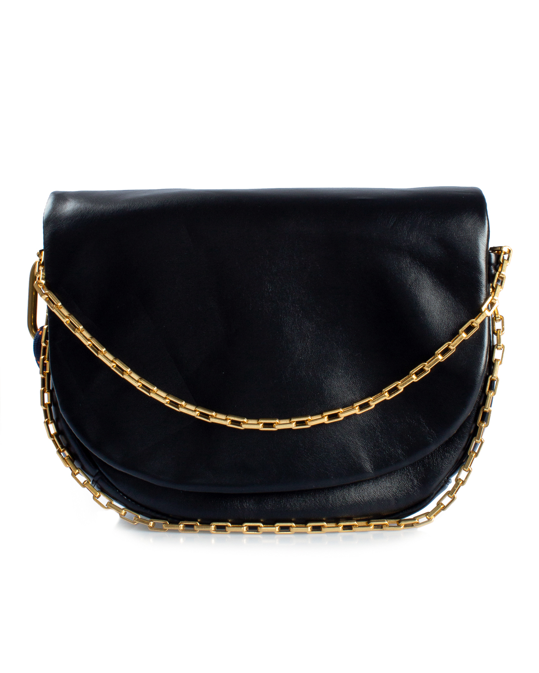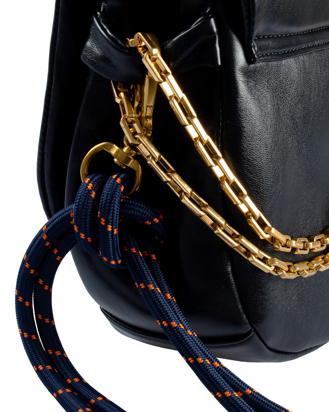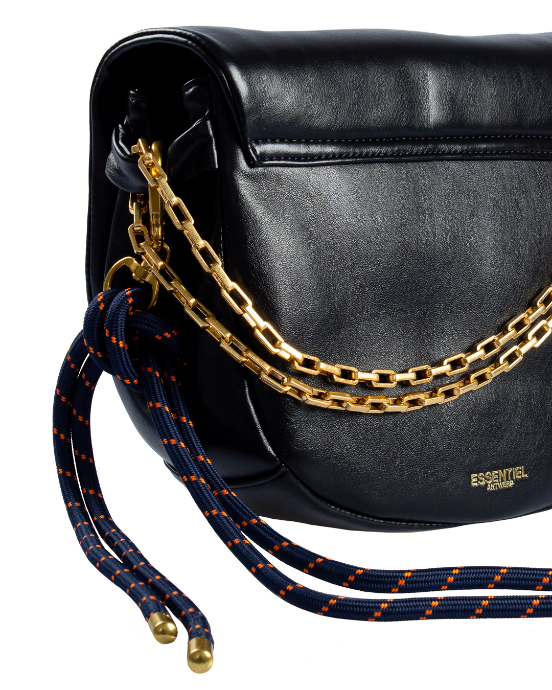Сумка Essentiel Antwep из мягкой экокожи черного цвета. Вместительное изделие с основным отделом с застежкой на клапан дополнено металлической цепочкой и текстильным ремнем на плечо веревочного вида.