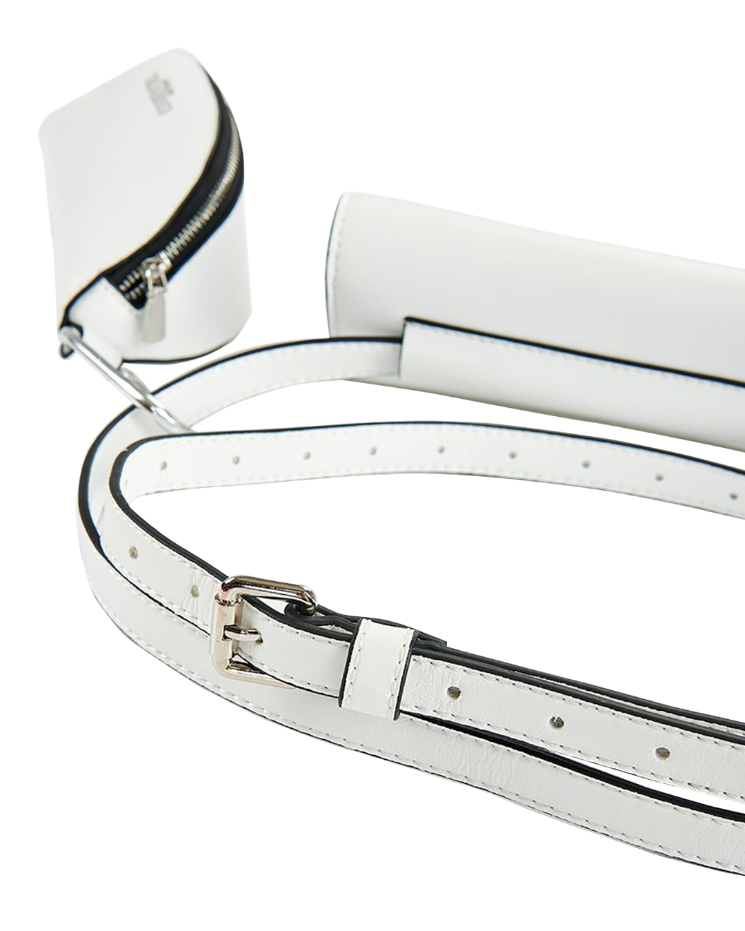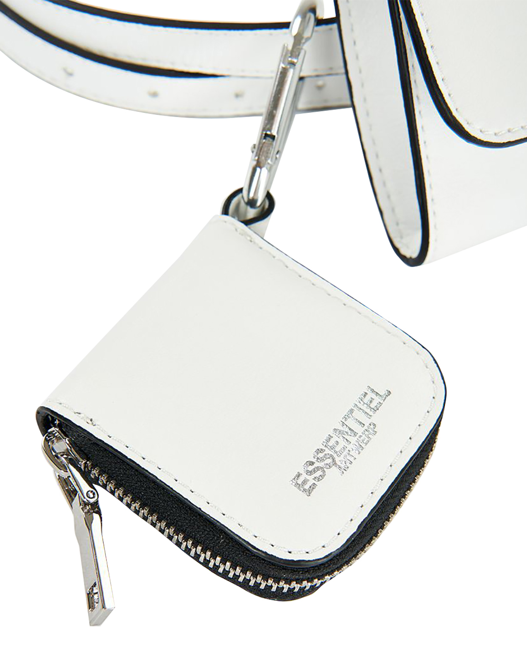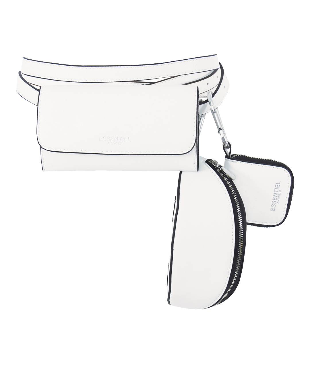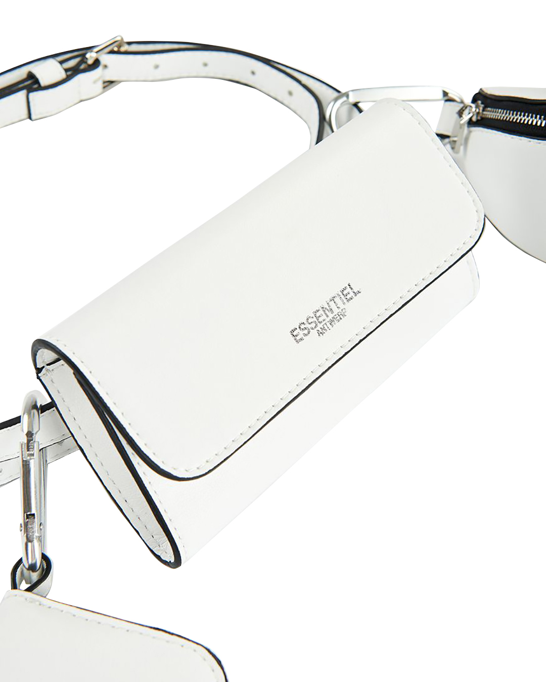 Сумка на пояс Essentiel сшита из сафьяновой экокожи белого цвета с металлическим логотипом бренда. Удобный пояс регулируемой длины дополнен несколькими съемными сумками и кошельками на карабинах.
