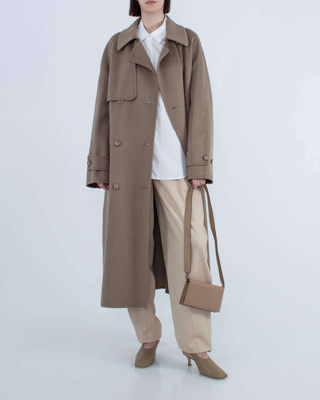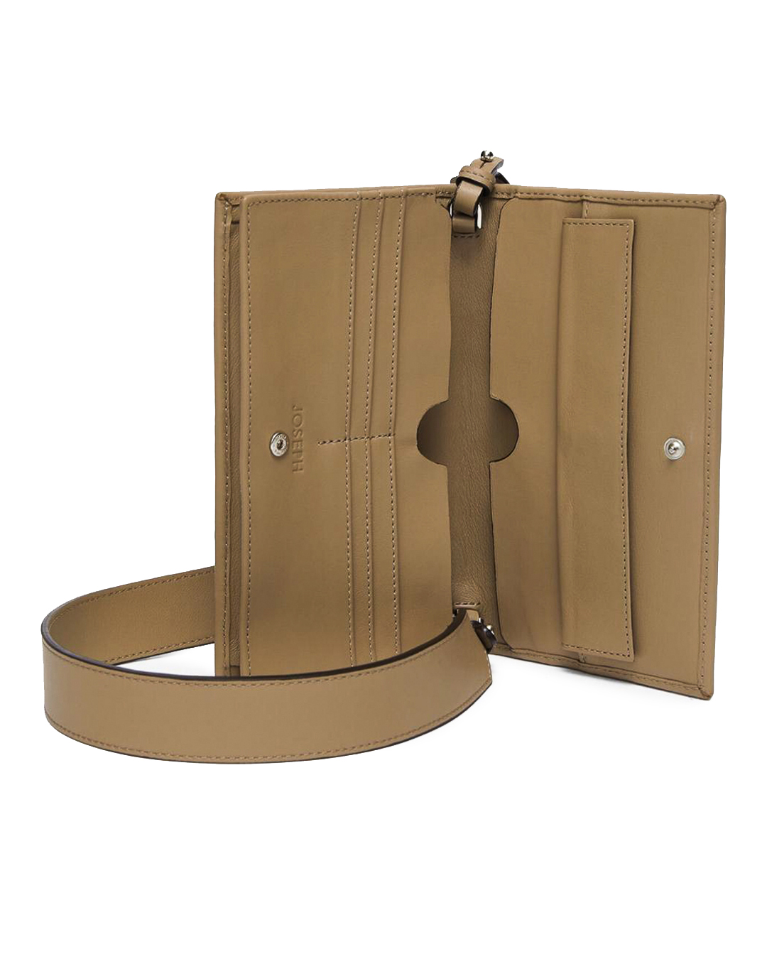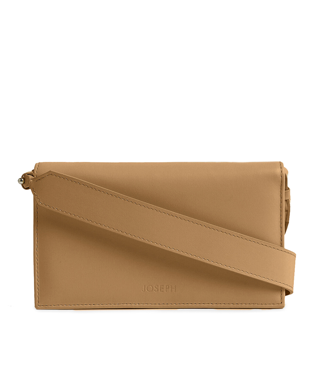 Сумка JOSEPH из натуральной матовой кожи бежевого оттенка с тиснением логотипа бренда. Изделие с внутренними отделами для купюр, монет и карточек дополнено съемным плечевым ремнем.