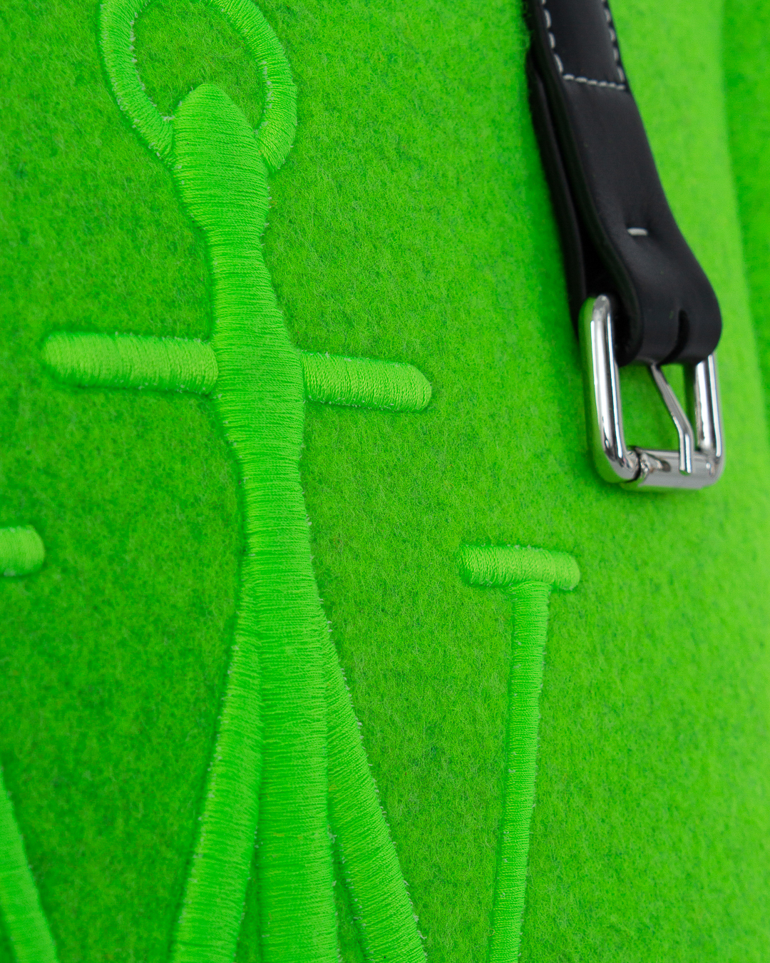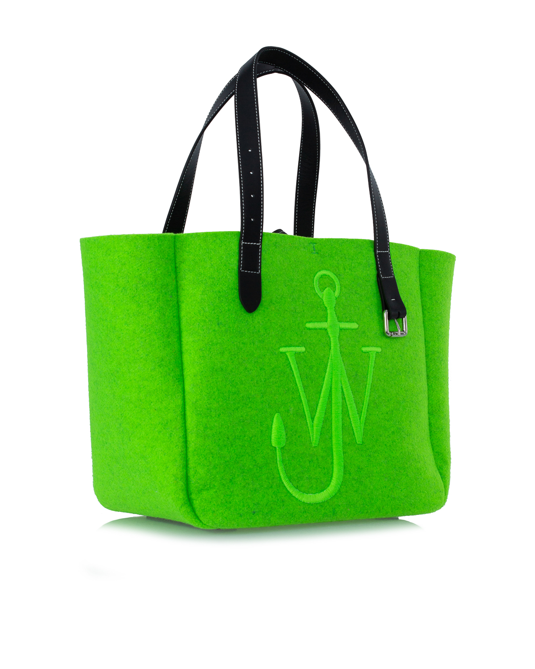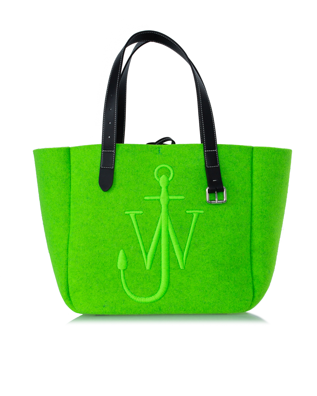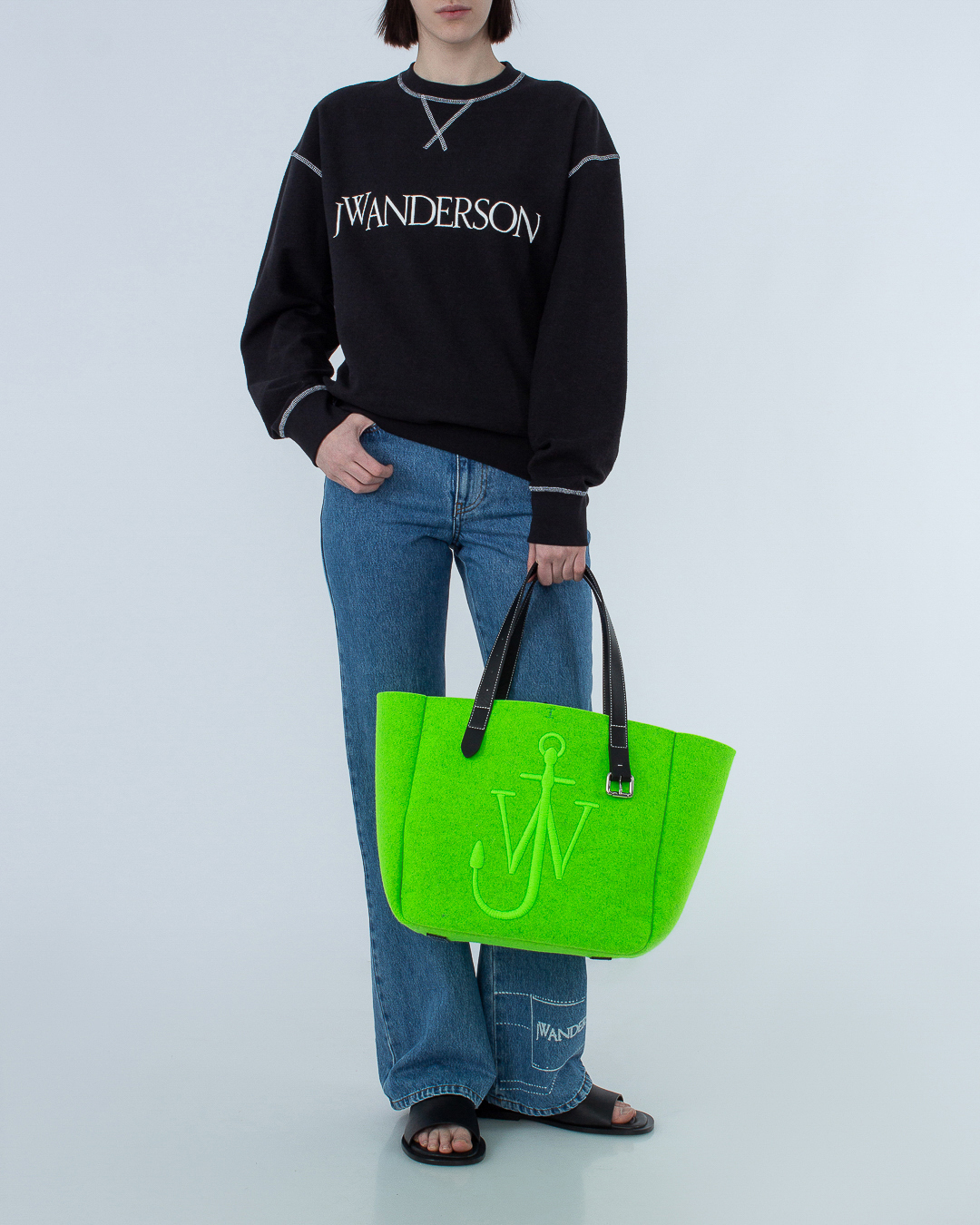 Сумка JW Anderson из плотного текстиля яркого салатового оттенка с вышивкой логотипа бренда. Вместительный основной отдел дополнен двумя удобными кожаными ручками.