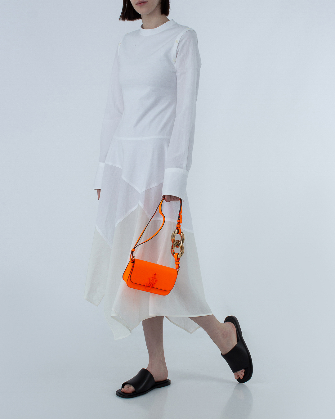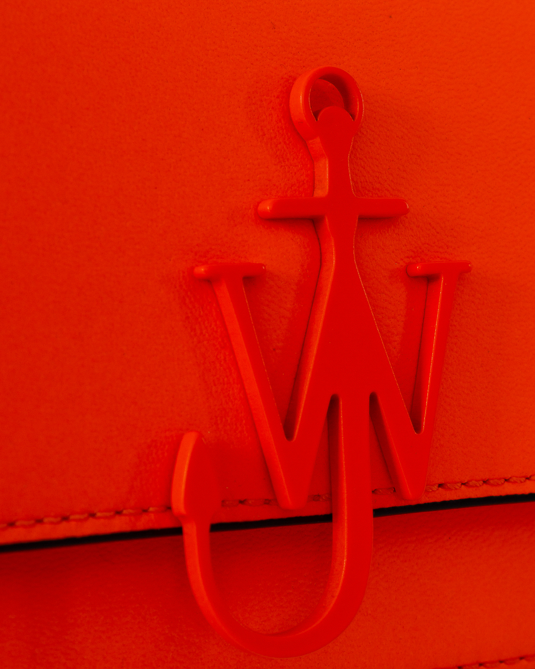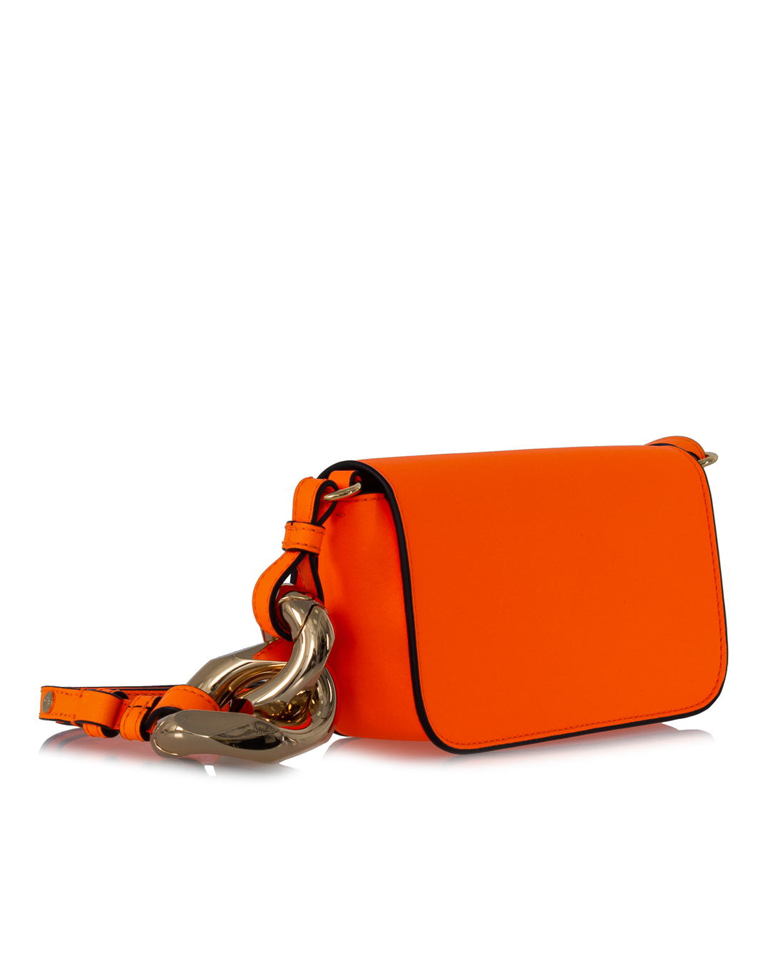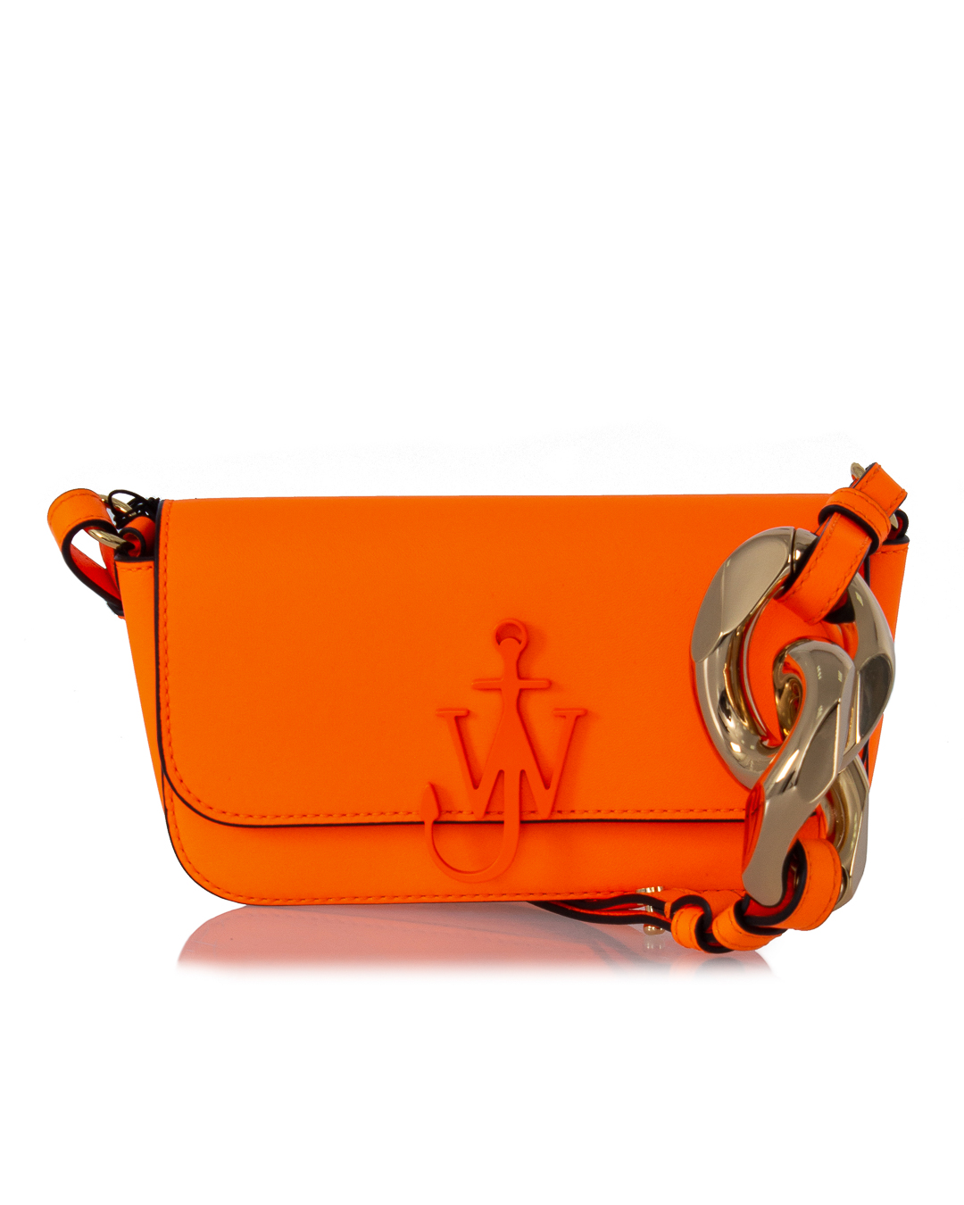 Сумка JW Anderson из плотной натуральной кожи яркого оранжевого оттенка. Основной отдел дополнен застежкой на клапан, декорированный металлическим логотипом бренда с матовым покрытием в основной тон изделия. Сумка дополнена двойным ремнем регулируемой длины.