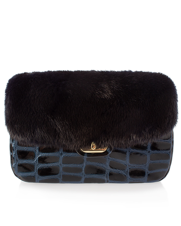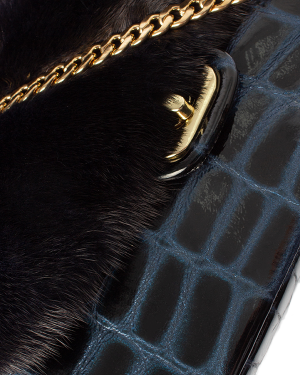 Сумка-клатч из кожи и натурального меха норки. Изделие с основным отделом и застежкой на клапан с металлическим замком. Аксессуар дополнен тонкой металлической цепочкой.