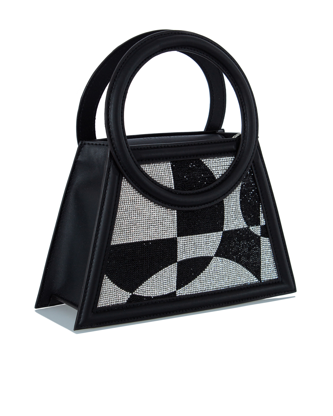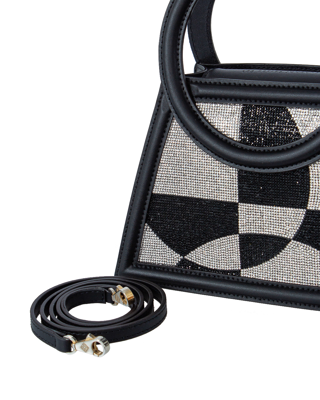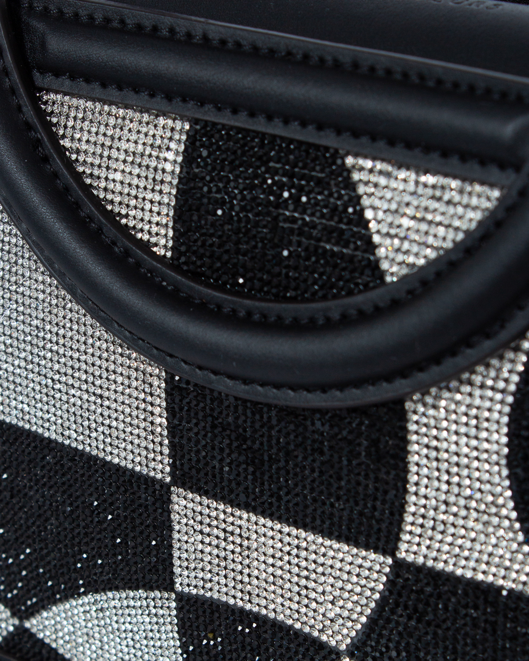 Сумка Les petits joueurs выполнена из кожи черного цвета и украшена кристаллами в стиле диско-оп-арт. Модель миниатюрной версии структурированной трапециевидной формы дополнена основным отделом и съемным плечевым ремешком.