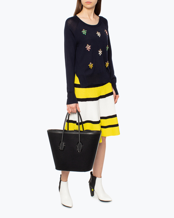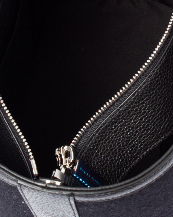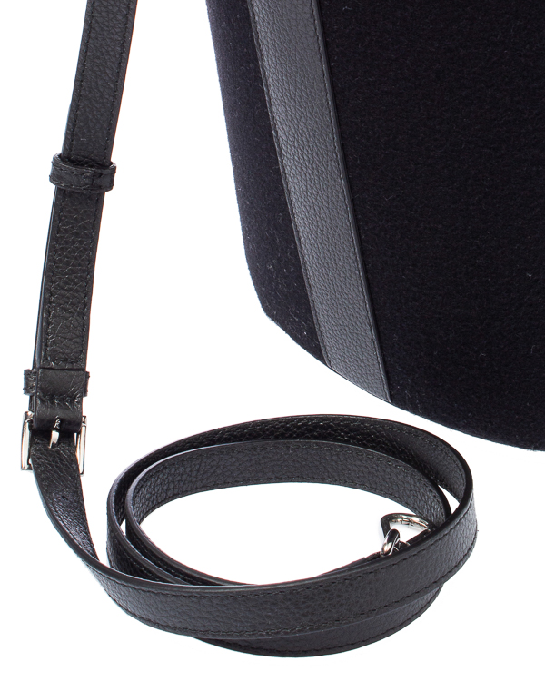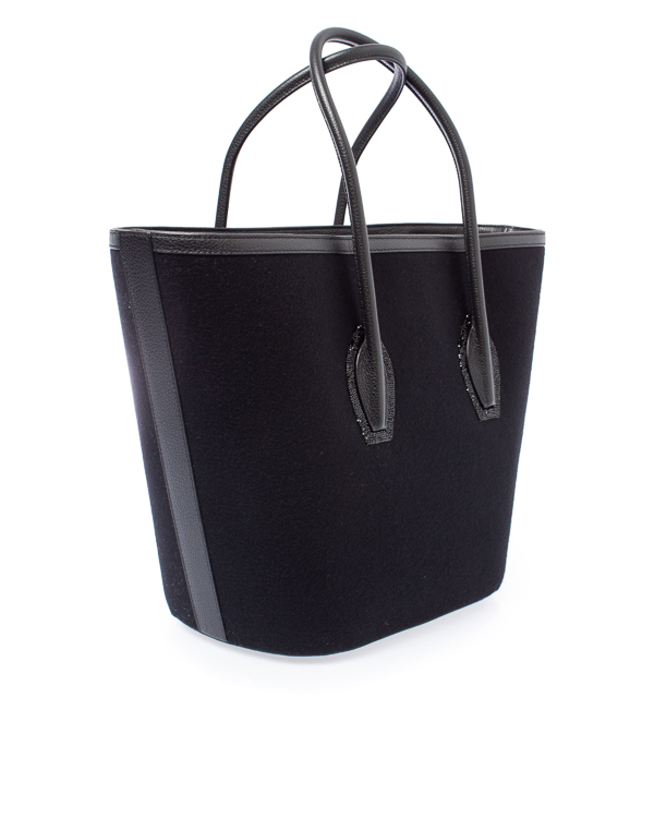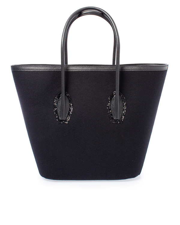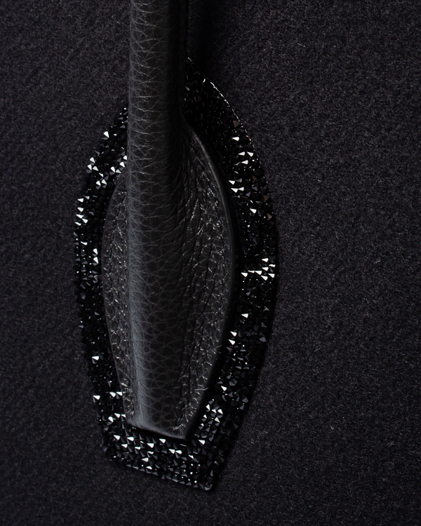Сумка Porter выполнена из мягкой ткани из смеси кашемира и шерсти с отделкой из кожи в тон изделия. Каждая ручка на тканевых вставках украшена мерцающими черными кристальными камнями. Верх закрывается черным кожаным чехлом, украшенным цельной застежкой-молнией с кристаллами, а внутренняя подкладка - хлопковой тканью. Внутри находится тонкий кожаный ремешок из кожи, позволяющий носить сумку через плечо.