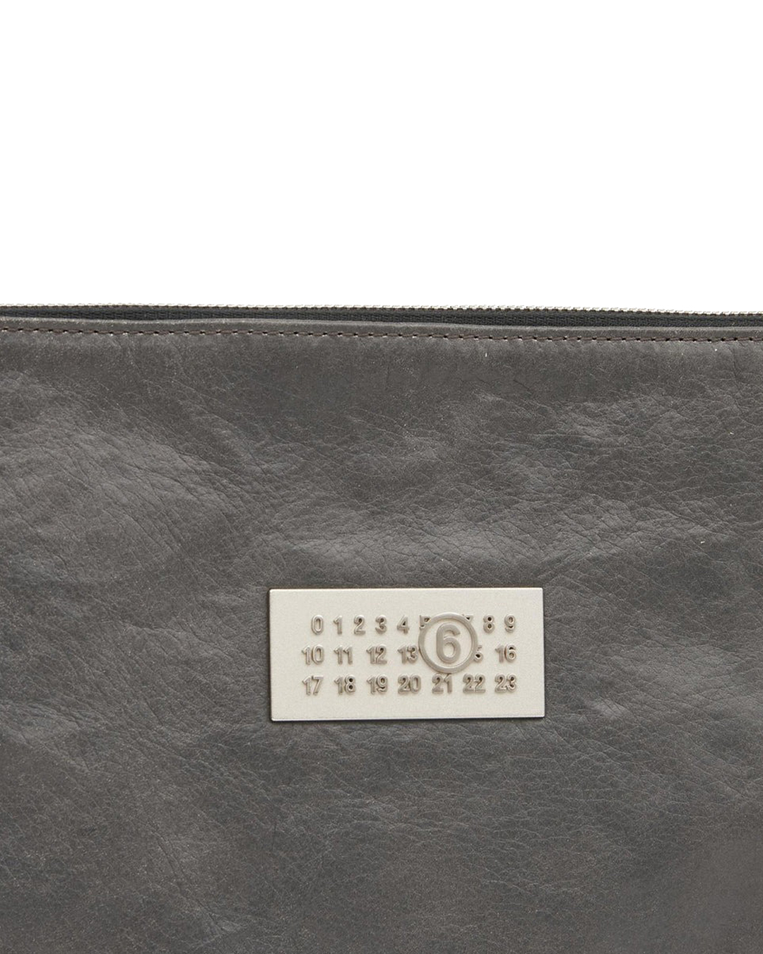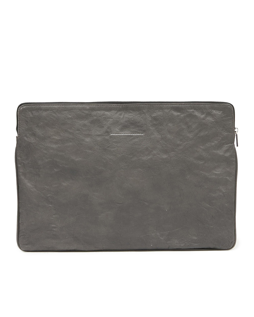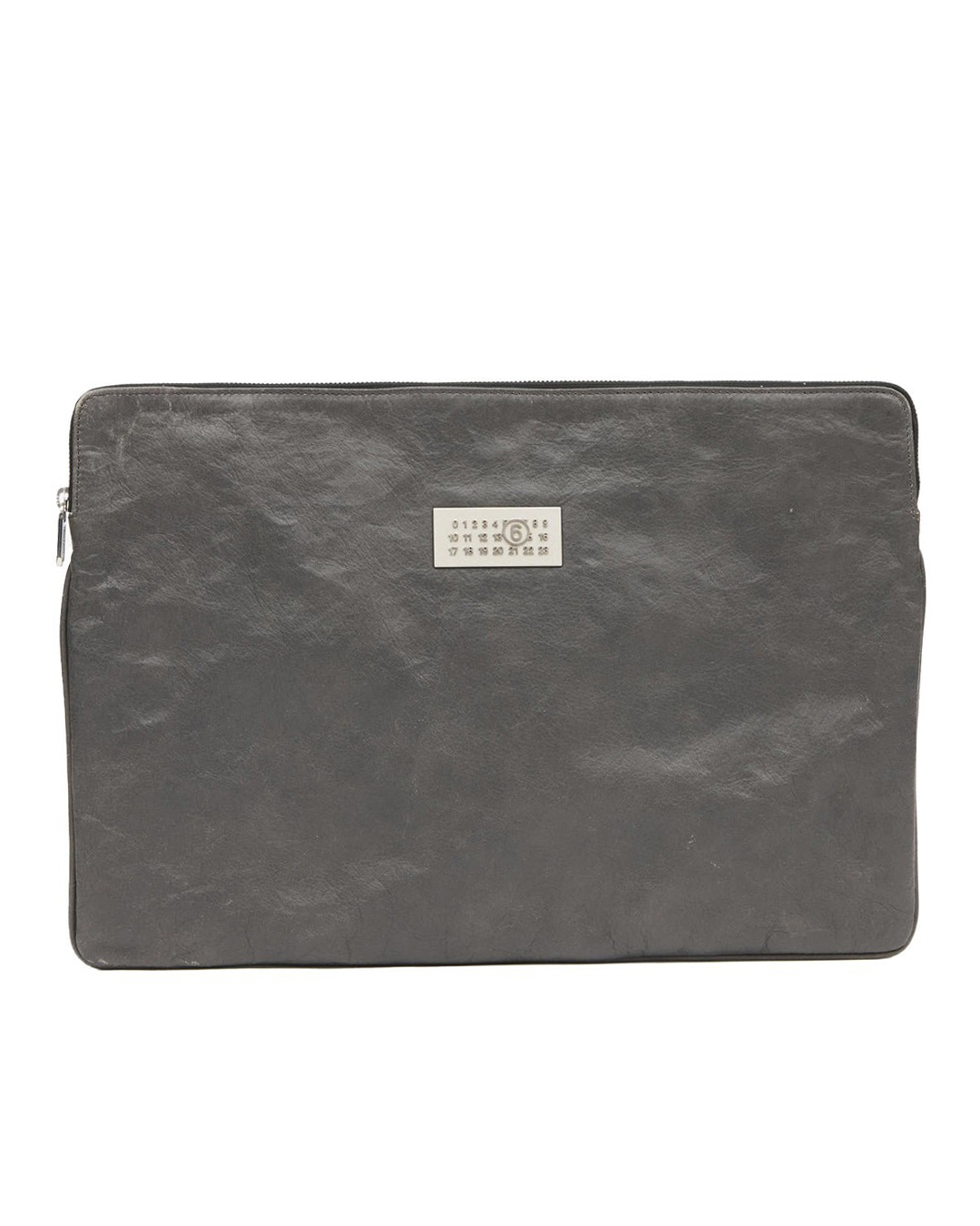 Клатч MM6 для laptop изготовлен из текстурированной кожи с металлическим логотипом бренда. Модель дополнена застежкой на молнию и фирменным знаком бренда — горизонтальная линия белых стежков.