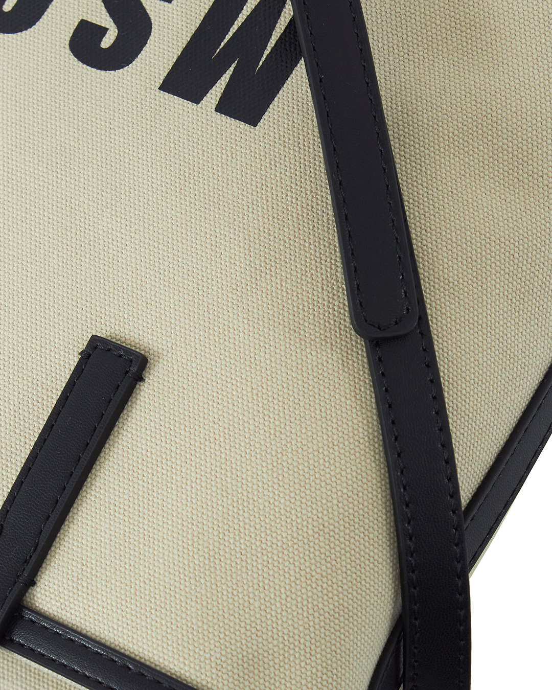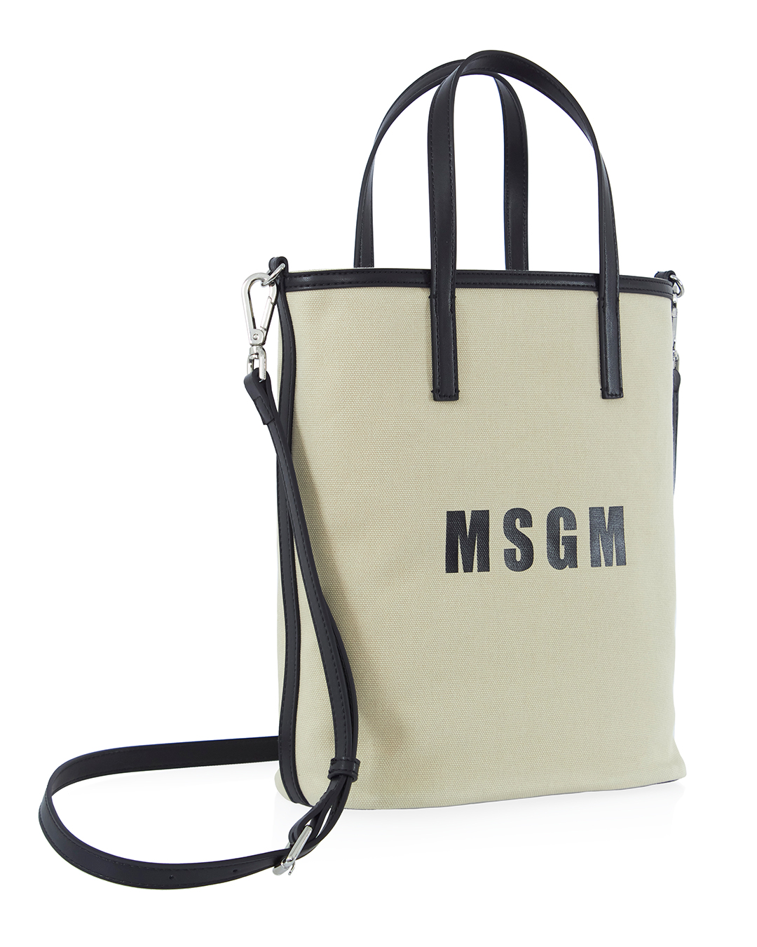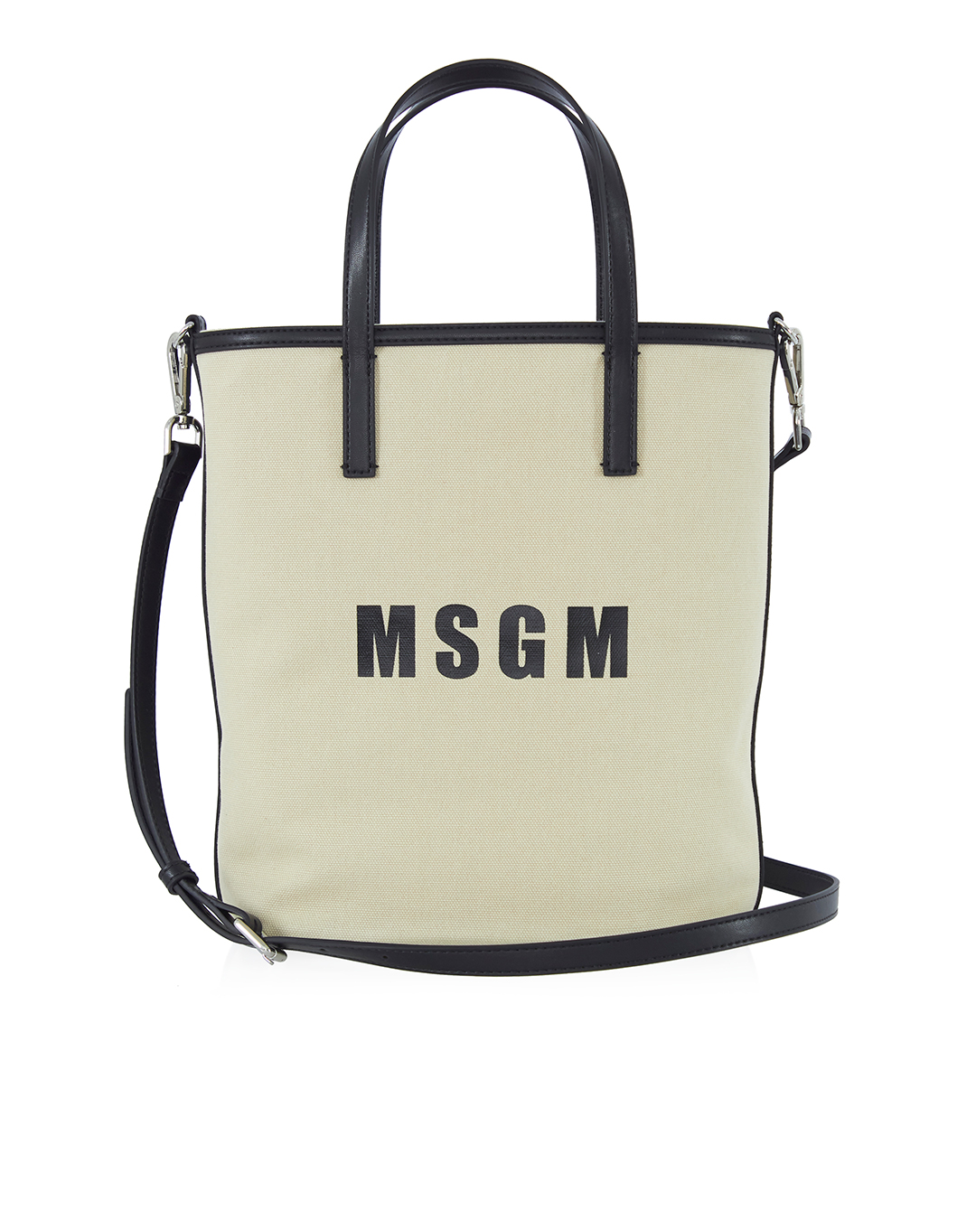 Сумка MSGM выполнена из холщового хлопка бежевого оттенка с логотипом бренда. Контрастная отделка из экокожи дополнена съемным плечевым ремнем и двумя удобными ручками.