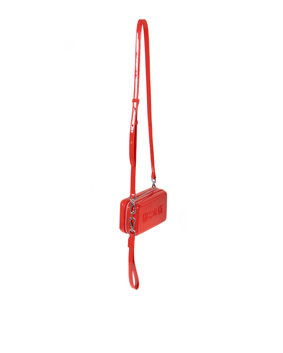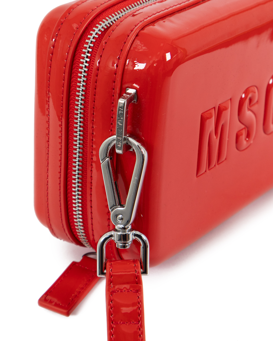 Сумка бокс MSGM из глянцевого материала в армированном корпусе с логотипом бренда. Модель с основным отделом с застежкой на молнию оснащена плечевым ремнем и дополнительной ручкой на карабине.