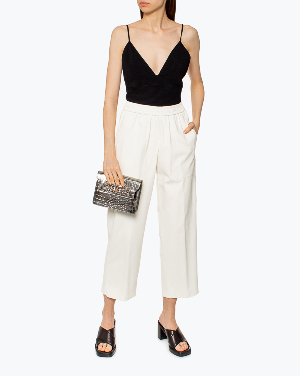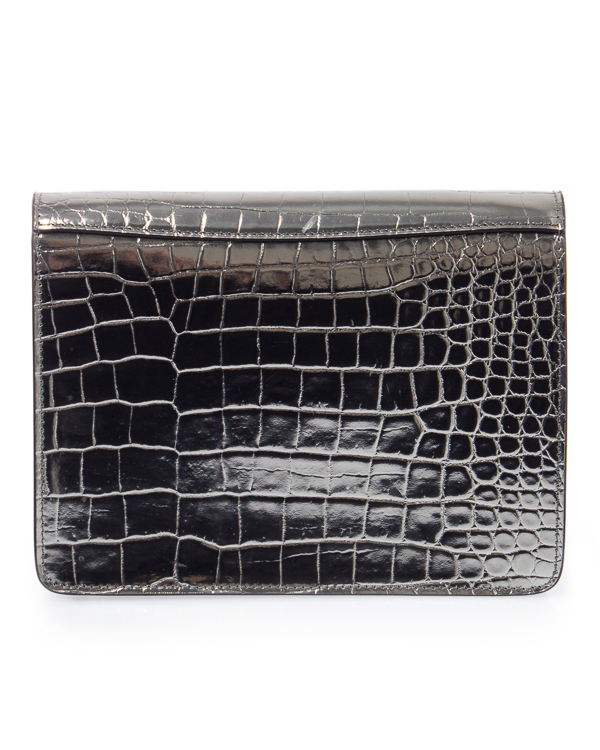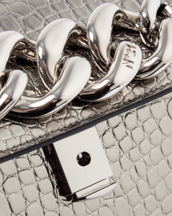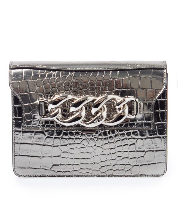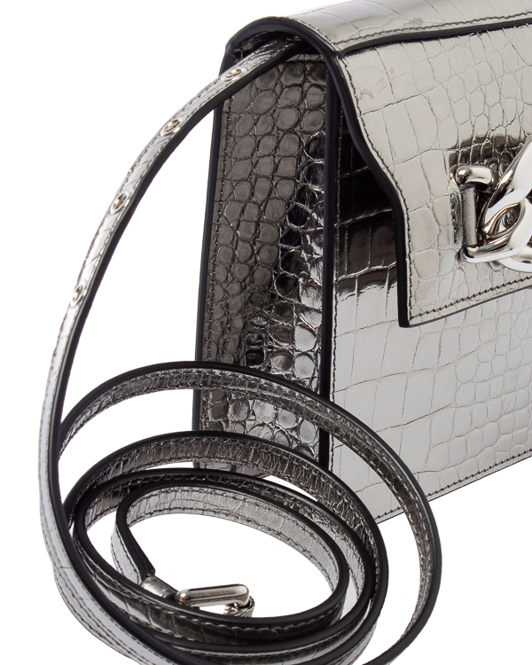 Компактная сумка из натуральной кожи с фактурой под рептилию и покрытием с эффектом жидкий металлик. Основной отдел с застежкой на клапан, декорированный металлической фурнитурой с покрытием. Тонкий съемный плечевой ремень в комплекте.