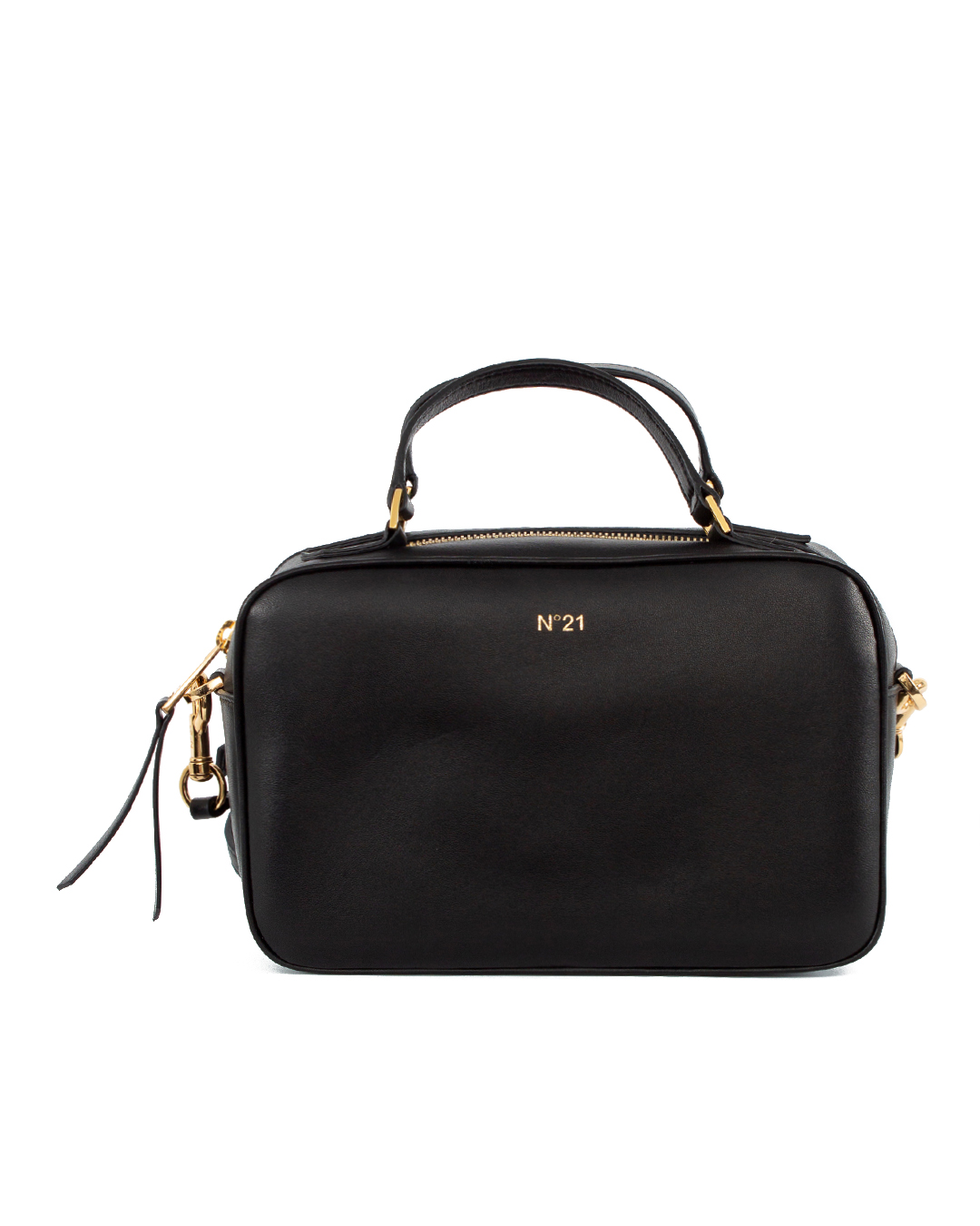 Сумка № 21 из натуральной кожи черного цвета. Изделие с основным отделом и застежкой на молнию дополнено металлической фурнитурой и миниатюрным логотипом бренда. Съемный кожаный ремень на плечо на карабинах.
