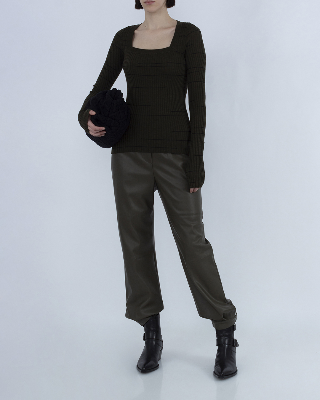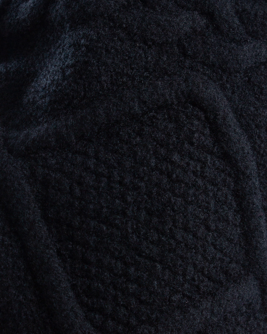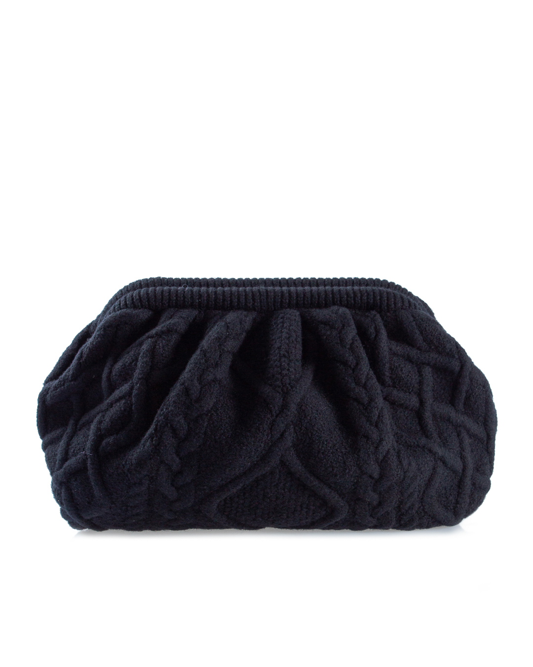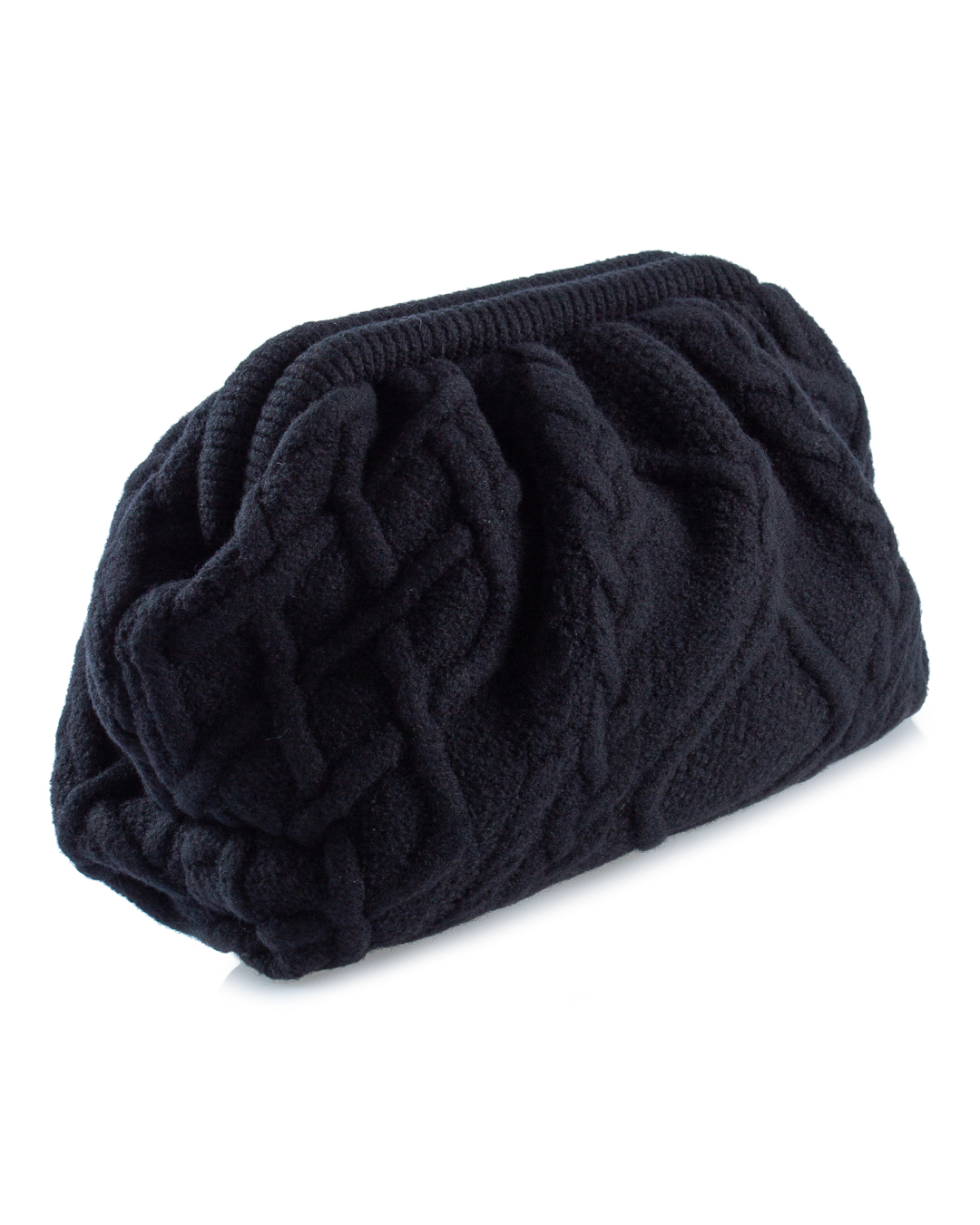Сумка Nude узорной вязки из шерстяной пряжи черного цвета. Изделие в виде клатча с основным отделом и верхней частью металлического каркаса.