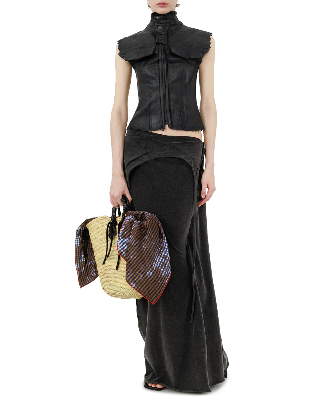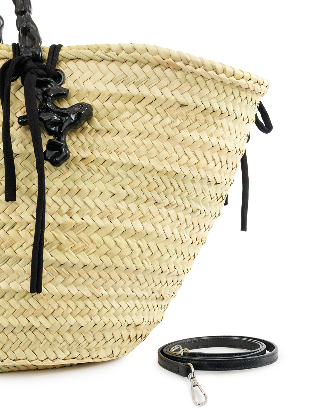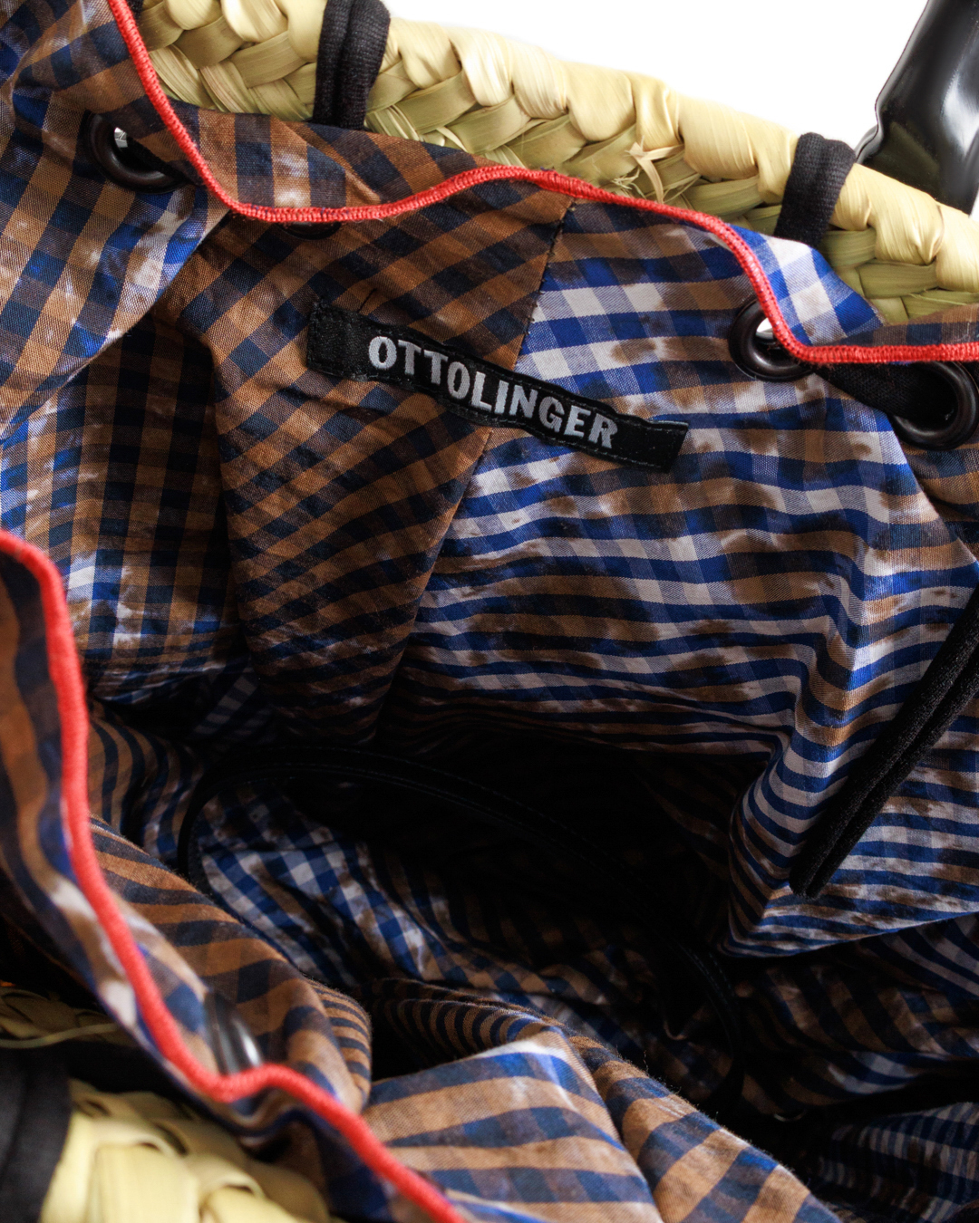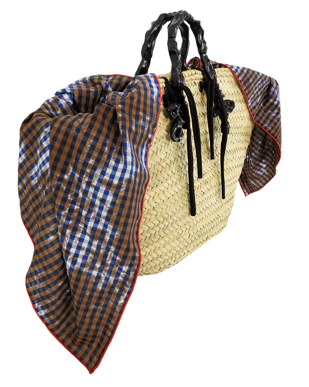 Эта сумка — воплощение летнего шика с ноткой артистизма. Плетёная основа из натуральных волокон создаёт ощущение лёгкости и непринуждённости, а её фактура придаёт изделию природную элегантность. Центральное место в композиции занимает изысканная ручка, выполненная в виде витой конструкции с глянцевым покрытием — она не только функциональна, но и служит выразительным декоративным элементом, добавляющим сумке характер. Особая изюминка — драпировка из клетчатой ткани с контрастной красной окантовкой. Эта деталь превращает обычную плетёную сумку в арт-объект: ткань ниспадает свободными складками, создавая динамику и добавляя образу игривости. Клетка с глубоким синим и тёплым коричневым оттенками гармонично сочетается с натуральным тоном плетения, формируя интересный контраст. Декоративные завязки с объёмными элементами в виде цветов фиксируют ткань, подчёркивая продуманность дизайна. Эти детали не просто удерживают драпировку — они становятся самостоятельным украшением, придающим сумке индивидуальность. Сочетание природного материала и текстильного акцента создаёт уникальный баланс между простотой и изысканностью. Эта сумка идеально дополнит как расслабленный пляжный образ, так и стильный летний аутфит, превращая каждый выход в маленькое модное событие. Она говорит о вкусе своей обладательницы, её любви к деталям и умении сочетать несочетаемое.
