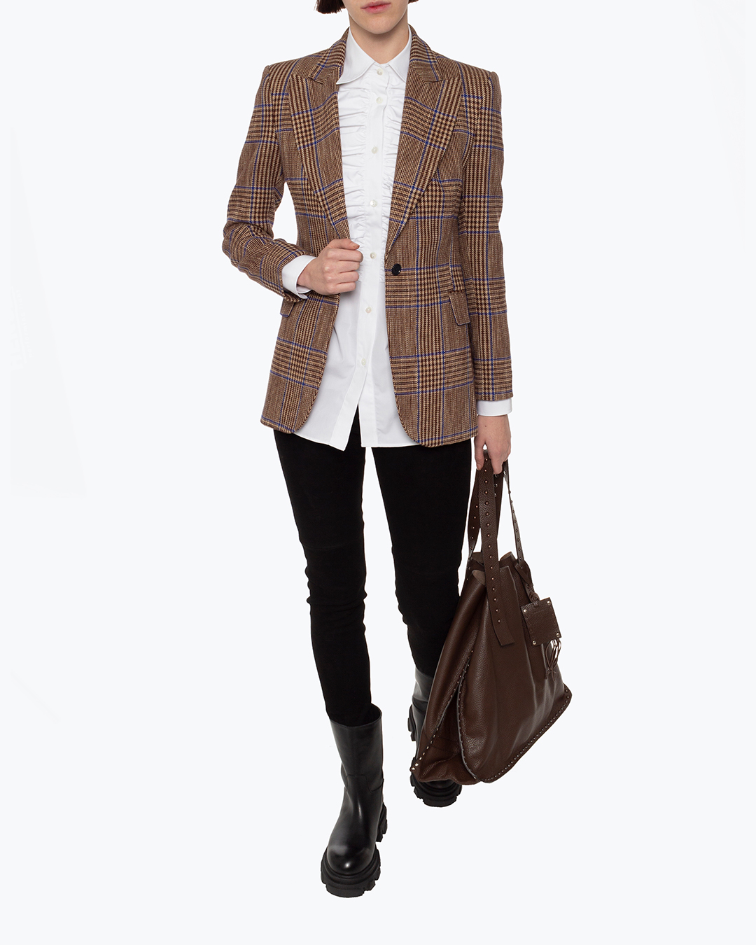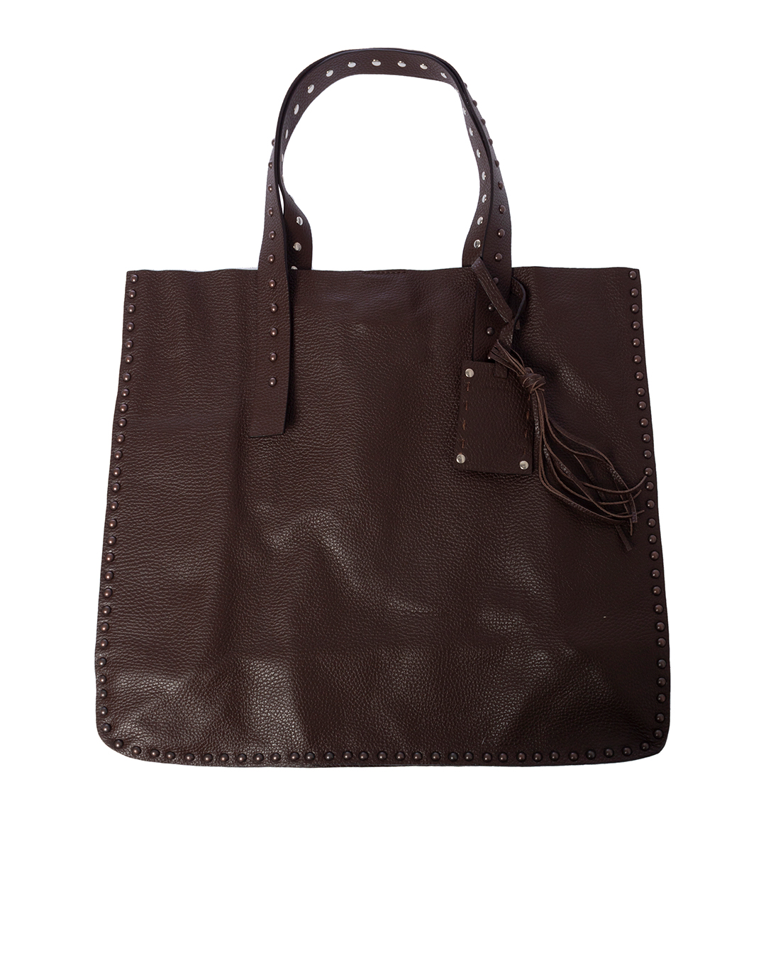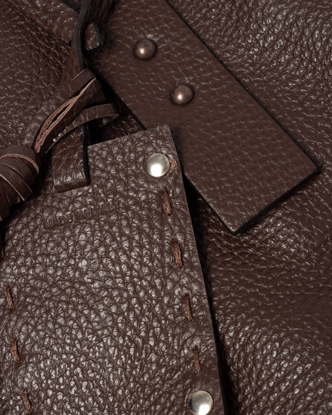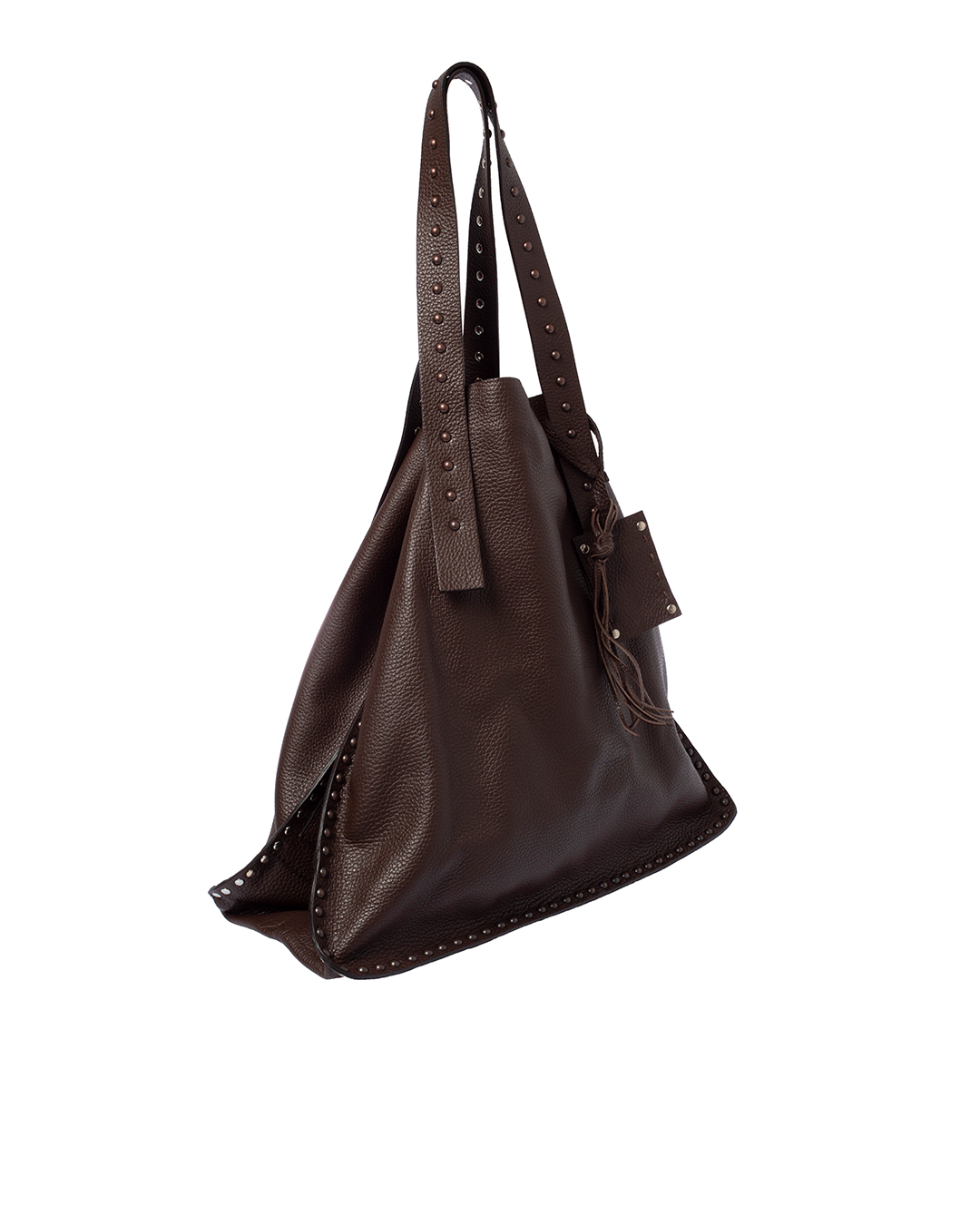 Сумка P.A.R.O.S.H. из новой коллекции сезона осень-зима 21\22 выполнена из натуральной шагреневой кожи коричневого цвета. Вместительное изделие с основным отделом дополнено двумя удобными ручками. Сумка дополнена отделкой металлическими клепками и ручным швом.