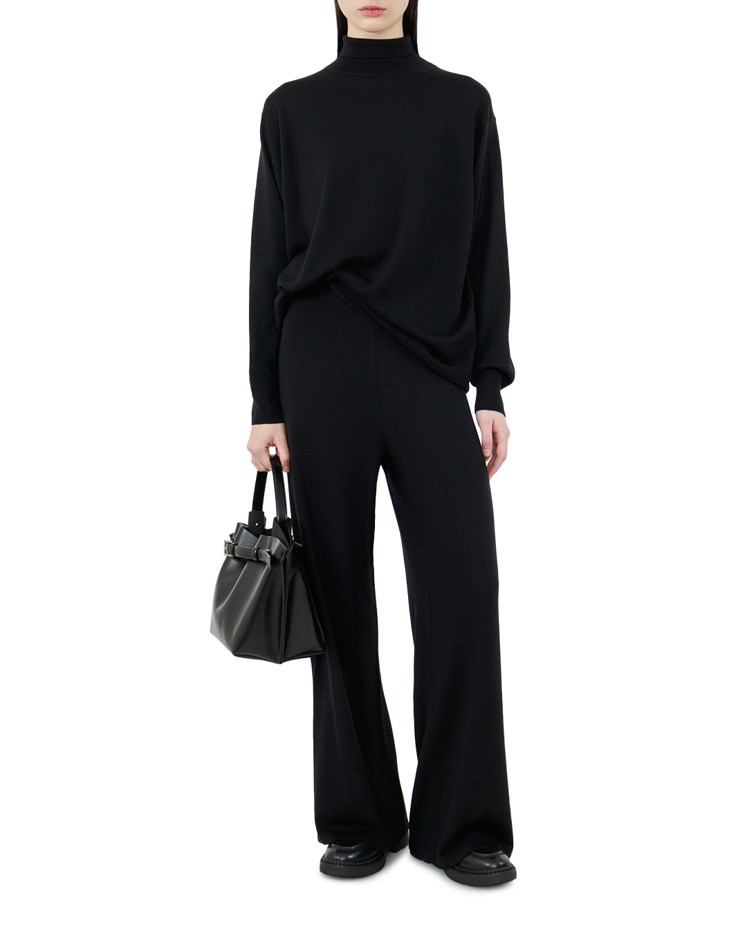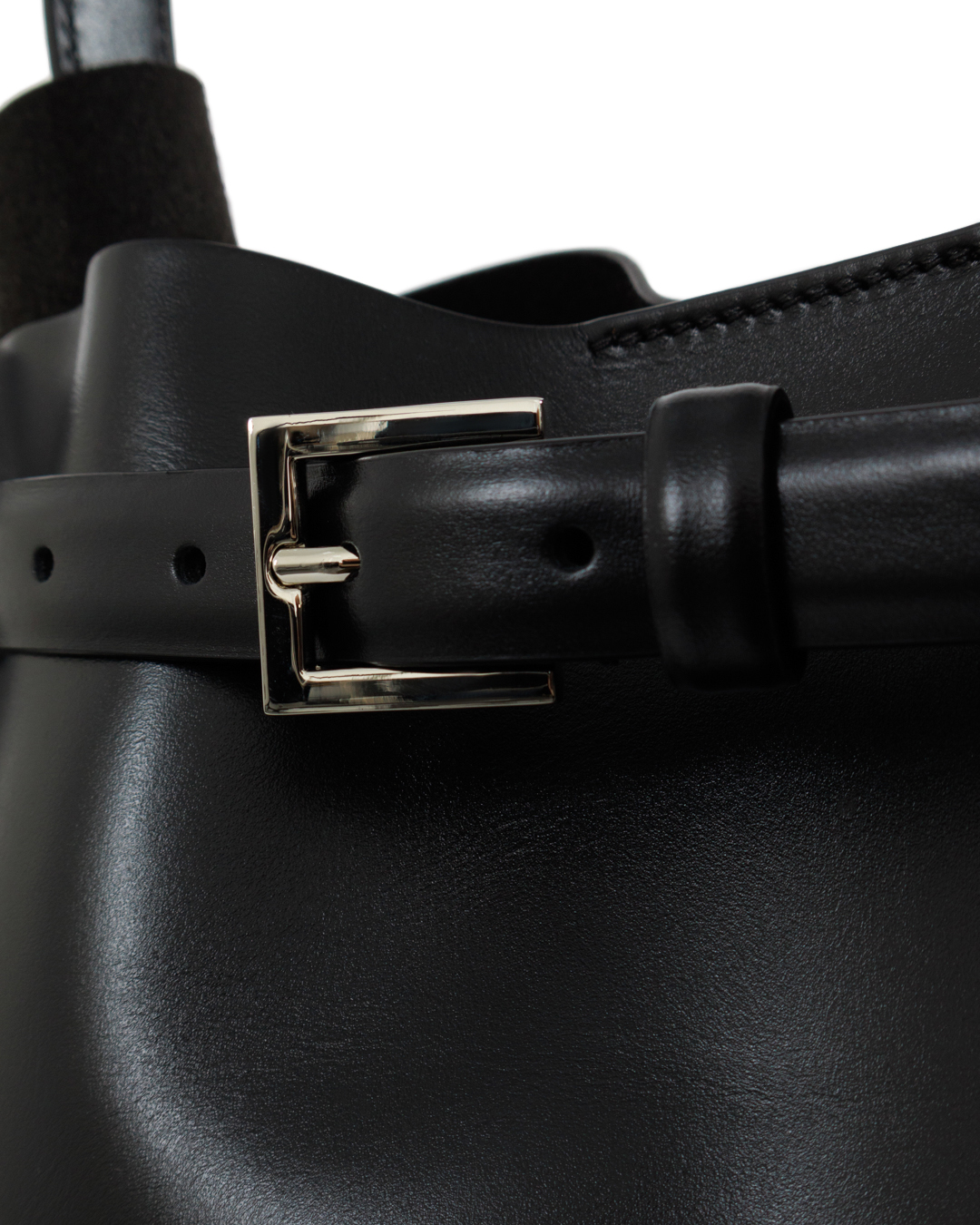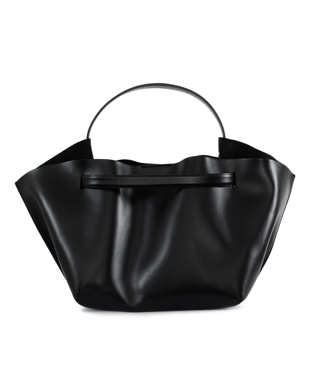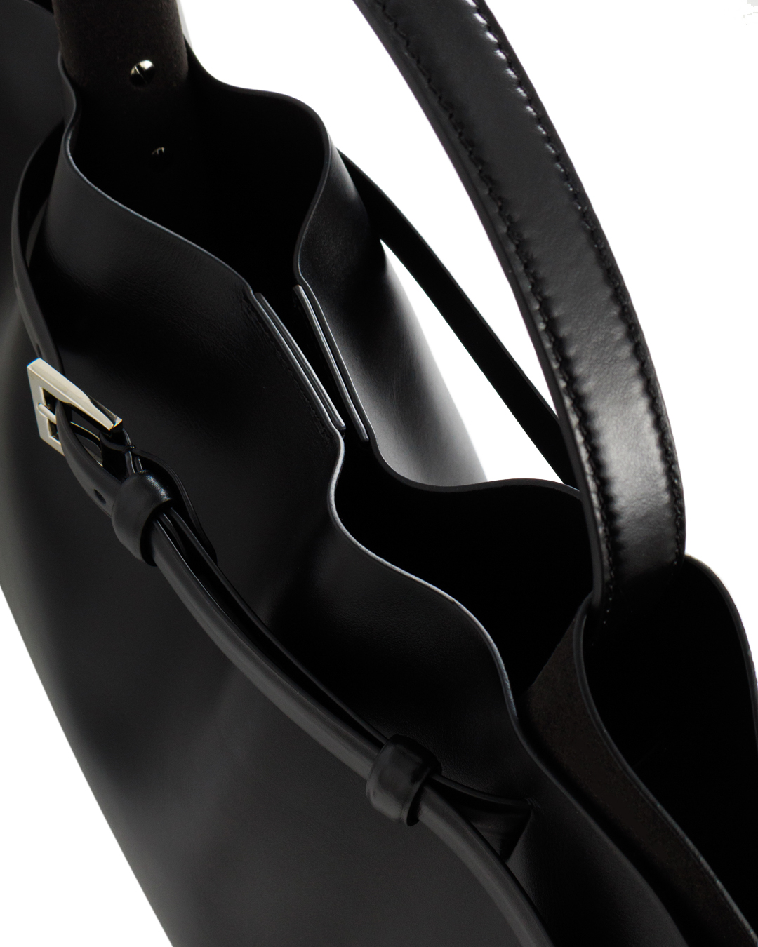 Эта сумка воплощает сдержанную элегантность и современный минимализм, подчеркивая изысканность ее обладательницы. Выполненная из гладкой черной кожи премиум-класса, она обладает структурированной формой, которая придает ей оригинальный, но практичный силуэт. Центральным элементом дизайна является изящный кожаный ремень с металлической пряжкой, который добавляет динамичности и служит акцентом. Асимметричные складки на внешней стороне сумки создают интересные объемные эффекты, притягивая взгляд и добавляя текстурного разнообразия. Ручка выполнена из того же материала, что и основа, она переходящая в боковые панели, что визуально удлиняет силуэт и добавляет цельности дизайну. Внутри сумки предусмотрено достаточное количество пространства, что делает ее не только стильной, но и функциональной для повседневного использования. Лаконичное оформление без излишних декоративных элементов придает сумке универсальность, благодаря чему она легко сочетается как с деловыми костюмами, так и с повседневными нарядами.