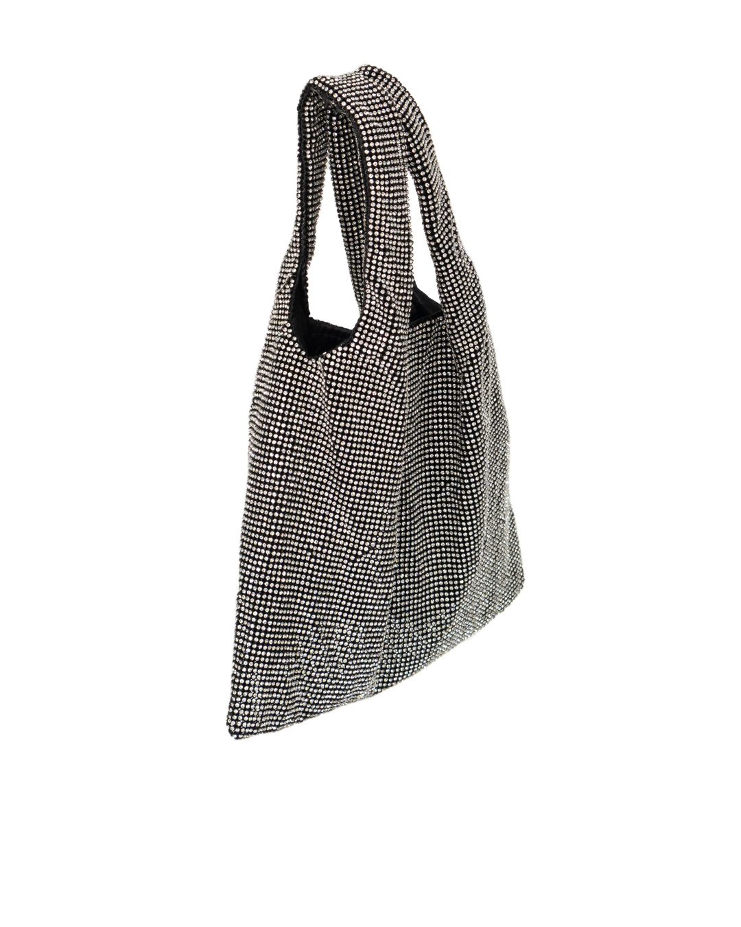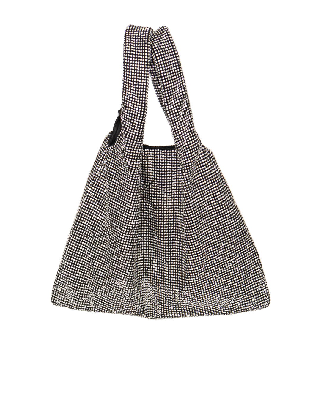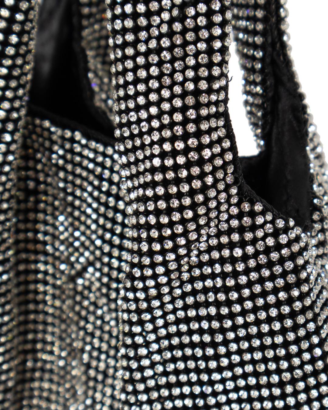 Миниатюрная сумка из полиэстера декорированная стразами. Аксессуар с короткими двумя ручками.