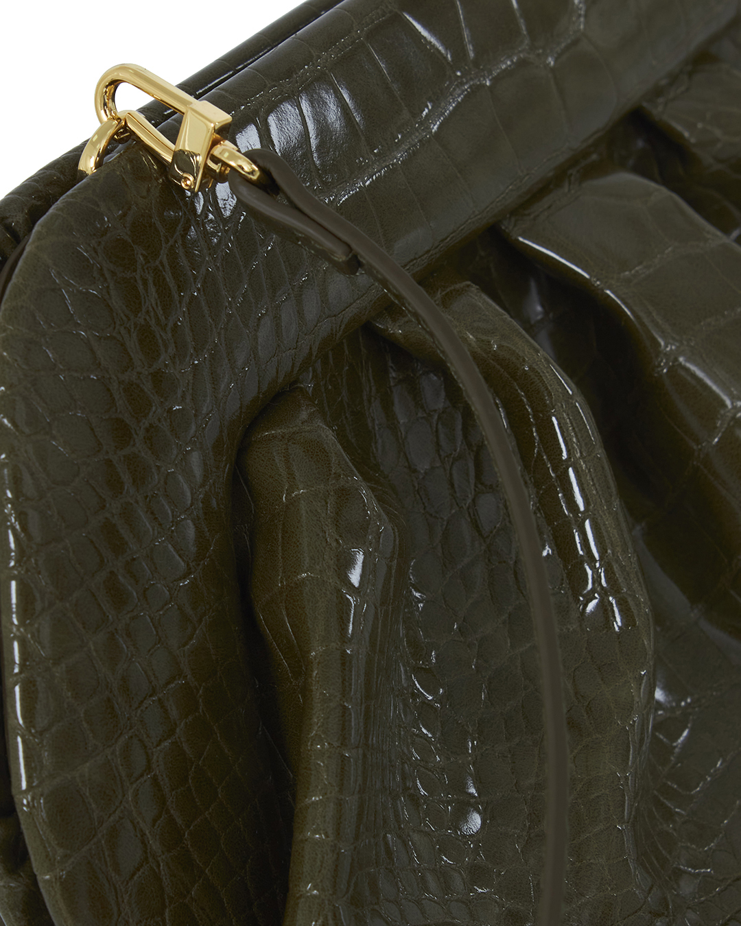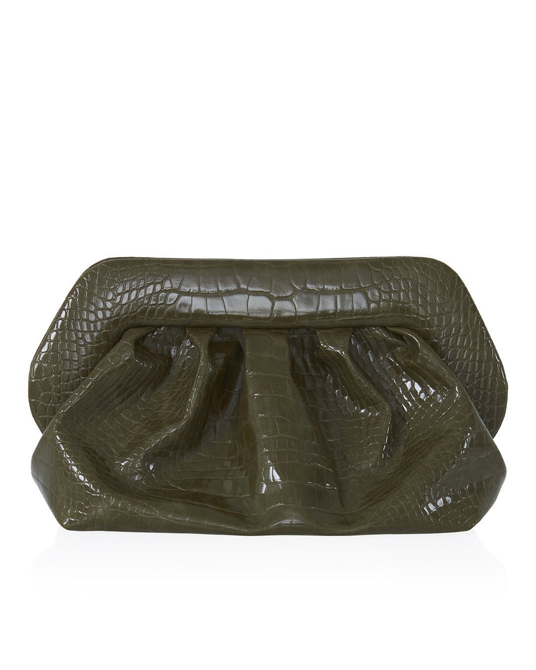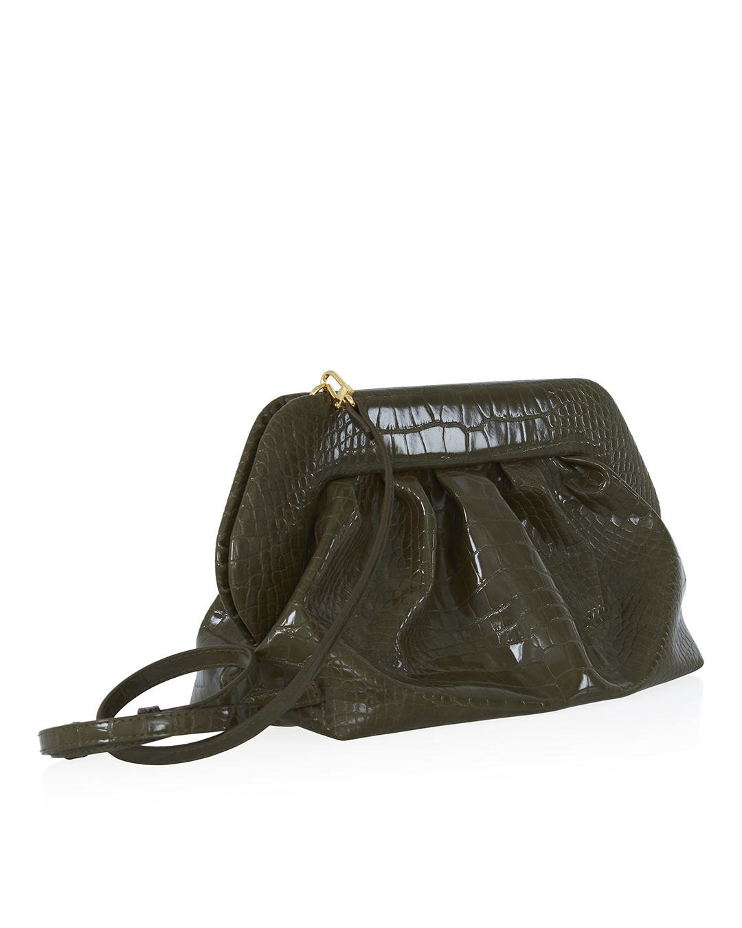 Сумка-клатч BIOS от итальянского бренда THEMOIRÈ сшита из веганской кожи зеленого оттенка с фактурой под рептилию. Таким же материалом обтянули магнитный рамочный замок. Акцентом на аксессуаре стали мягкие крупные складки, которые делают изделие объемным. Тонкий съемный плечевой ремешок на карабинах. Размеры сумки: высота изделия 20 см, ширина 29 см, глубина 14 см.