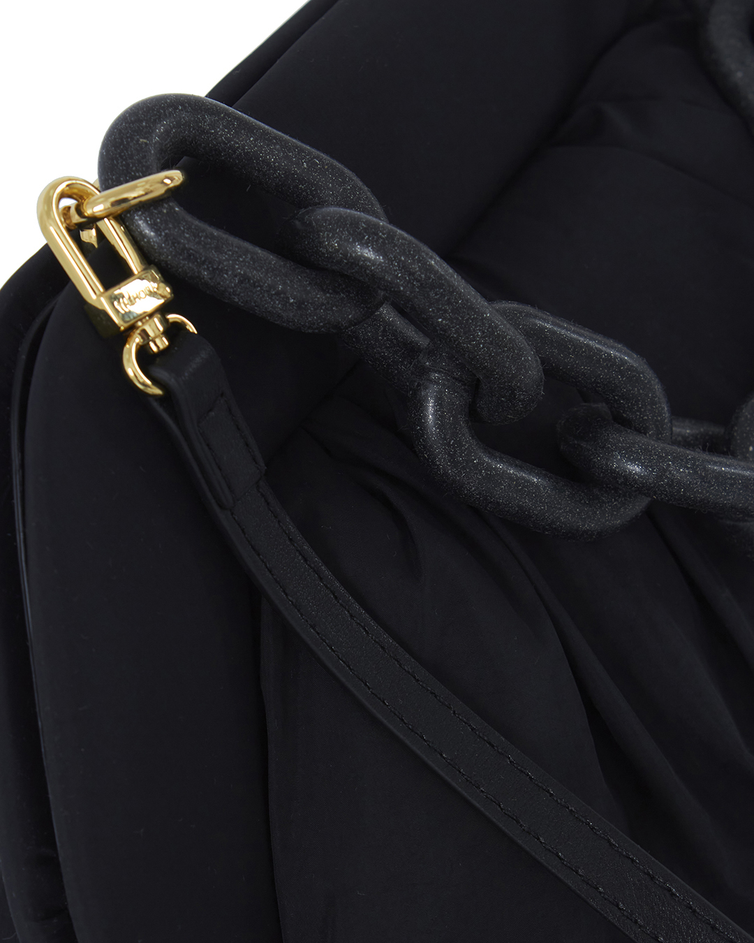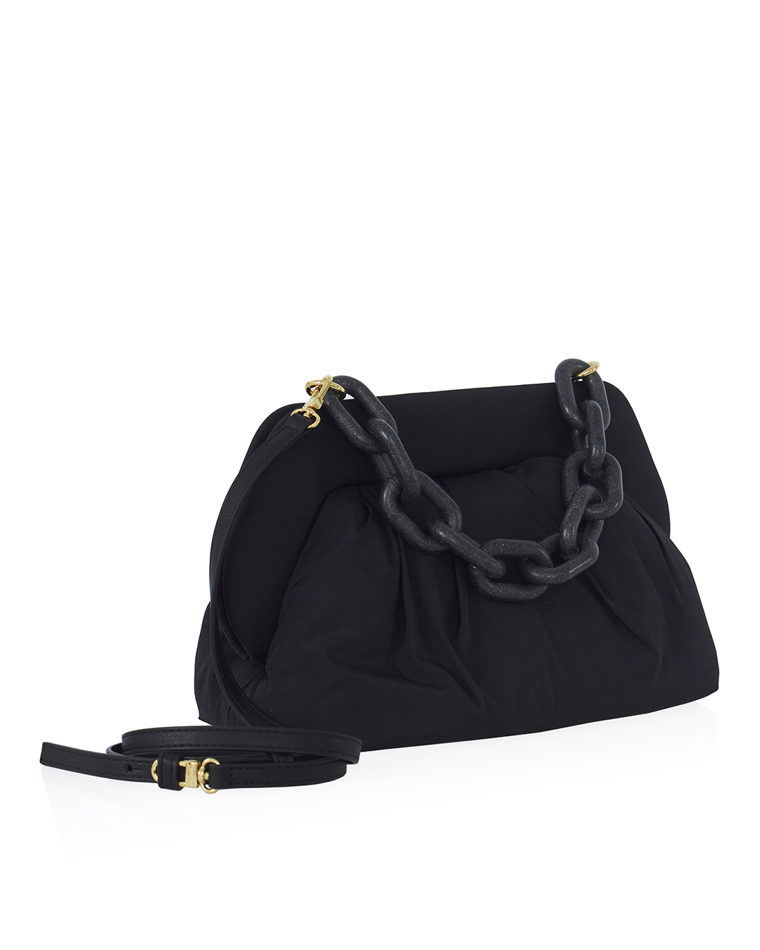 Сумка-клатч BIOS от итальянского бренда THEMOIRÈ сшит из нейлона черного цвета. Таким же материалом обтянули магнитный рамочный замок. Акцентом на аксессуаре стали мягкие крупные складки, которые делают изделие объемным и матовая крупная цепь в основной тон изделия. Тонкий съемный плечевой ремешок на карабинах. Размеры сумки: высота изделия 20 см, ширина 30 см, глубина 14 см.