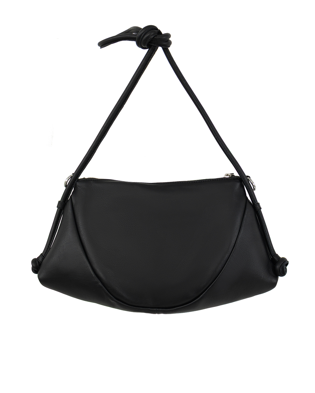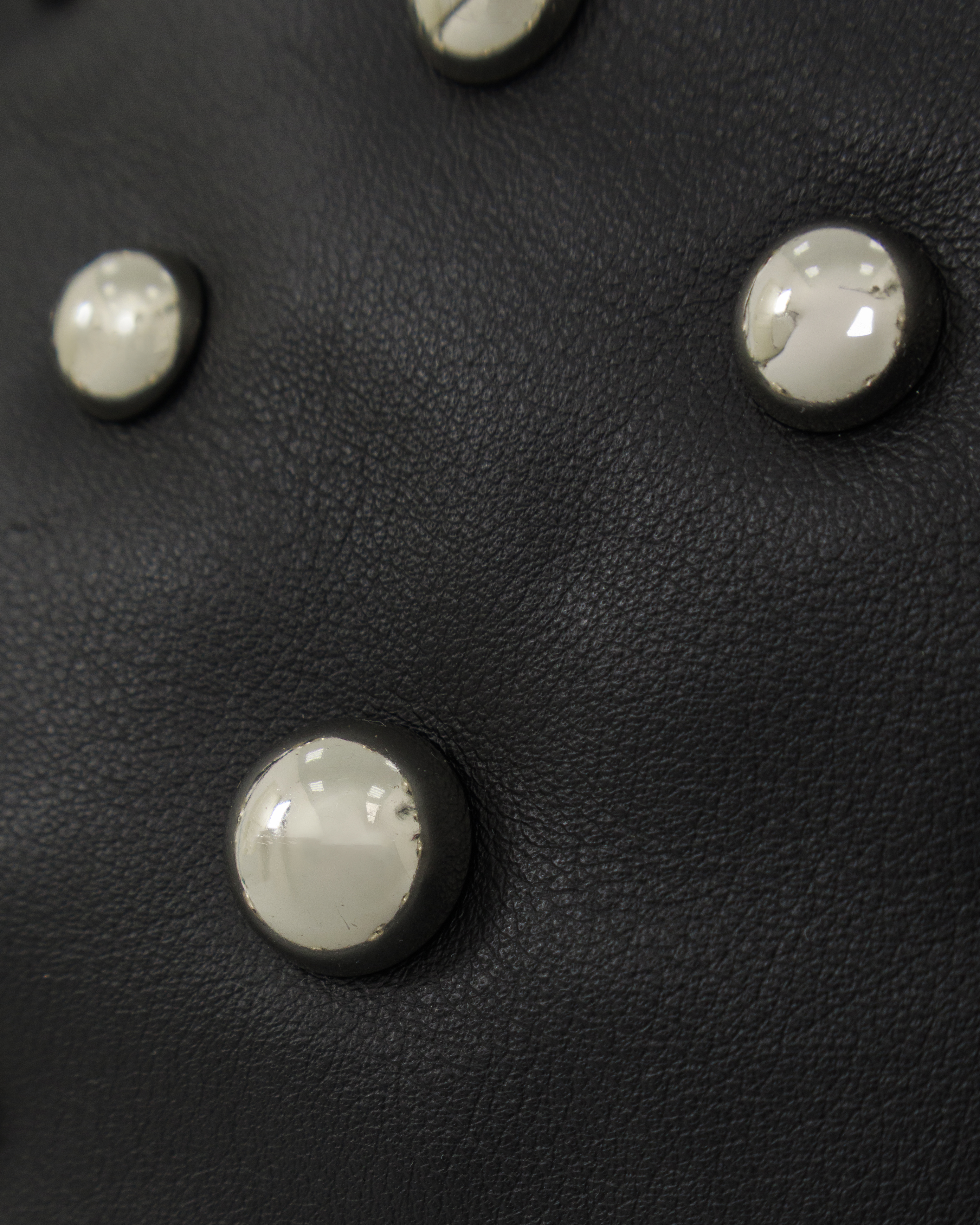 Эта сумка — выразительный образец современной элегантности с элементами дерзкого шика. Выполненная из мягкой черной кожи, она придает образу утонченность и смелость. Главный акцент сумки — металлические заклепки, которые придают ей динамику и неповторимый характер. Такое сочетание создает эффект рок-н-ролльного шика, делая сумку ярким элементом гардероба. Элегантный плавный силуэт дополняется оригинальным узлом на ручке, что добавляет изделию нотку непринужденной креативности. Металлические элементы фурнитуры, включая надежную молнию, усиливают общее впечатление роскоши и стильной вычурности. Эта модель идеально подойдет для смелых личностей, которые не боятся выделяться и создавать яркие образы, сочетая в себе функциональность и модные тенденции.