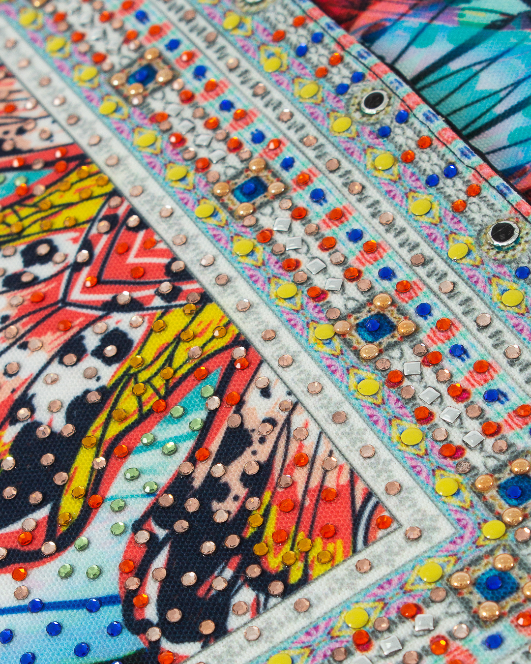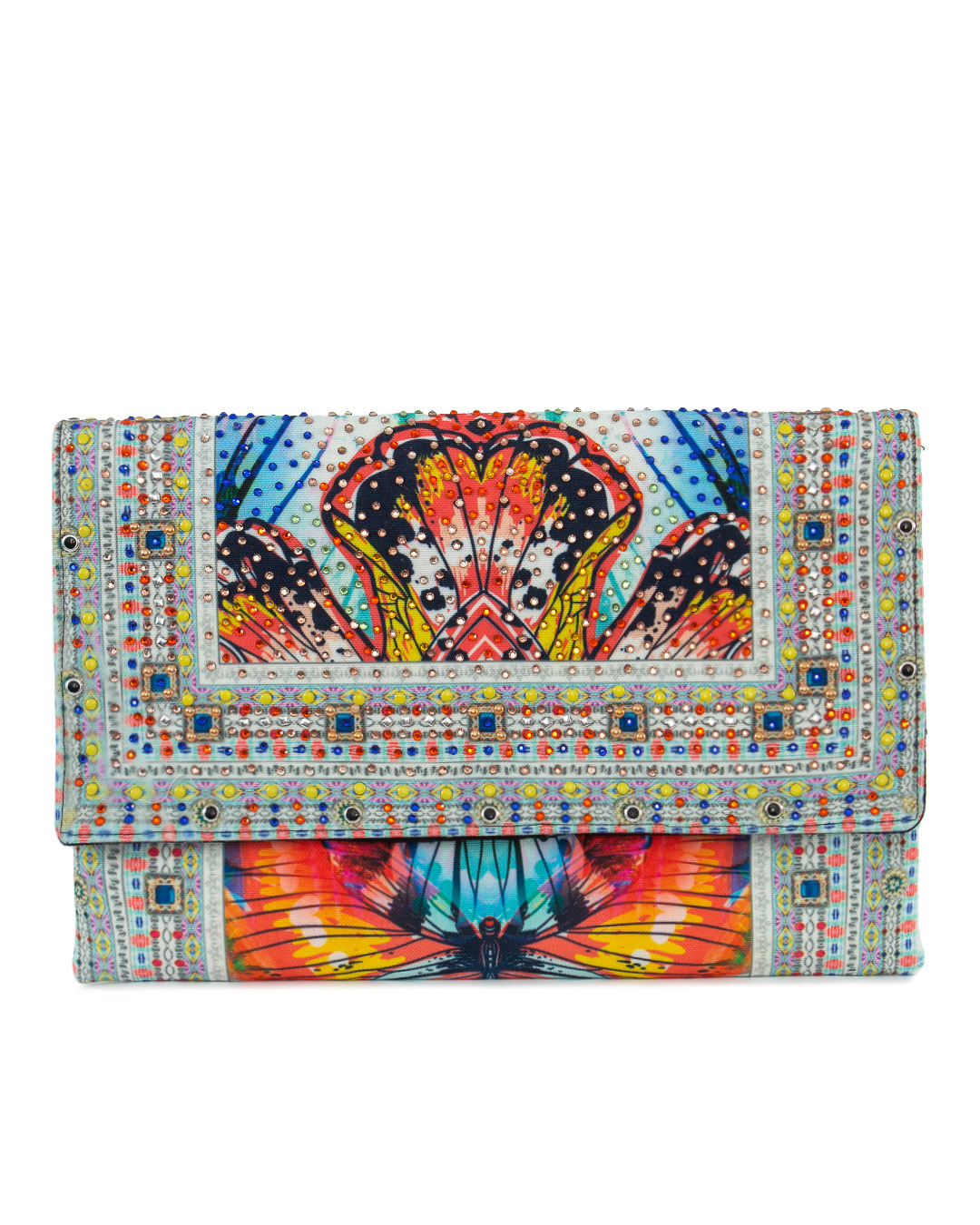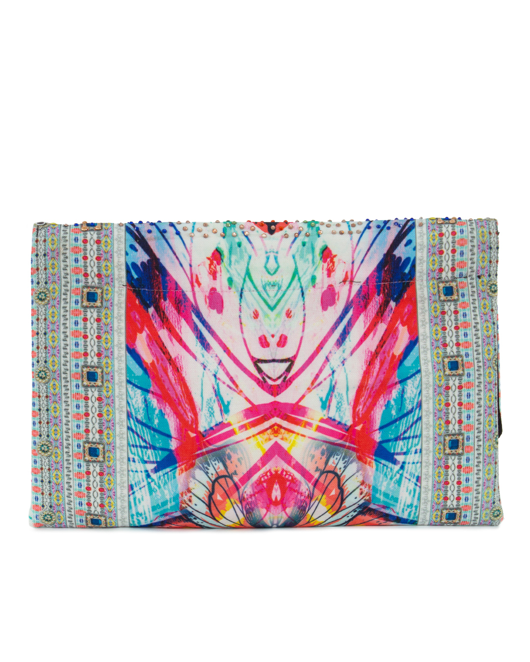 Клатч INOA из яркого текстиля с принтом. Аксессуар с основным отделом и застежкой на клапан, расшит кристаллами.