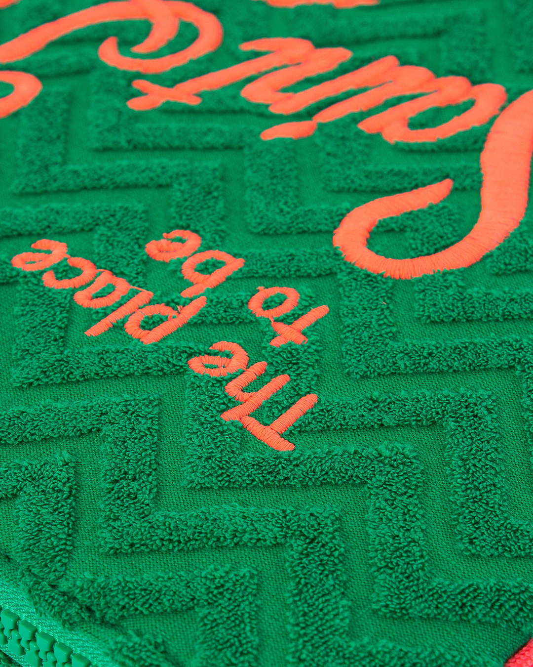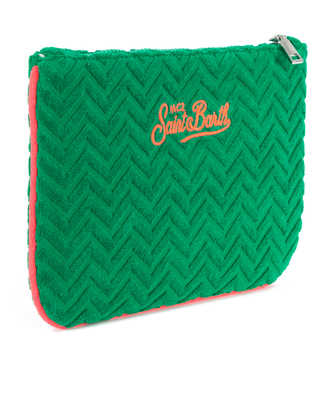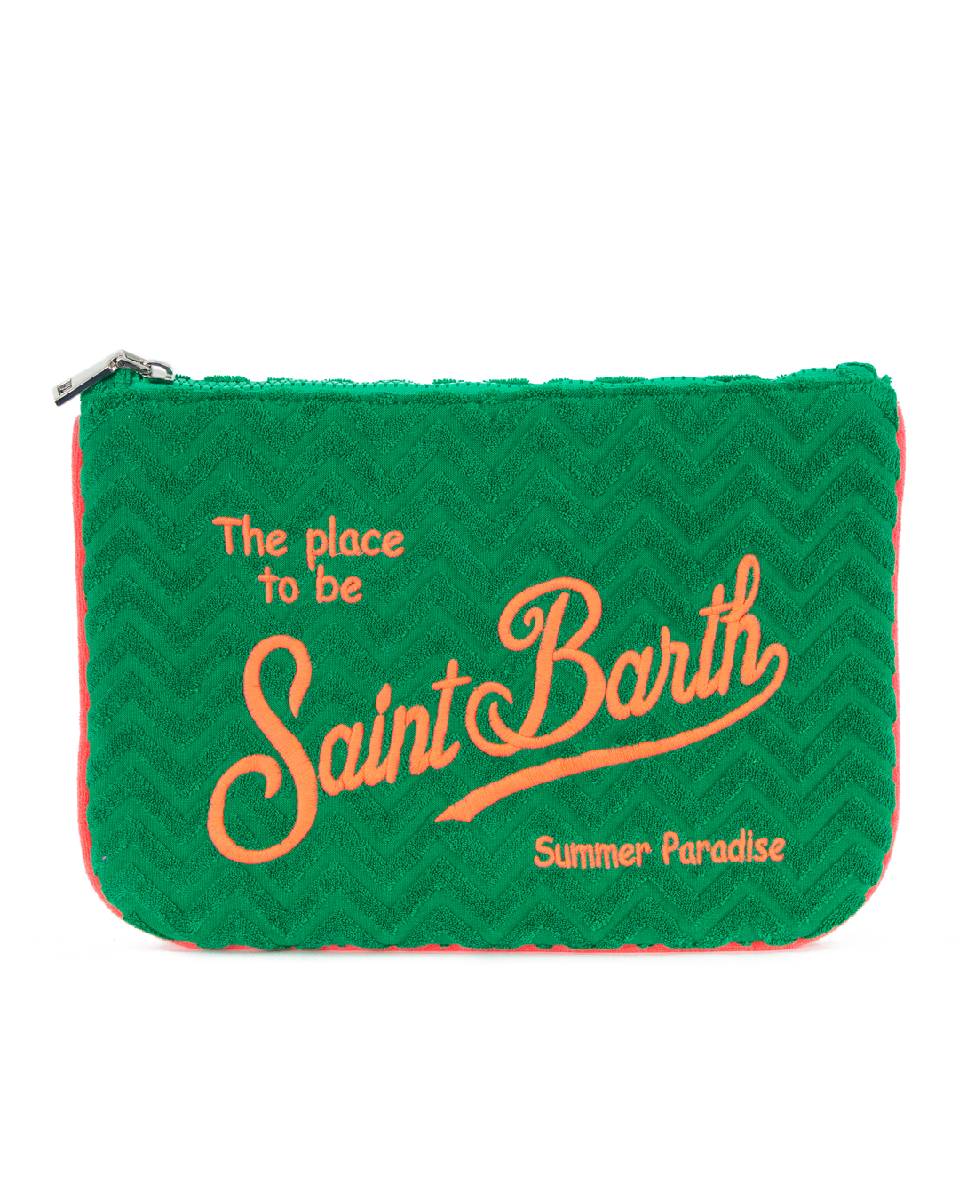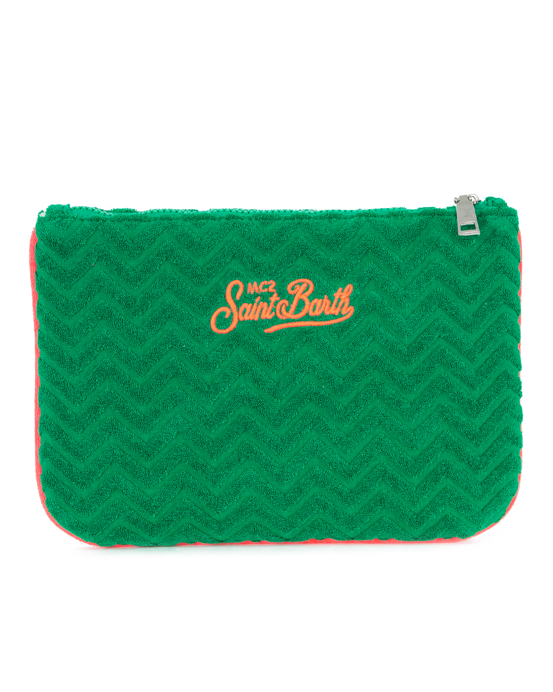 Клатч MC2 Saint Barth выполнен из махрового материала с вышивкой логотипа бренда. Изделие плоской формы с застежкой на молнию.