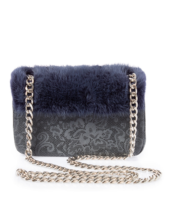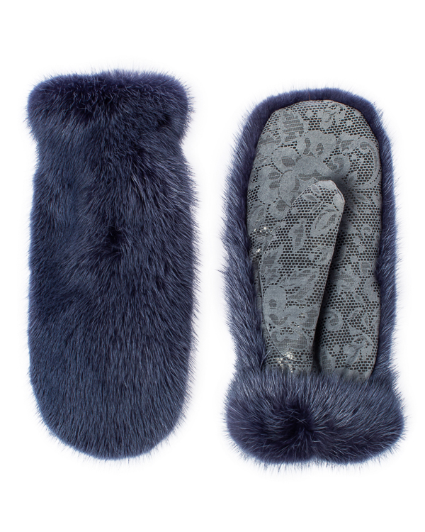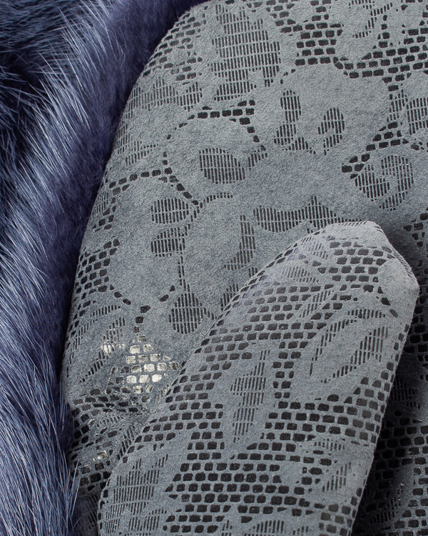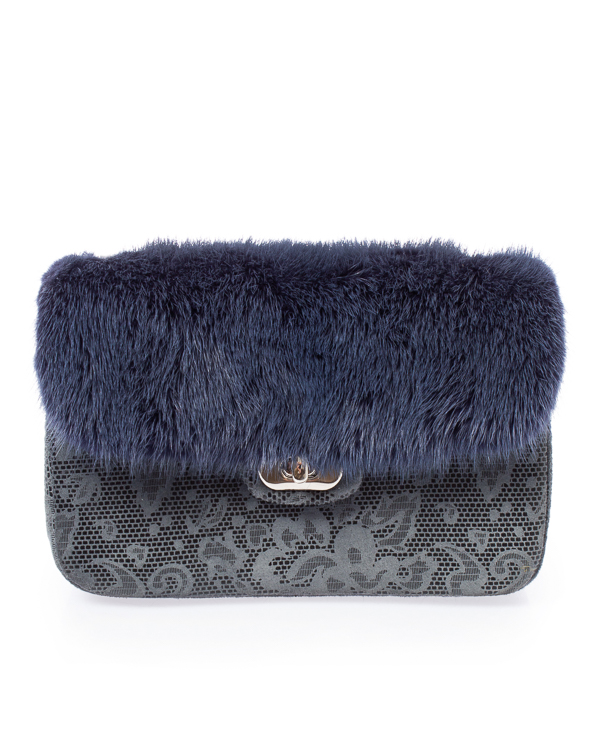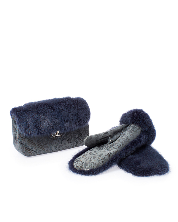 Комплект из сумки и варежек из кожи с узорной фактурой и отделкой натуральным мехом норки.