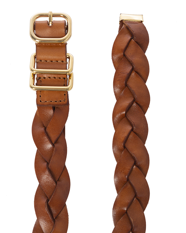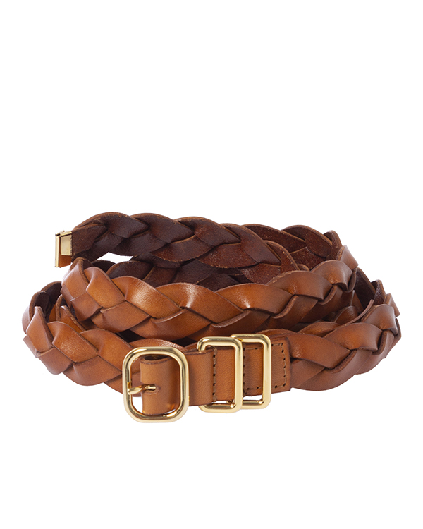 Тонкий ремень из плетеной натуральной кожи оттенка camel. Аксессуар на талию дополнен застежкой на металлическую пряжку с покрытием золотого оттенка.
