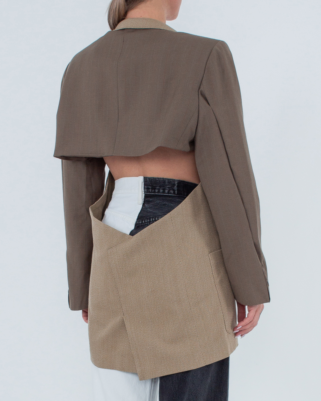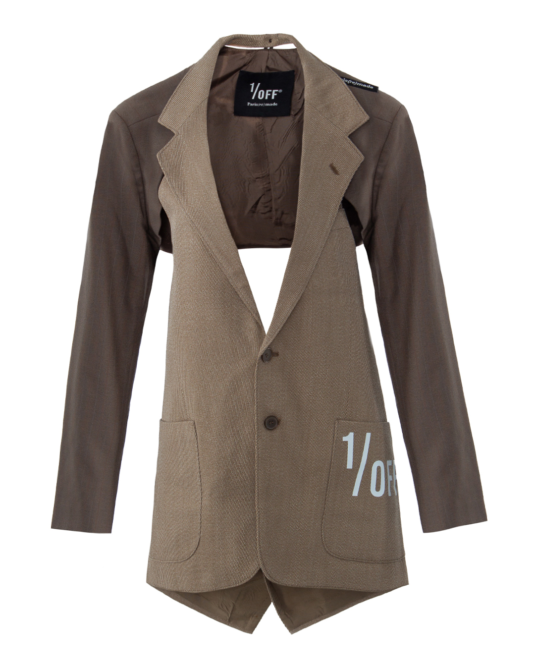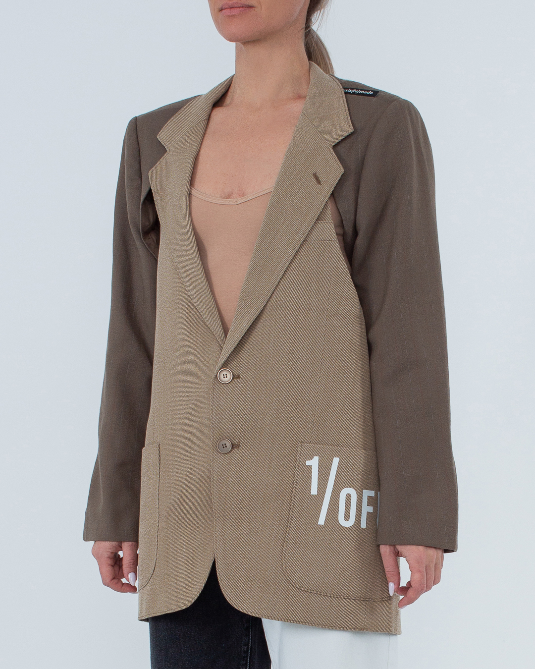 Рестайлинговый жакет 1/OFF дизайнеры сшили из шерсти. Изделие с застежкой на пуговицы дополнено карманами и вырезом на спине.