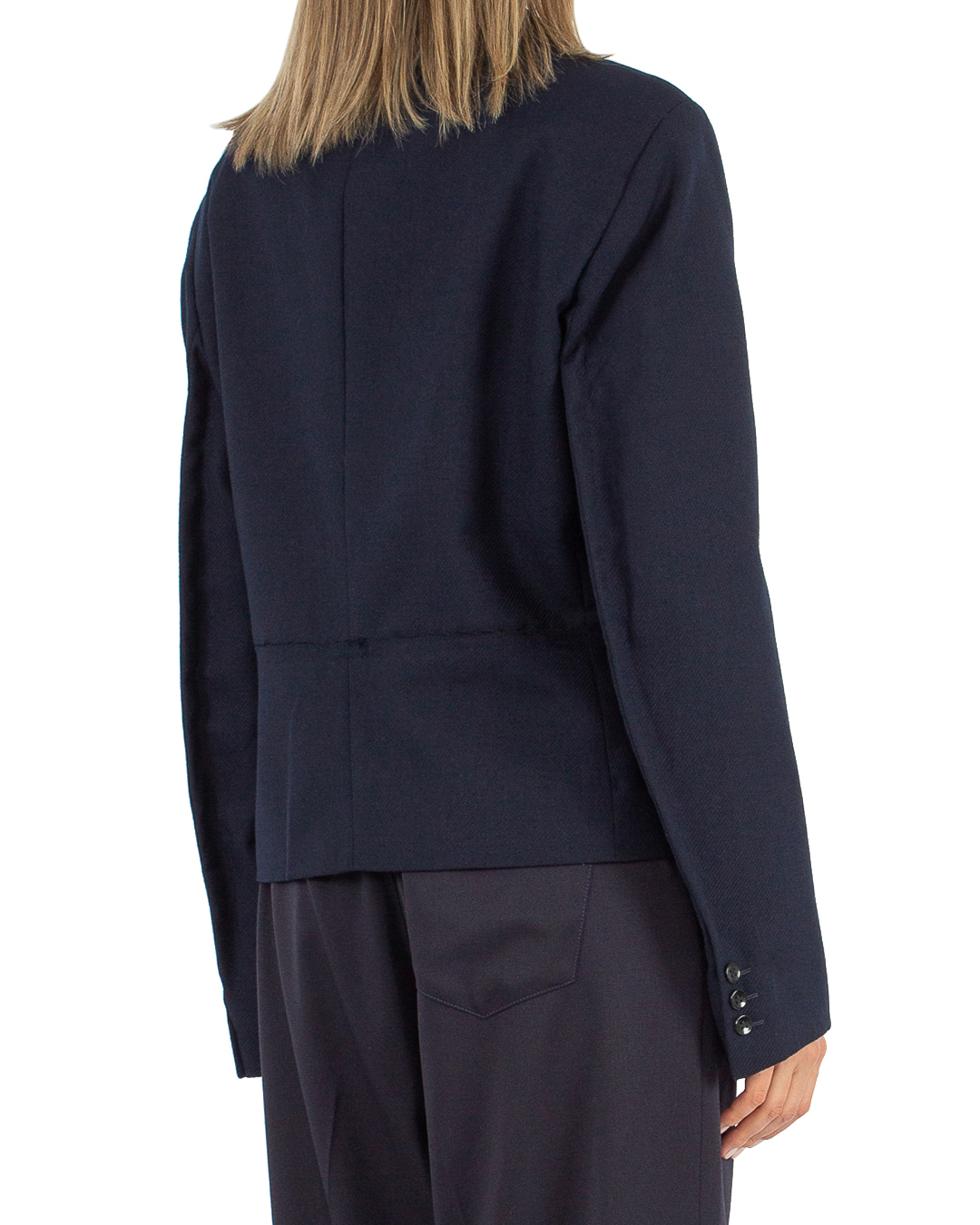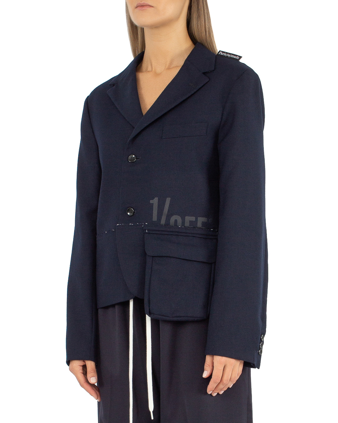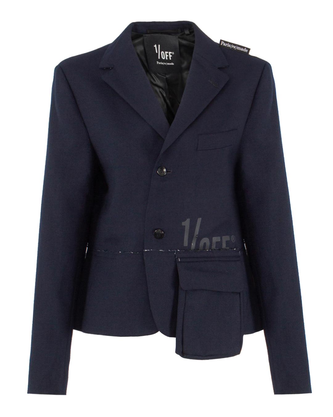 Рестайлинговый жакет 1/OFF сшили из костюмного материала и дополнили логотипом бренда. Модель с застежкой на пуговицы и пришитым карманом с клапаном.