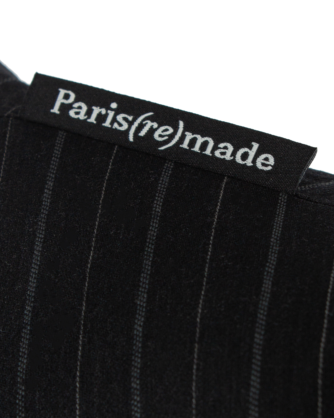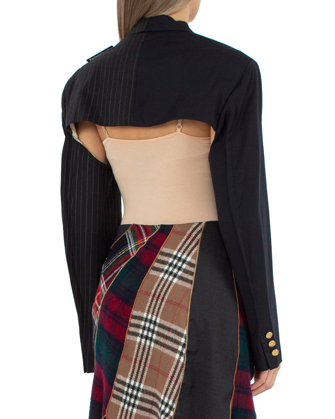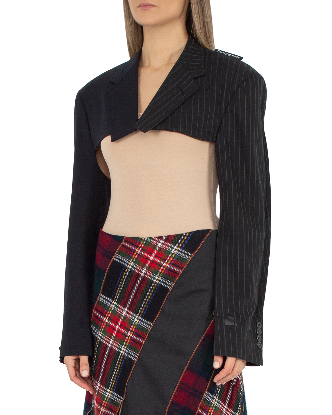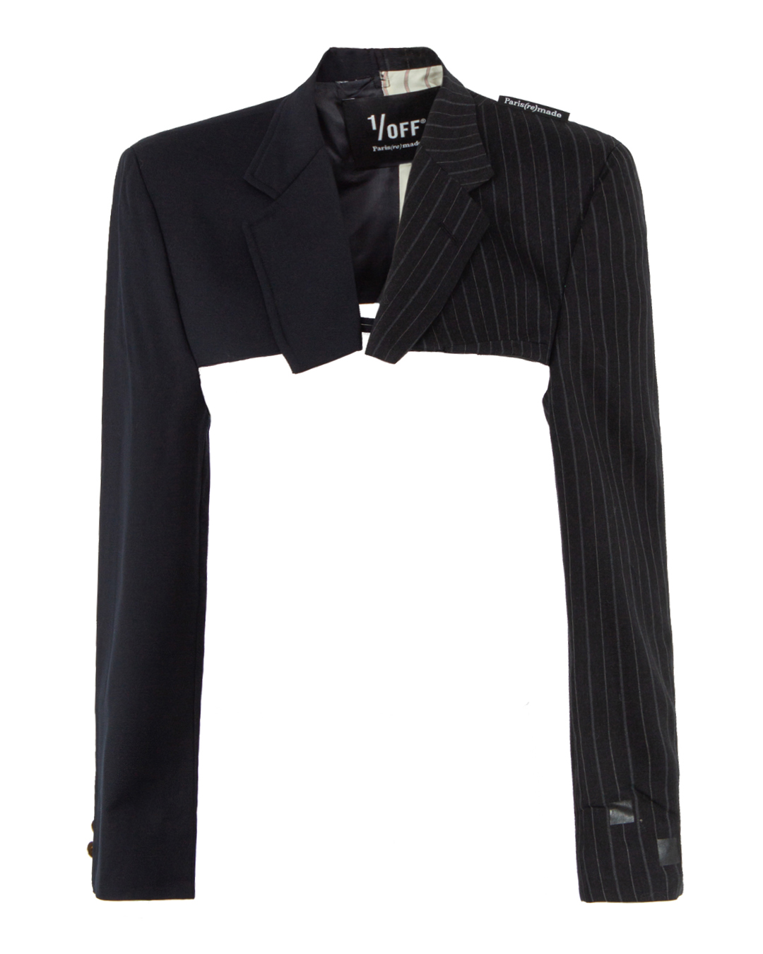 Рестайлинговый жакет 1/OFF сшили из костюмного материала с добавлением шерсти в полоску. Модель укороченного силуэта с отложным воротником и длинными широкими рукавами.