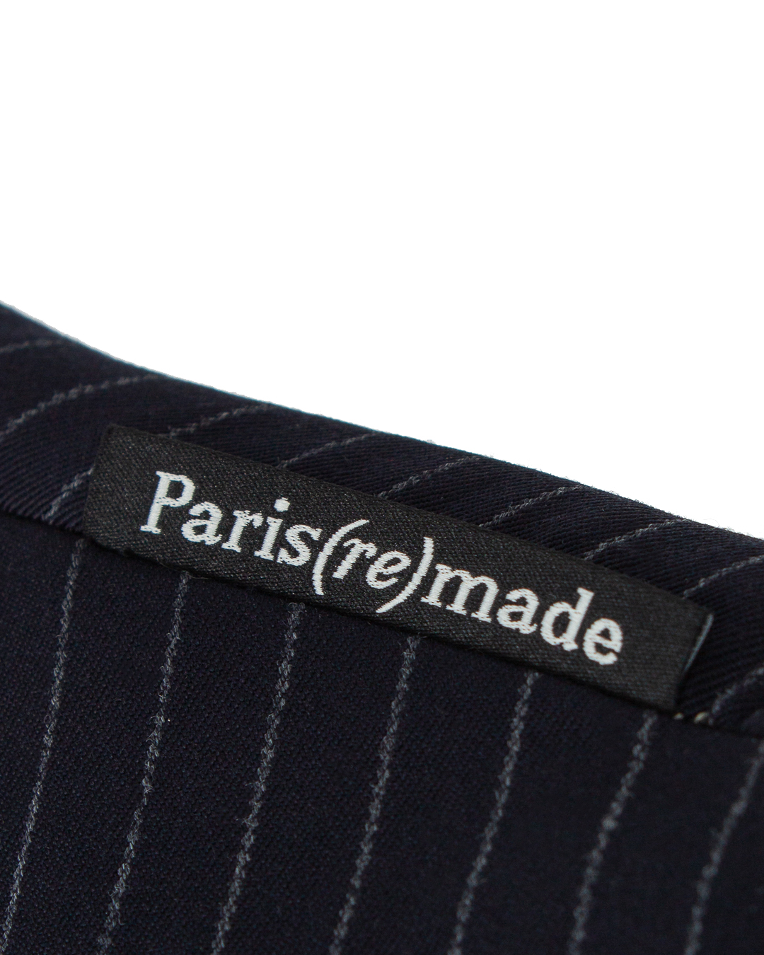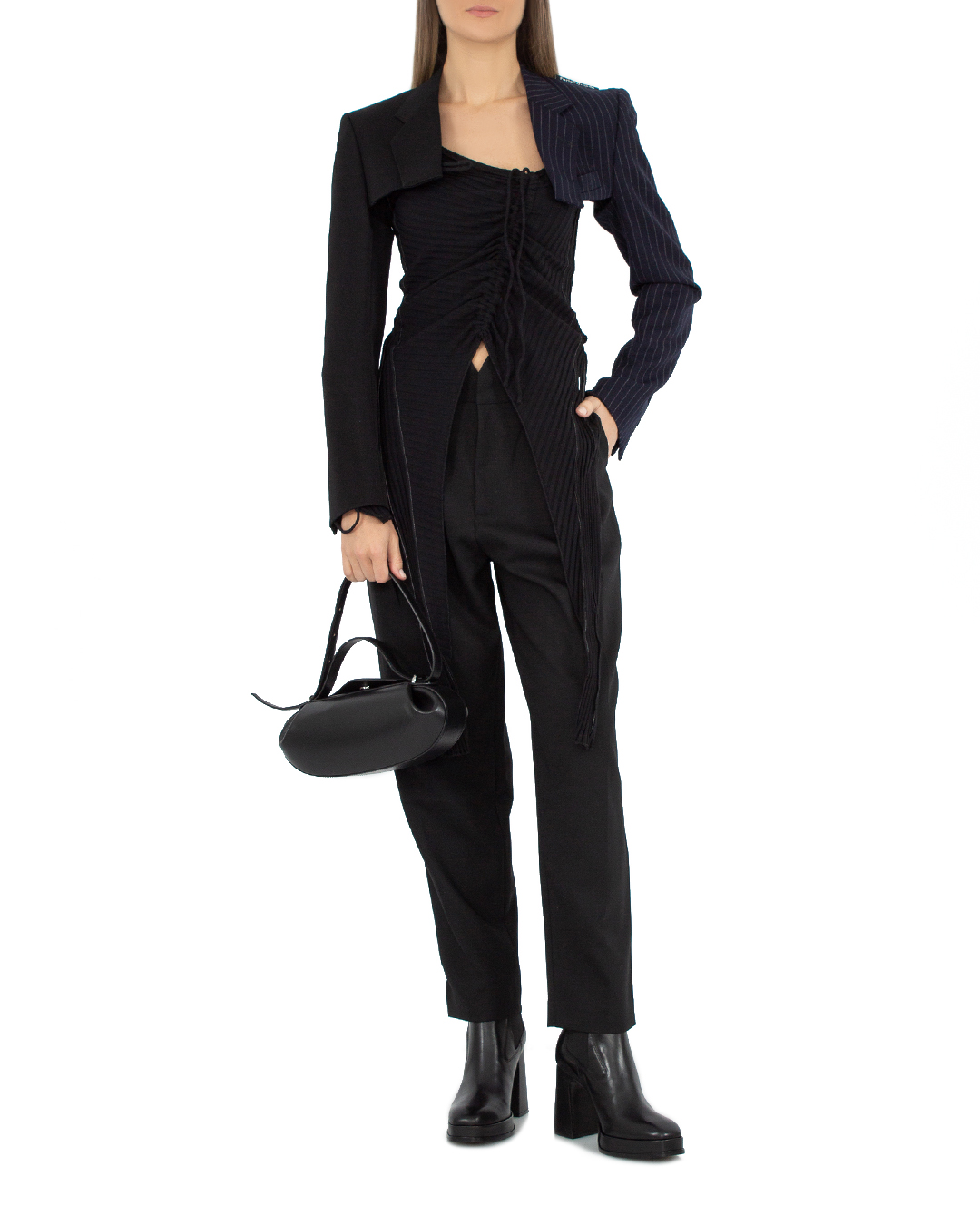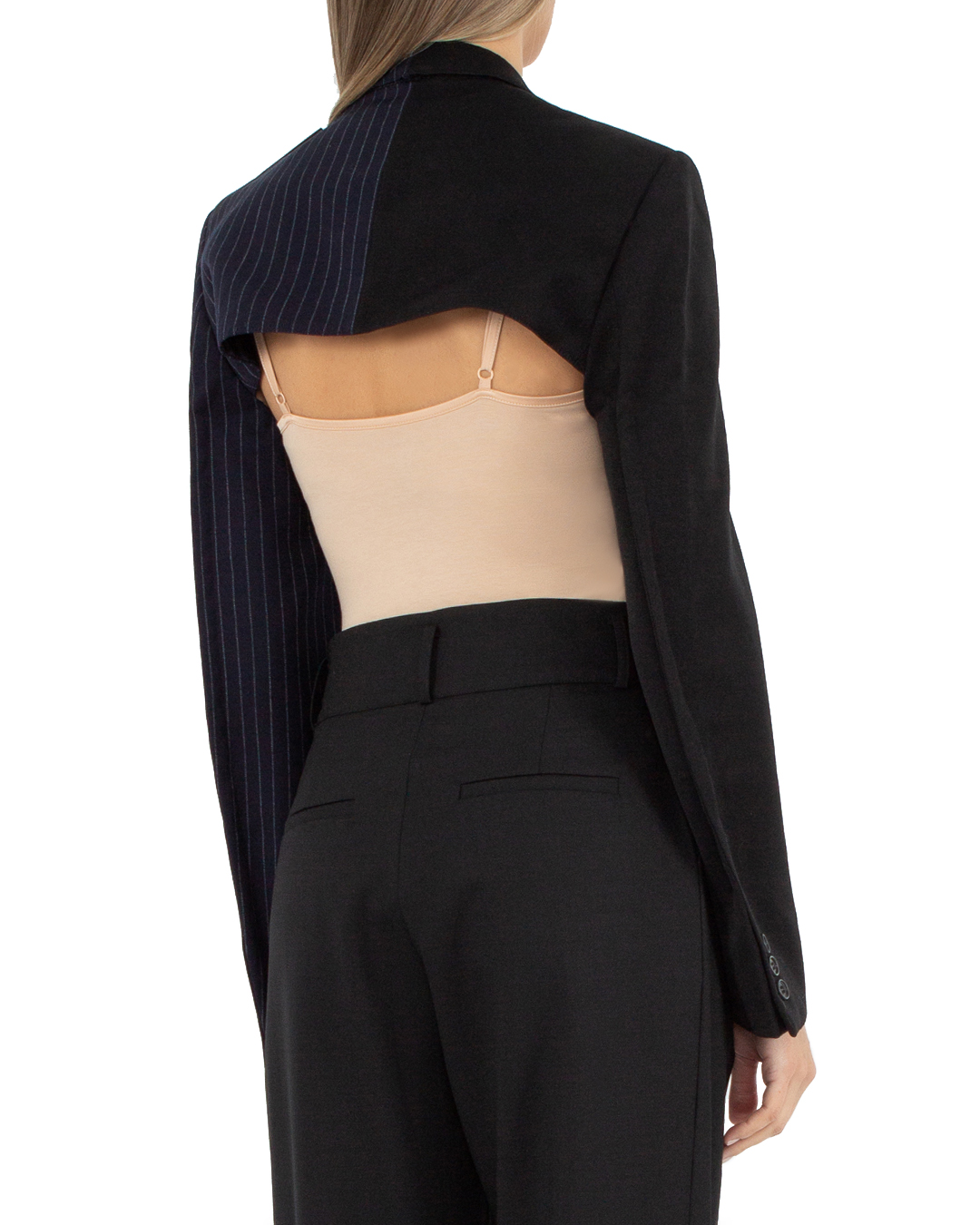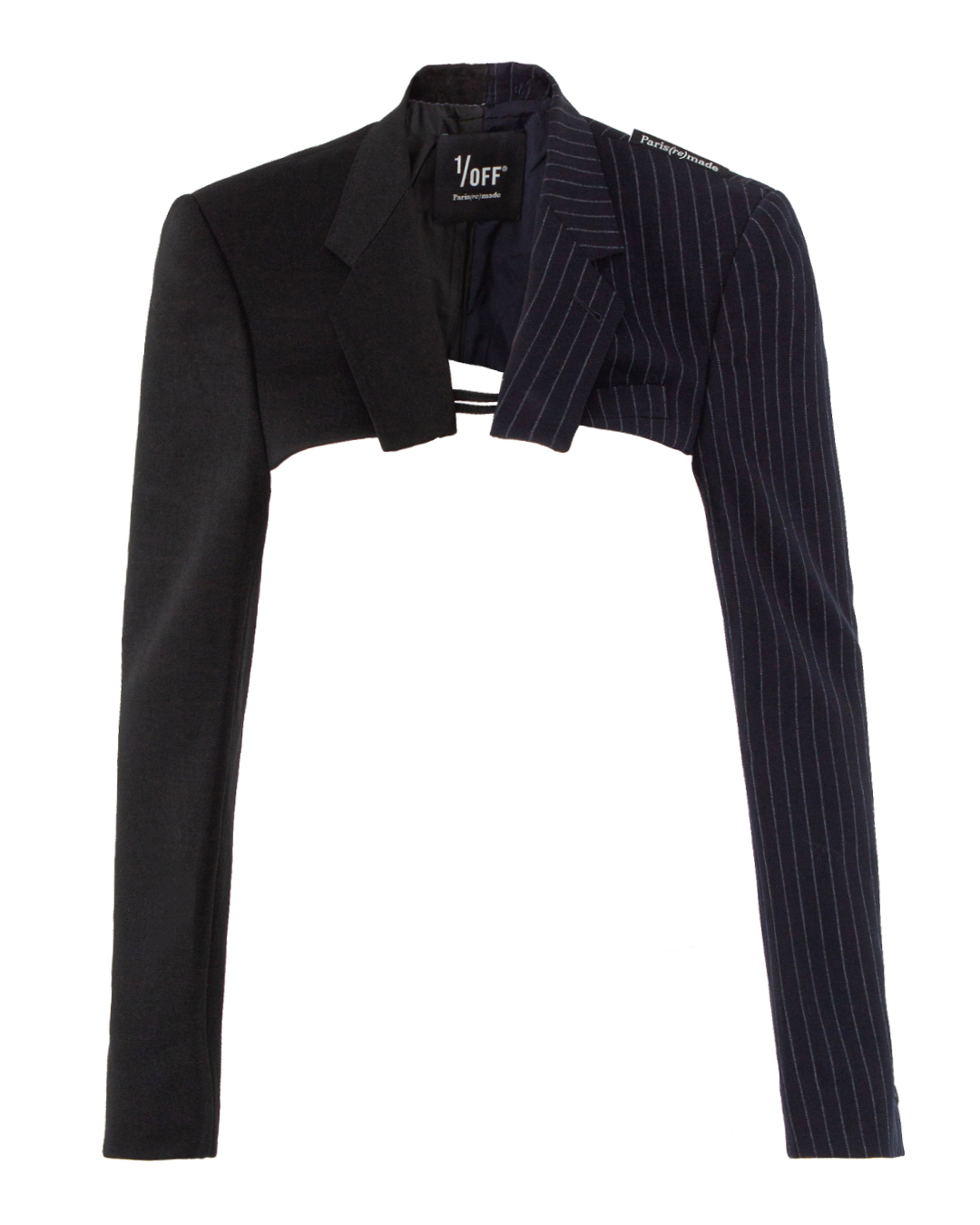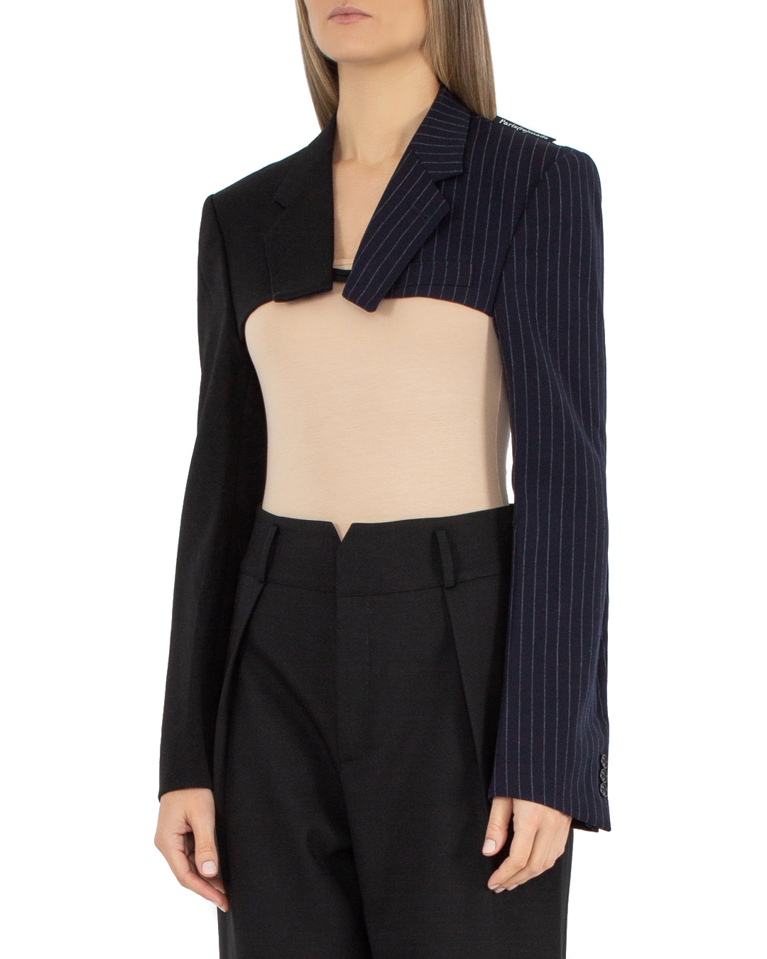 Рестайлинговый жакет 1/OFF сшили из костюмного материала с добавлением шерсти в полоску. Модель укороченного силуэта с отложным воротником и длинными широкими рукавами.