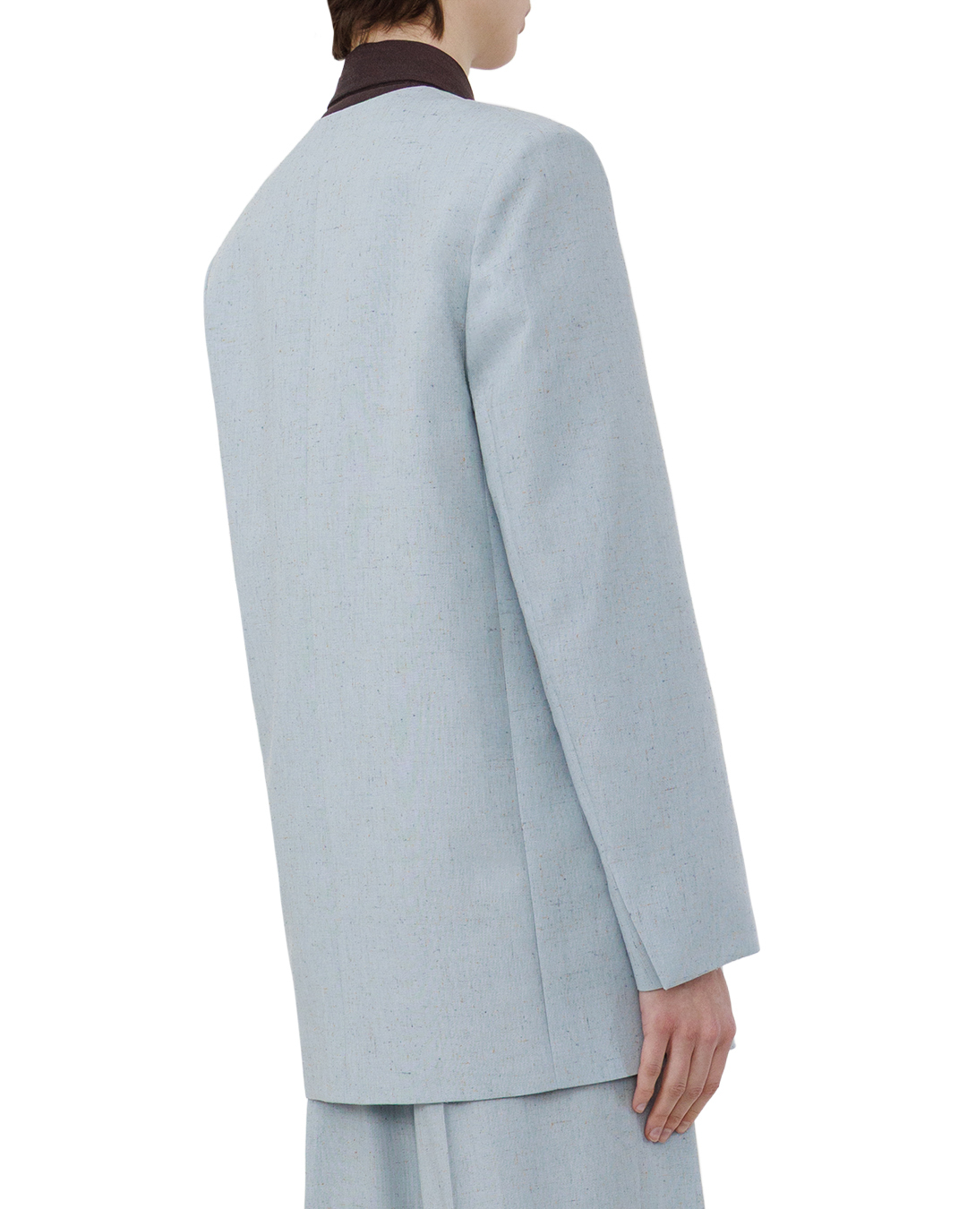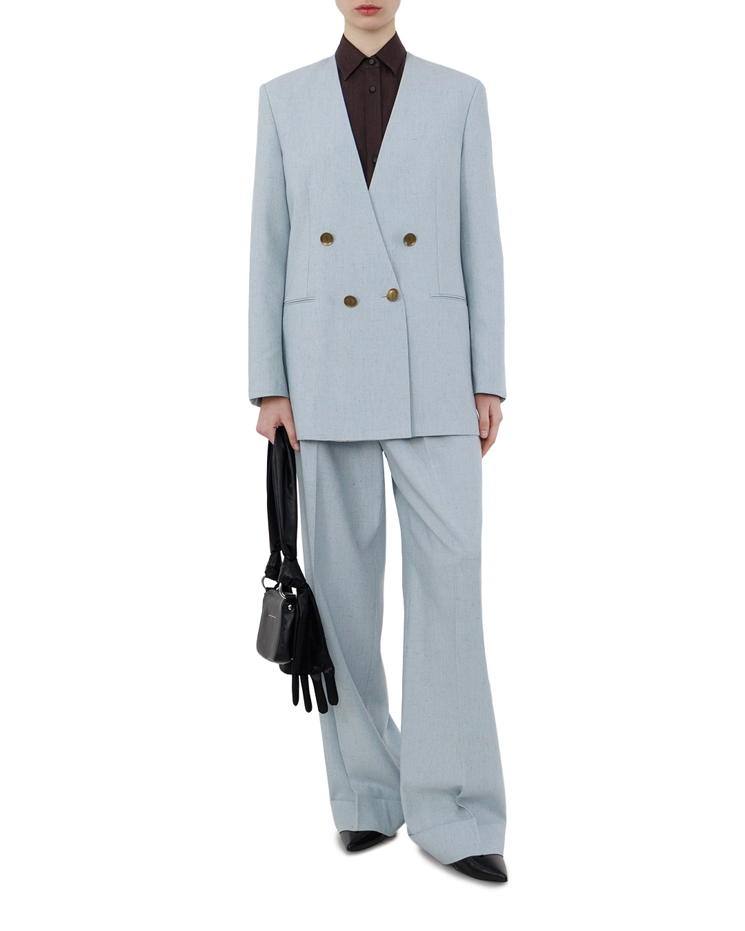 Этот двубортный жакет — олицетворение утончённой классики. Пастельно-голубой оттенок придаёт вещи лёгкую воздушность, не утрачивая строгости силуэта. Двубортная застёжка с крупными пуговицами золотистого оттенка создаёт выразительный акцент, подчёркивая лаконичность кроя. Лацканы выполнены с чёткой геометрией, добавляя образу собранности. Карманы с лаконичными отстрочками органично вписаны в общий дизайн, не перегружая композицию. Внутренняя подкладка с изысканным узором служит изящным завершением, придавая вещи нотку аристократизма. Структурированные плечи и чётко очерченные линии силуэта делают жакет выразительным элементом гардероба, способным трансформировать любой образ в элегантный и продуманный.