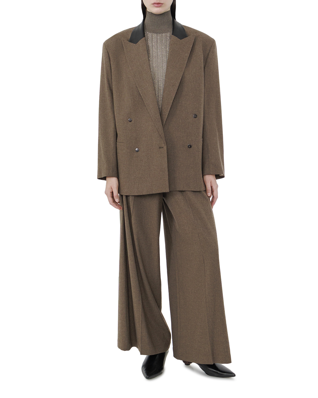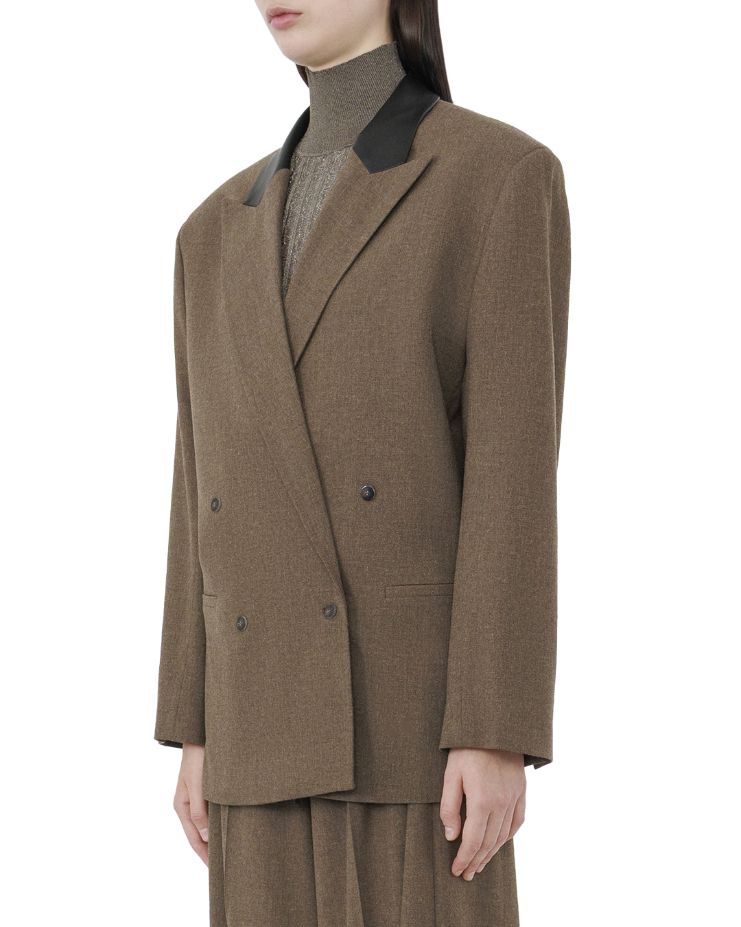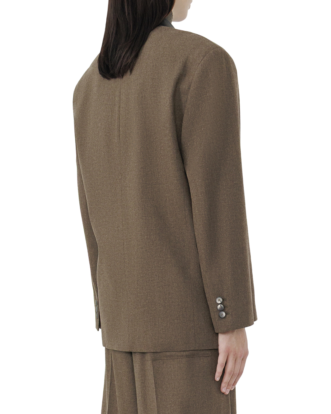 Этот жакет — великолепное сочетание классики и современности, выполненный в благородном коричневом оттенке, который добавляет теплоту и изысканность. Его двубортный дизайн придаёт структуру и объём, идеально подходящие для создания статусного образа. Контрастный воротник из гладкой кожи чёрного цвета добавляет нотку дерзости и современного шика, создавая интересный акцент, который сразу привлекает внимание. Лацканы выполнены в классическом стиле, подчёркивая элегантность и строгость формы. Пиджак имеет слегка расширенные плечи, что создаёт эффектный силуэт и добавляет уверенности. Прямой крой обеспечивает комфорт и баланс между строгой и свободной посадкой. Декоративные пуговицы контрастного цвета добавляют дополнительный элемент стиля, подчёркивая роскошь и внимание к деталям. Этот жакет станет идеальной основой для множества образов, будь то офисный наряд с классическими брюками или более креативный ансамбль в сочетании с джинсами. Он воплощает в себе гармонию традиции и инновации, делая стильный акцент на индивидуальности владельца.