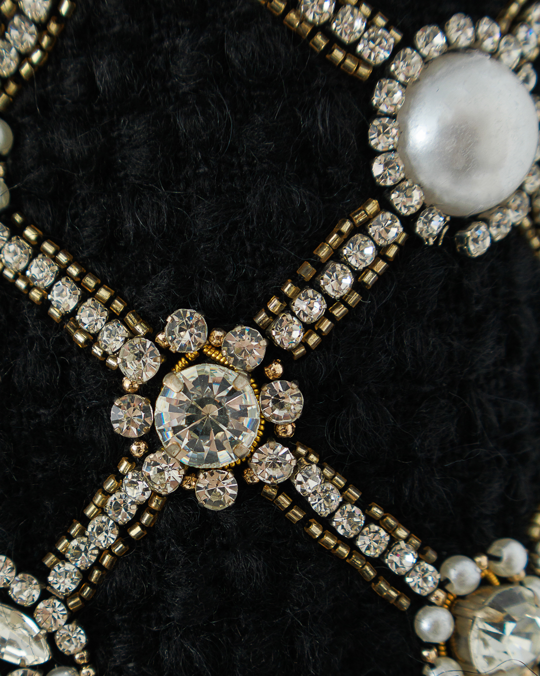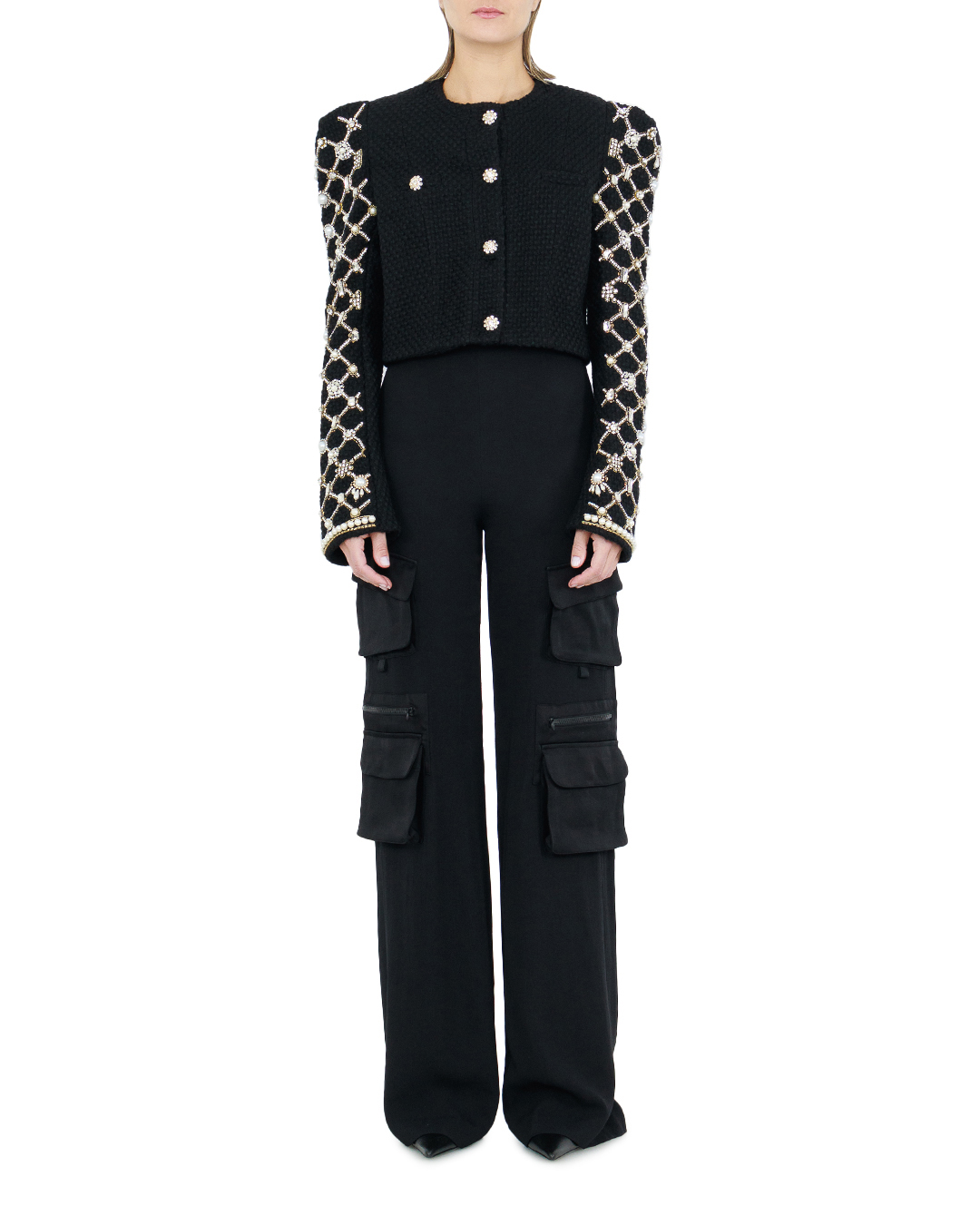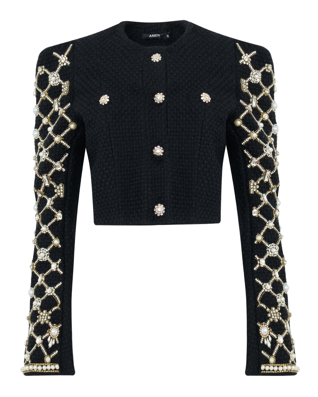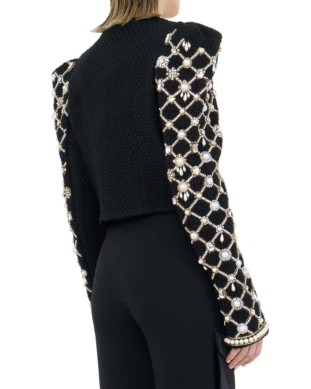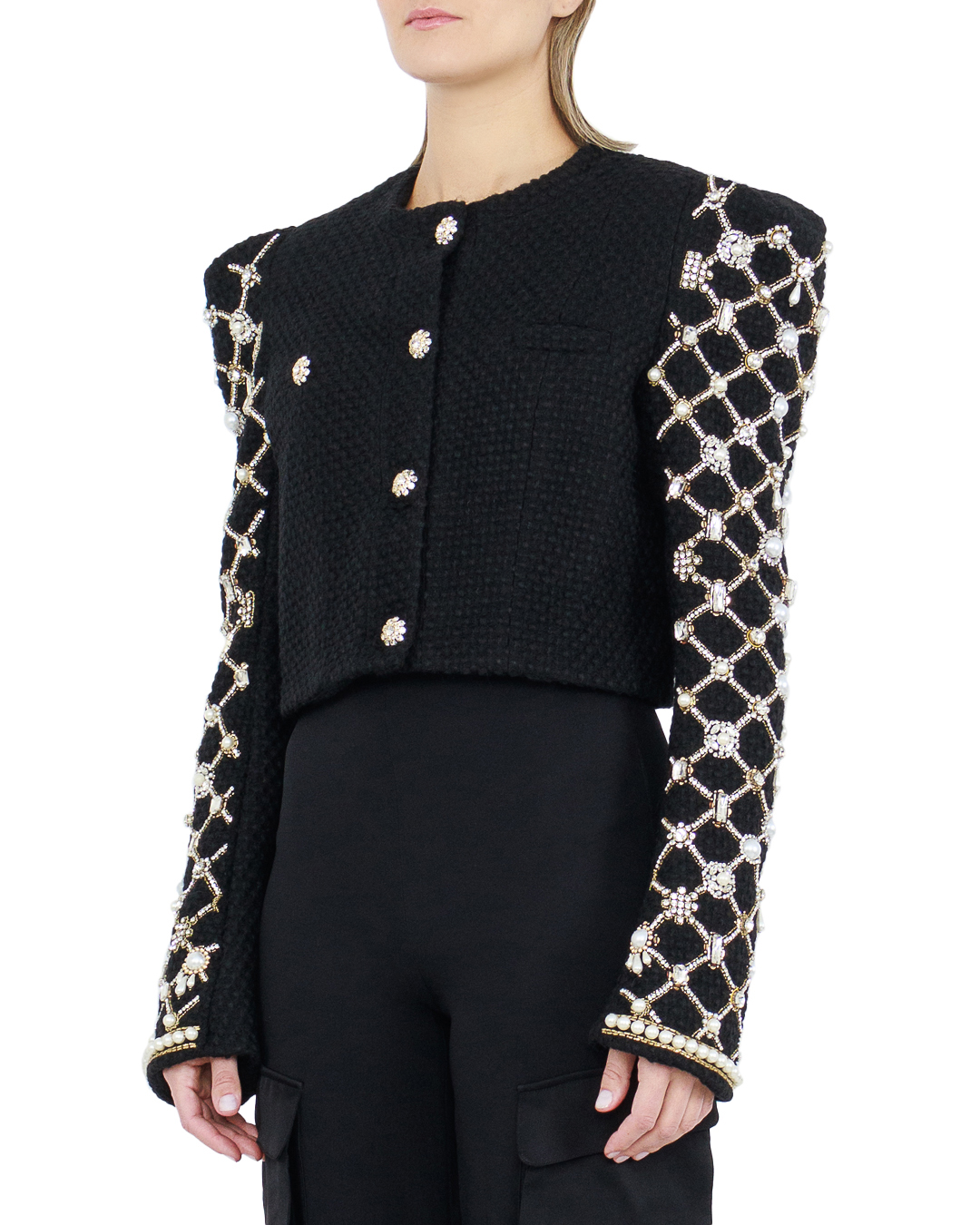 Укороченный жакет с акцентными плечами. Рукава расшиты стразами, жемчужными бусинами и бисером. Пуговицы в золотом цвете дополняют модель. Стильная находка для заметных образов.