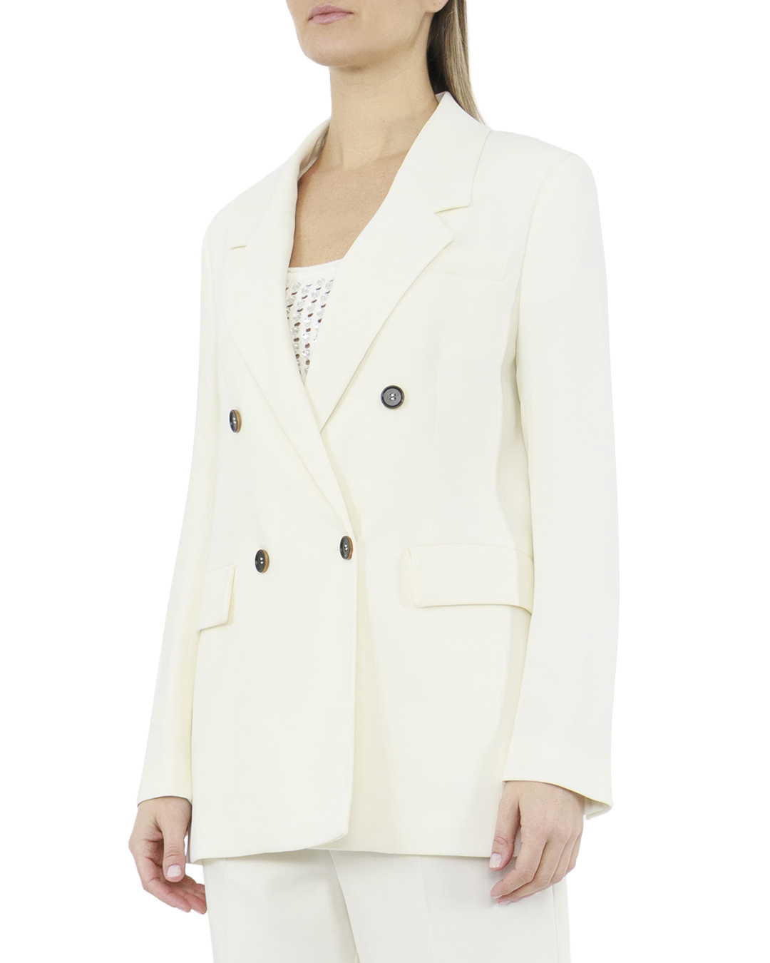Двубортный жакет от BEATRICE — это олицетворение утонченной элегантности и безупречного мастерства. Выполненный из плотной ткани, он привносит в образ утонченность и стиль, идеально подходящий для современной леди с изысканным вкусом. Структурированный крой жакета создаёт чёткий и выразительный силуэт, подчеркивающий линию плеч и придающий образу уверенность. Широкие лацканы добавляют классический акцент, гармонируя с общим эстетическим настроением. Контрастные пуговицы располагаются в два ряда, придавая жакету динамичную симметрию. Наличие практичных клапанных карманов обеспечивает функциональность без утраты изящества. Слегка удлинённый фасон позволяет легко сочетаться как с классическими брюками, так и с юбками, создавая многогранные образы от делового до вечернего. Этот жакет — незаменимый элемент гардероба, символизирующий элегантность с современным подходом.