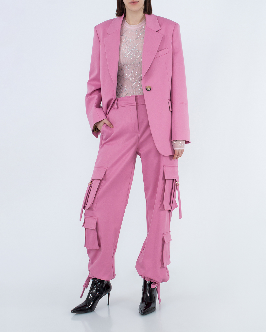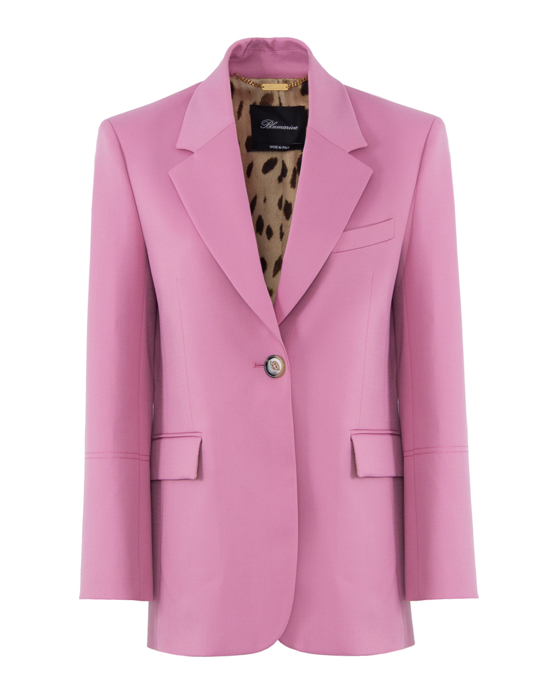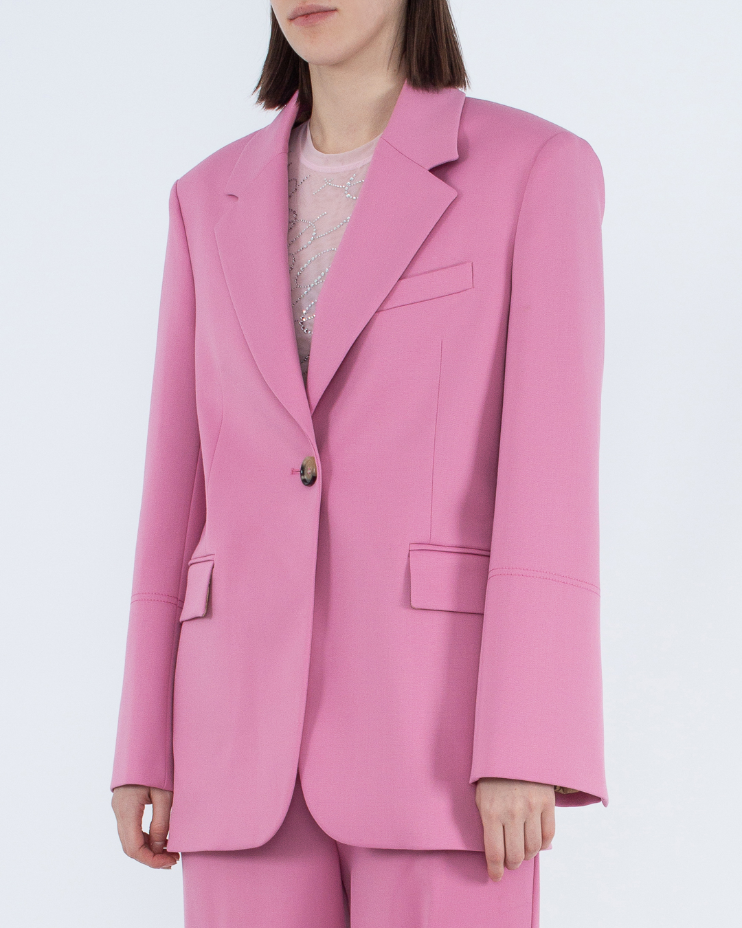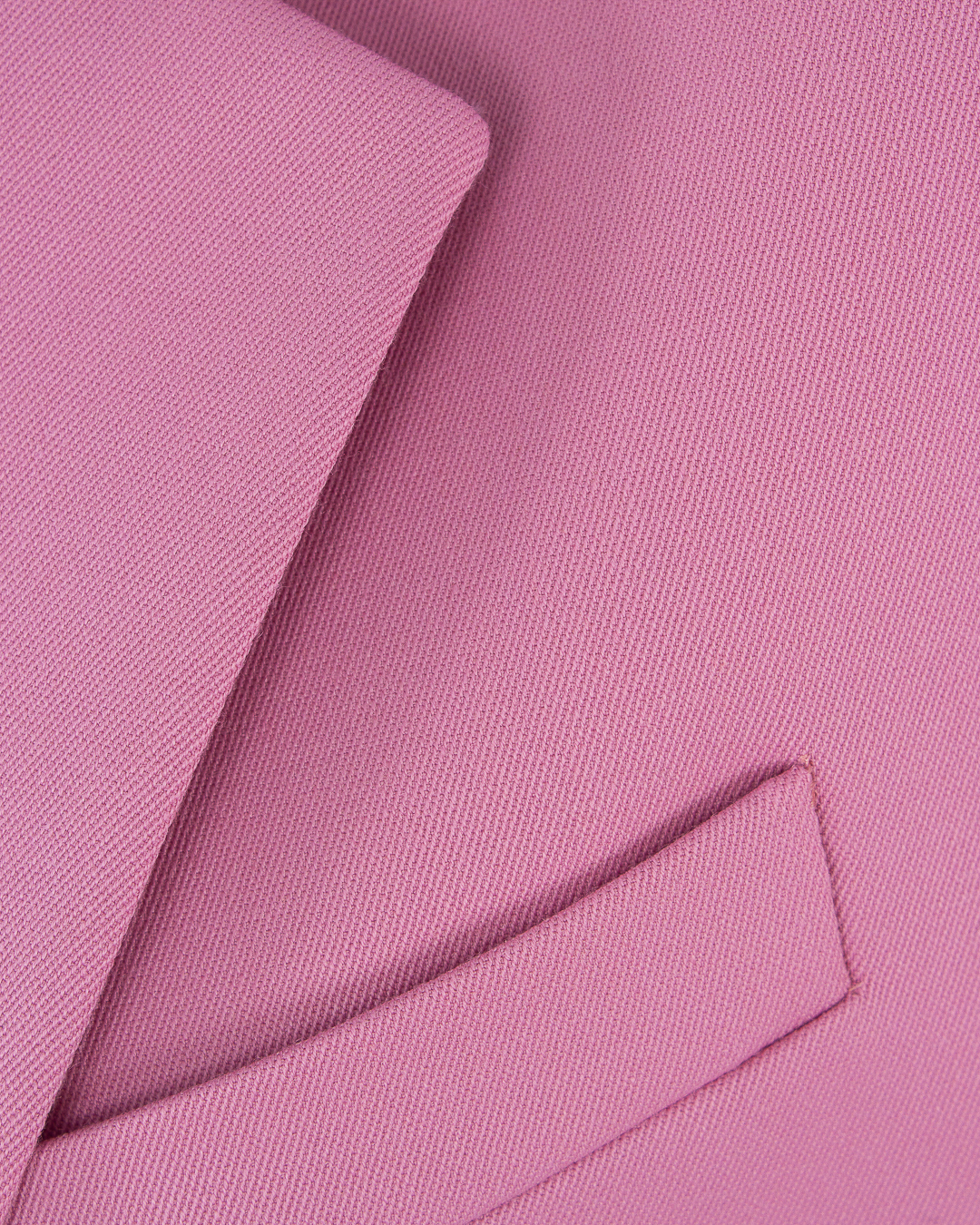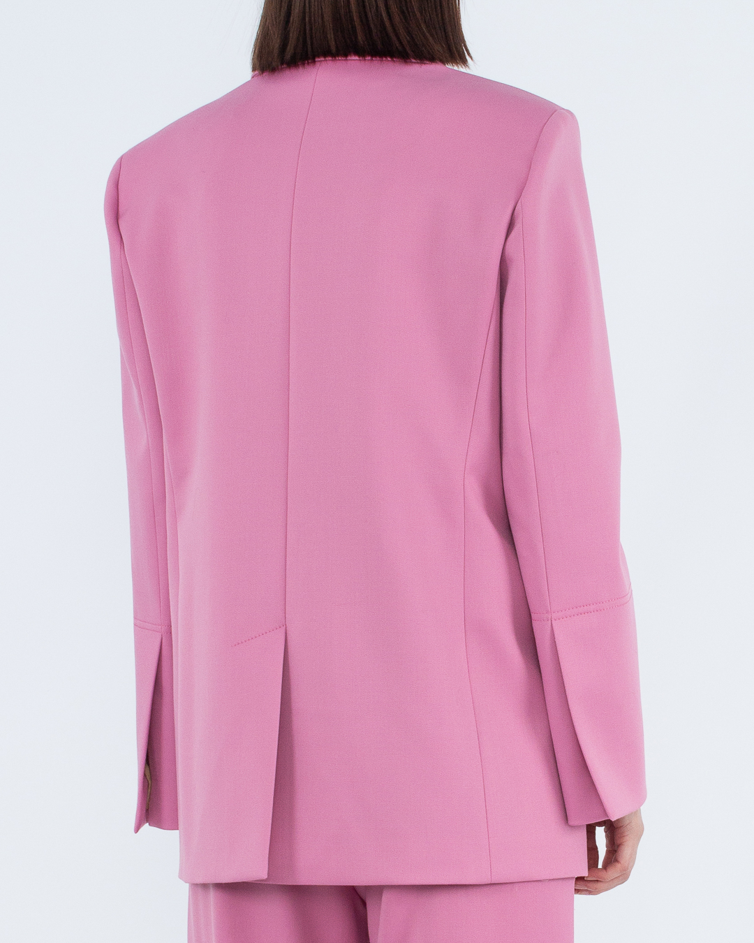 Жакет из полушерстяного костюмного материала розового оттенка. Прямой классический крой дополнен застежкой на пуговицы и отложным воротником.