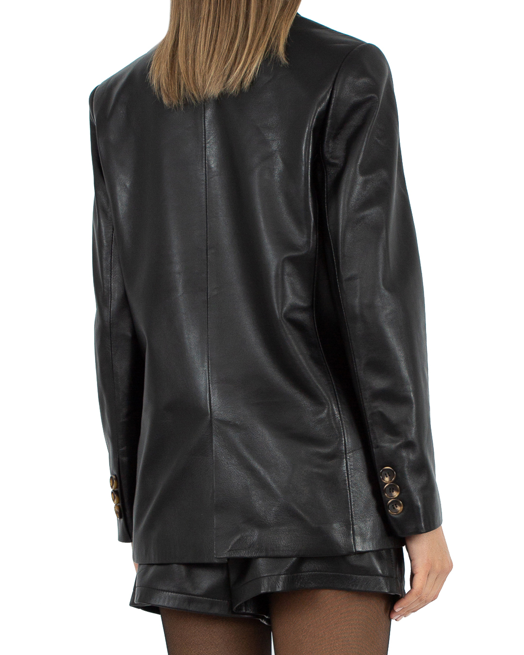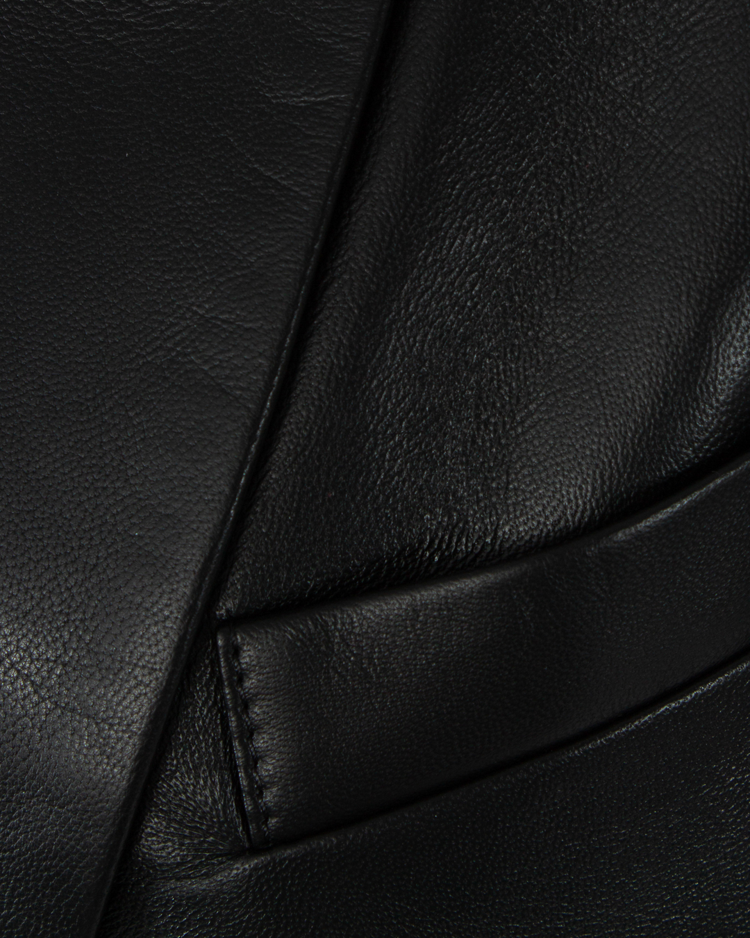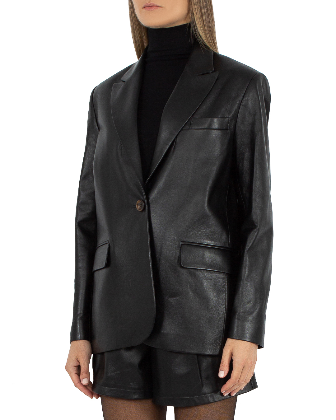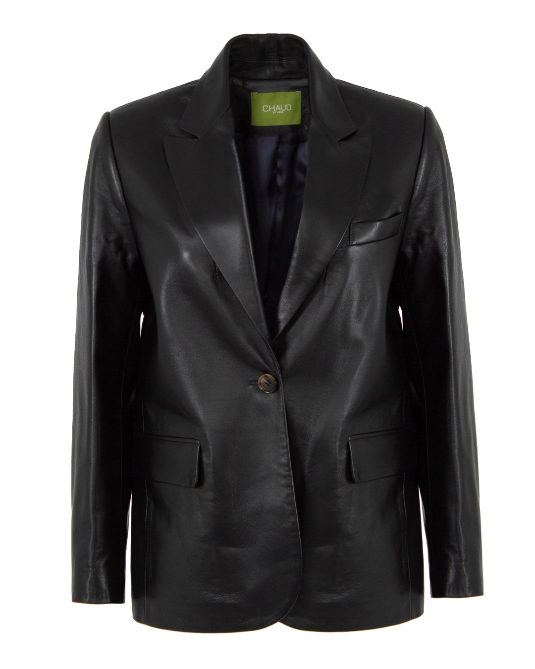 Кожаный жакет CHAUD STUDIO в черном цвете, на подкладке. Модель прямого силуэта с застежкой на пуговицу дополнена двумя карманами с клапанами.
