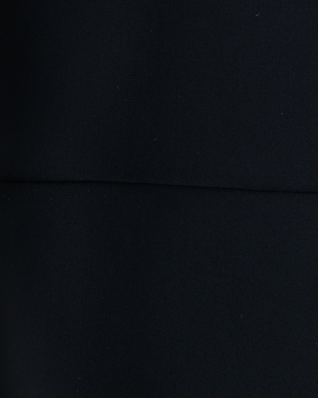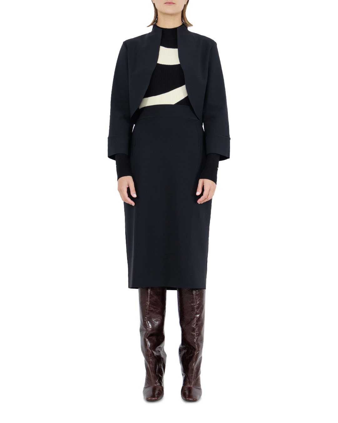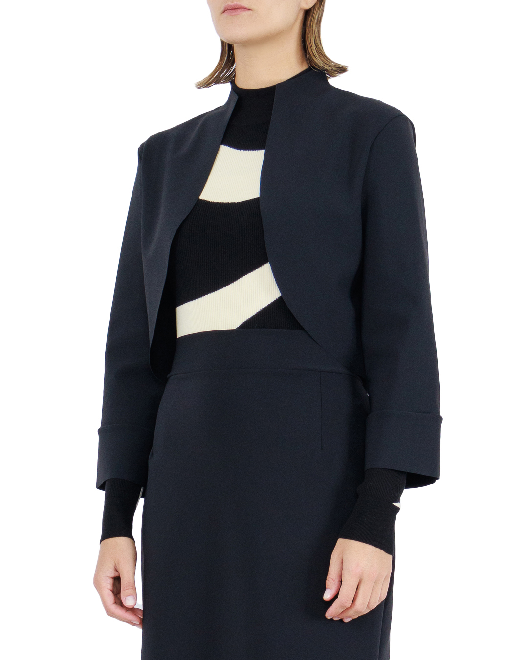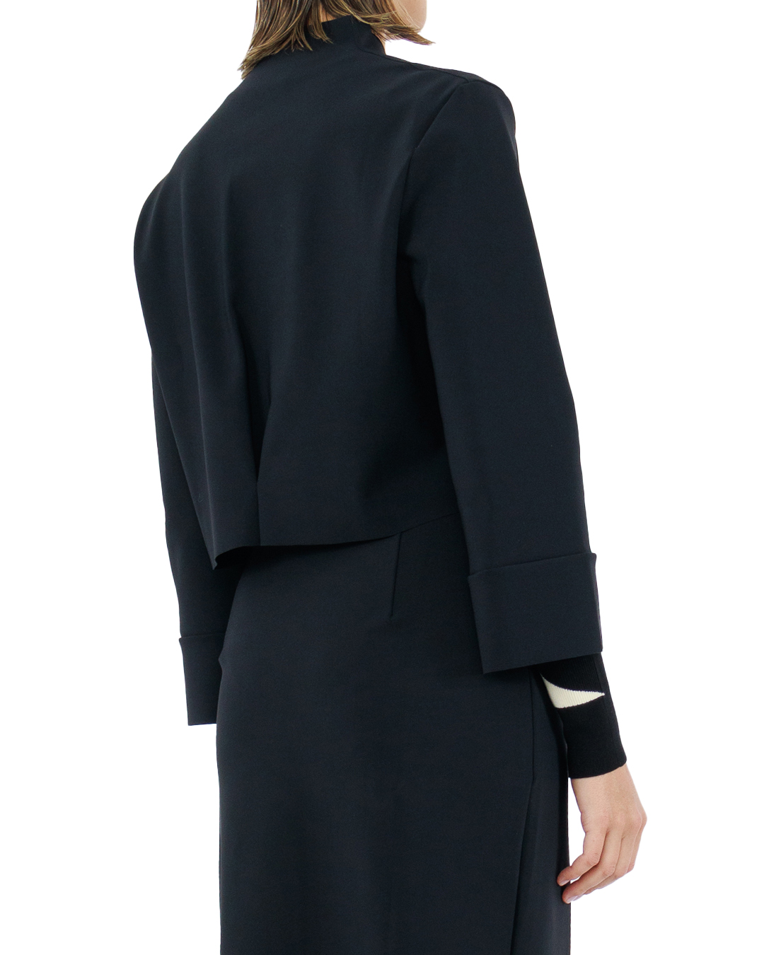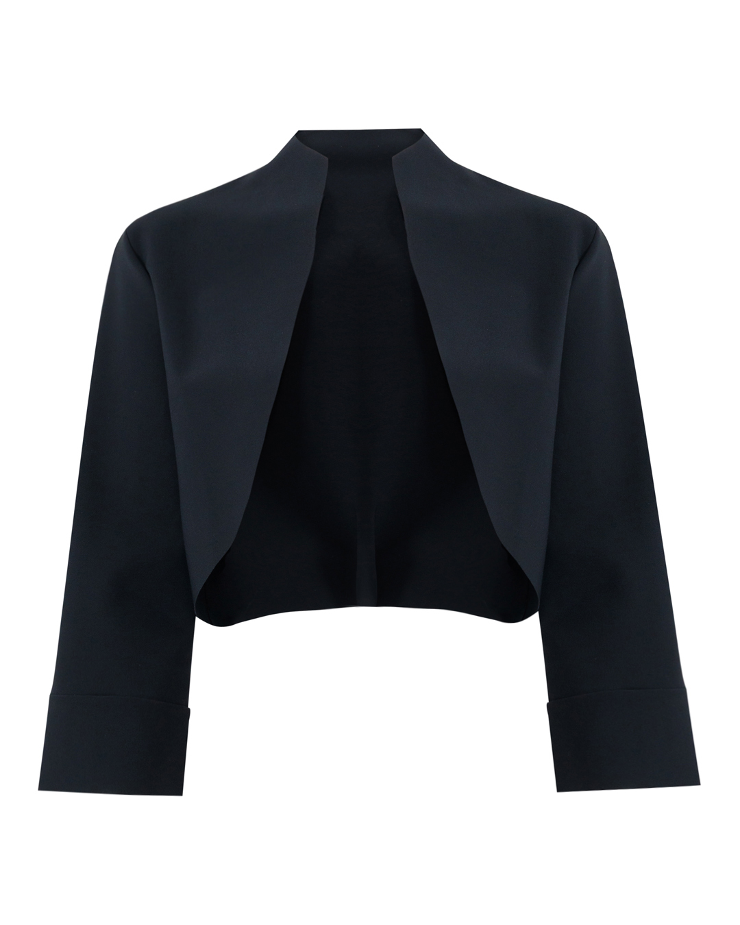 Укороченный жакет изготовили из эластичной ткани. Модель с воротником стойкой и рукавом ¾. Спинка изделия с защипами, низ бортов закруглен.